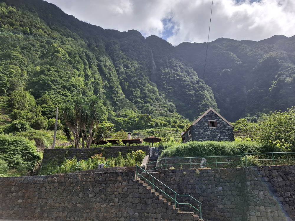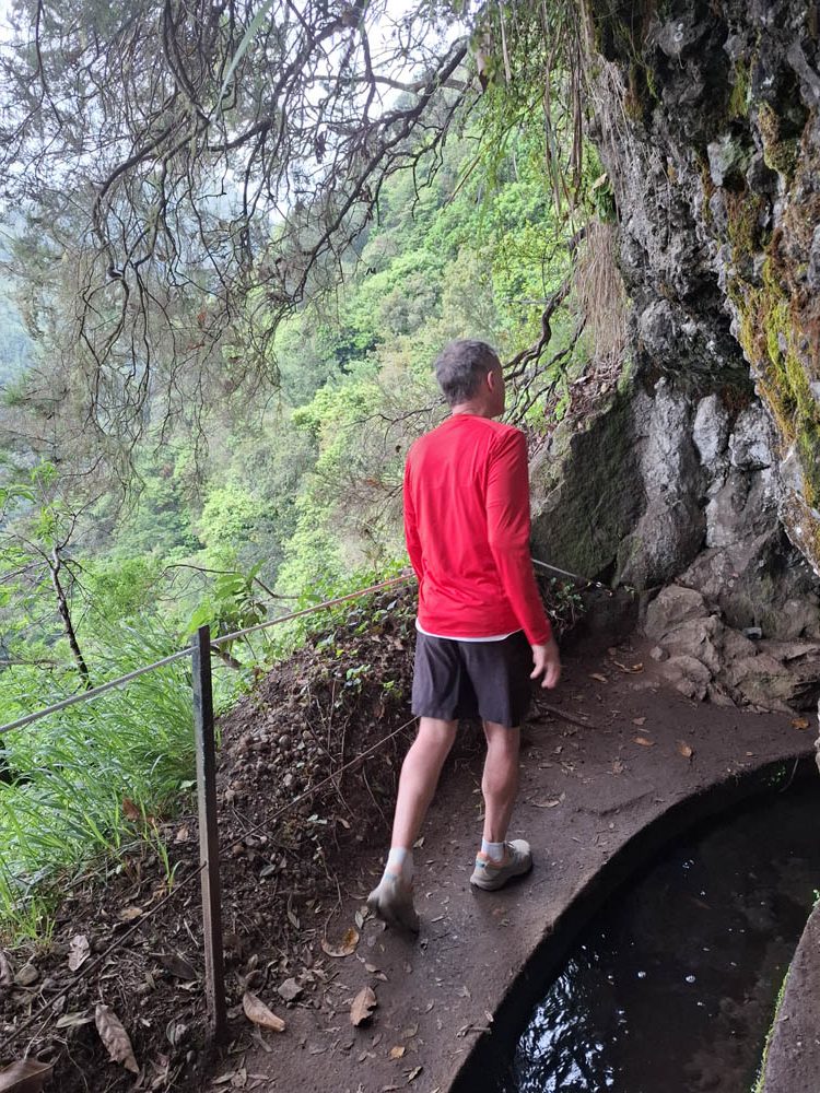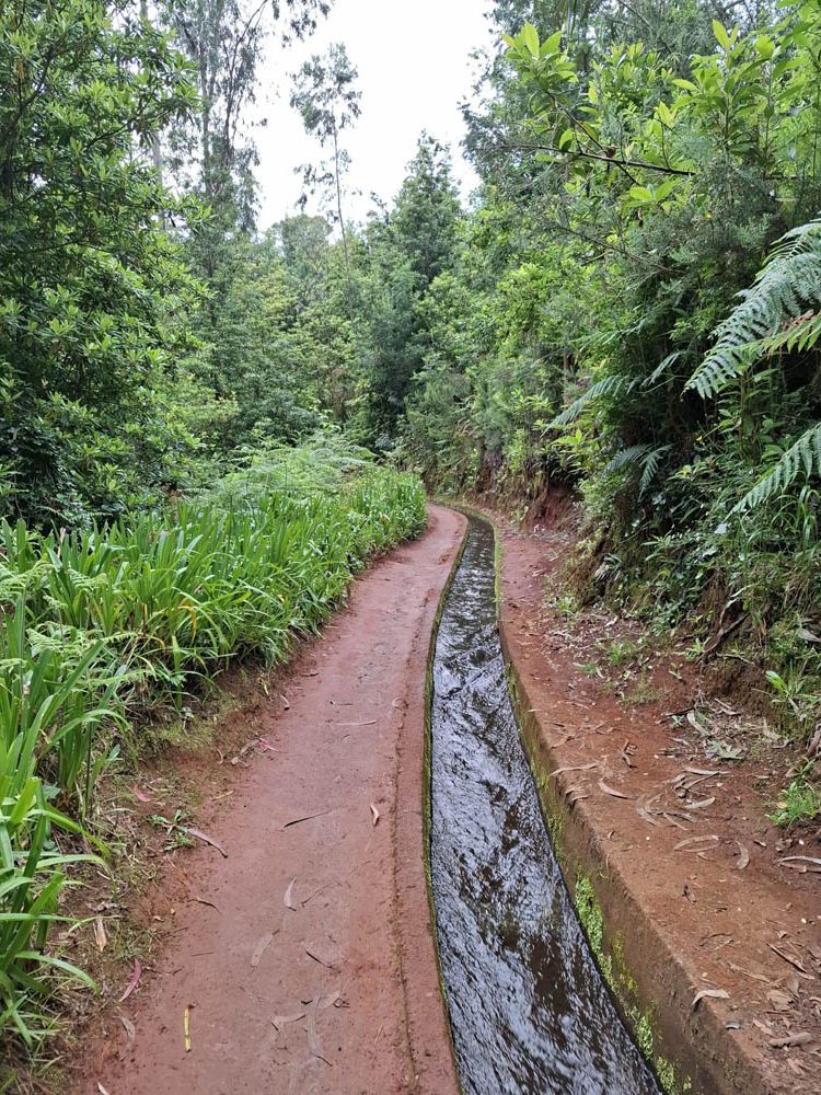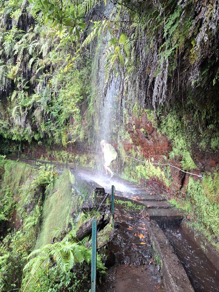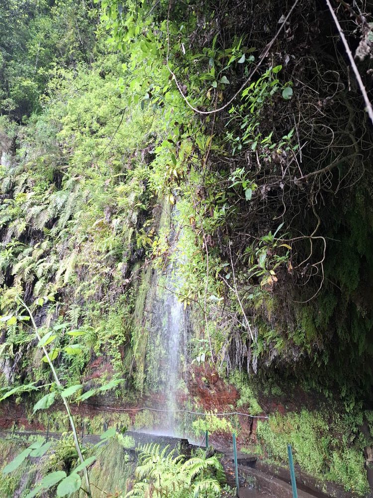 Najpierw pojechaliśmy na spacer lewadą do Rei. Miał być rozruch, niekoniecznie cały szlak, ale szło się tak dobrze, że machnęliśmy cały niemal 12km dystans. Bardzo fajna trasa wzdłuż kanału z płynącą wodą jak na lewadę przystało. Droga tylko delikatnie nachylona, gdyby nie płynąca obok wodą nawet trudno by się było zorientować, że jest pod górkę. Przepiękna, bujna roślinność, kwiaty i śpiew ptaków. Pod koniec trasy niespodzianka, spływający na szlak wodospad, pod którym trzeba było przejść. Ja miałam pelerynę, Jacek zdjął górę. Fajna atrakcja. Szlak kończył się w wąwozie, gdzie pewnie po deszczach także płynie spory wodospad. Chwila odpoczynku i powrót tą samą trasą.
