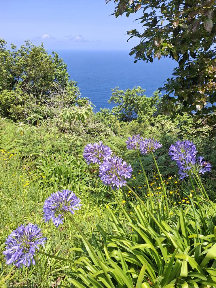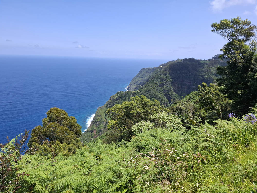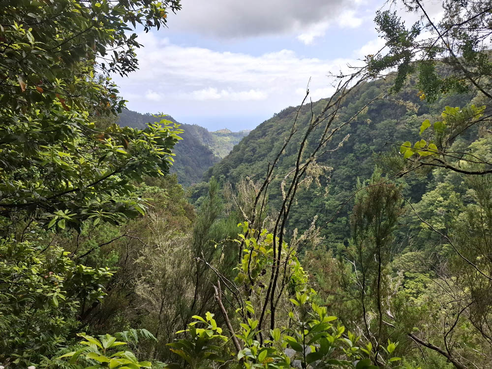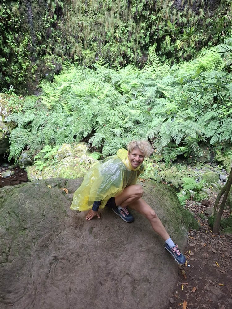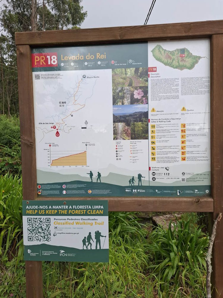 Najpierw pojechaliśmy na spacer lewadą do Rei. Miał być rozruch, niekoniecznie cały szlak, ale szło się tak dobrze, że machnęliśmy cały niemal 12km dystans. Bardzo fajna trasa wzdłuż kanału z płynącą wodą jak na lewadę przystało. Droga tylko delikatnie nachylona, gdyby nie płynąca obok wodą nawet trudno by się było zorientować, że jest pod górkę. Przepiękna, bujna roślinność, kwiaty i śpiew ptaków. Pod koniec trasy niespodzianka, spływający na szlak wodospad, pod którym trzeba było przejść. Ja miałam pelerynę, Jacek zdjął górę. Fajna atrakcja. Szlak kończył się w wąwozie, gdzie pewnie po deszczach także płynie spory wodospad. Chwila odpoczynku i powrót tą samą trasą.