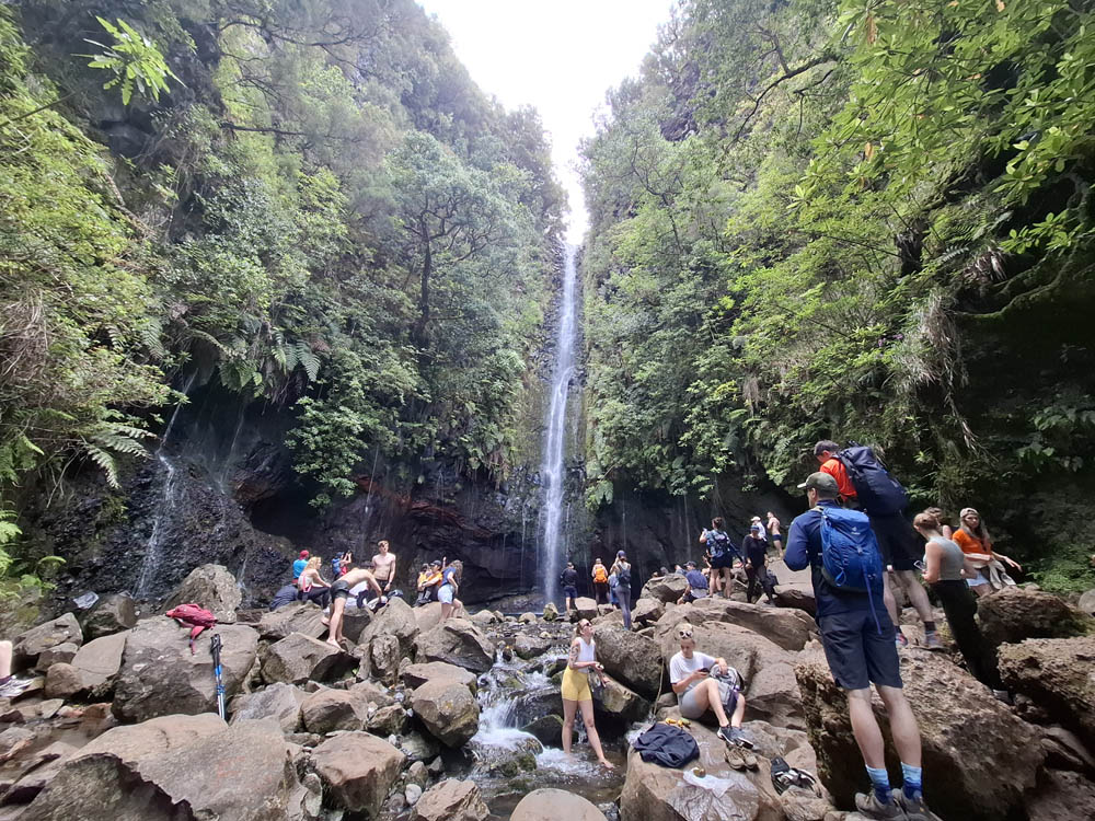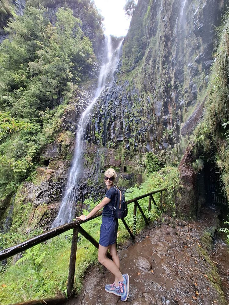Pojechaliśmy wgłąb wyspy, gdzie początek miało kilka szlaków. Było już późno, dochodziło południe i samochodów mnóstwo. Zaparkowaliśmy wzdłuż drogi i ruszyliśmy. Celem była lewada do Risco, która kończy się wodospadem. Przyjemna ścieżka, od słońca chroniły drzewa, które swoimi koronami pochylały się nad naszymi głowami. Piękne widoki na Dolinę Robacal. Droga powrotna tą samą trasą. Przy jej końcu było odbicie na drugą lewadę 25 Fontes. Yacool został przy kawiarni na szlaku, a ja szybkim marszem ruszyłam na kolejny. Trasa prowadziła wzdłuż kanału z wodą, setki stopni kamiennych do pokonania. Ludzi całkiem sporo, dużo Polaków. Koniec trasy to także wodospad, a właściwie liczne małe i jeden duży wodospad, których wody spływają z gór do naturalnego basenu. Sama trasa bardzo fajna, punkt kulminacyjny trochę mnie rozczarował. Może po większych opadów byłoby bardziej spektakularnie.