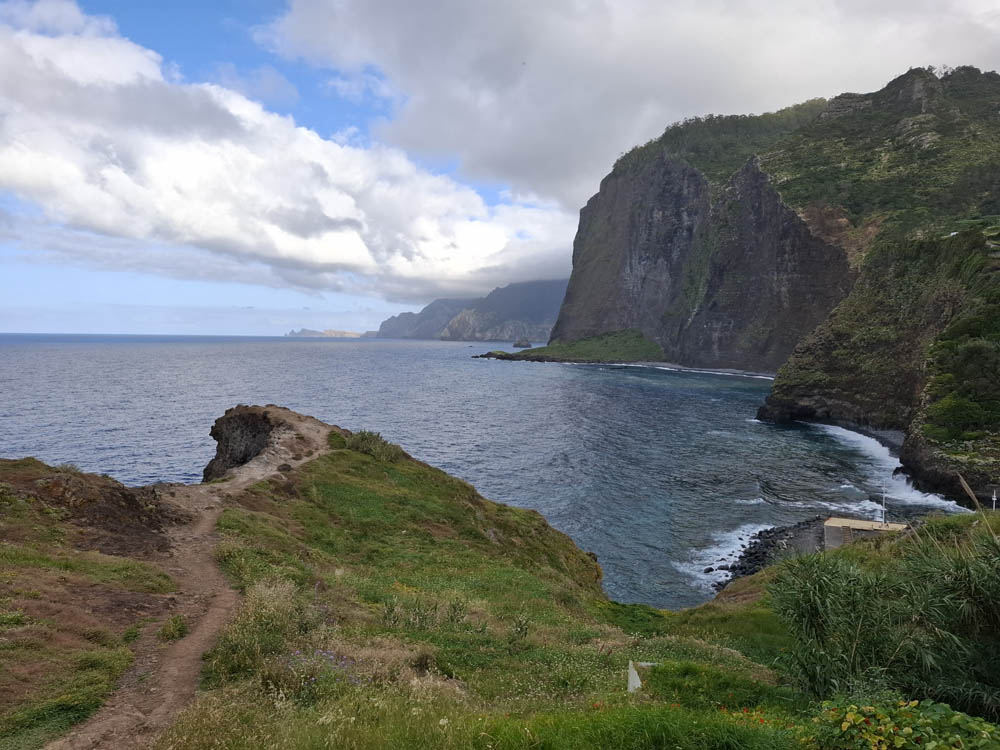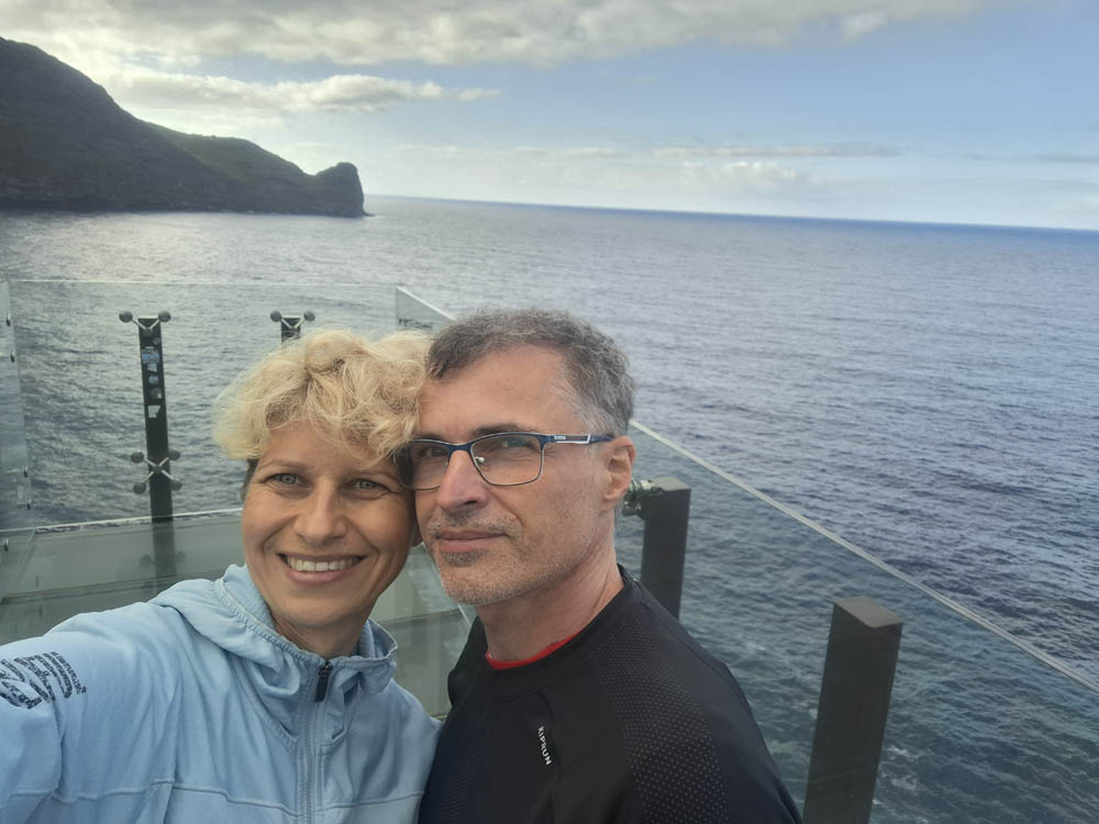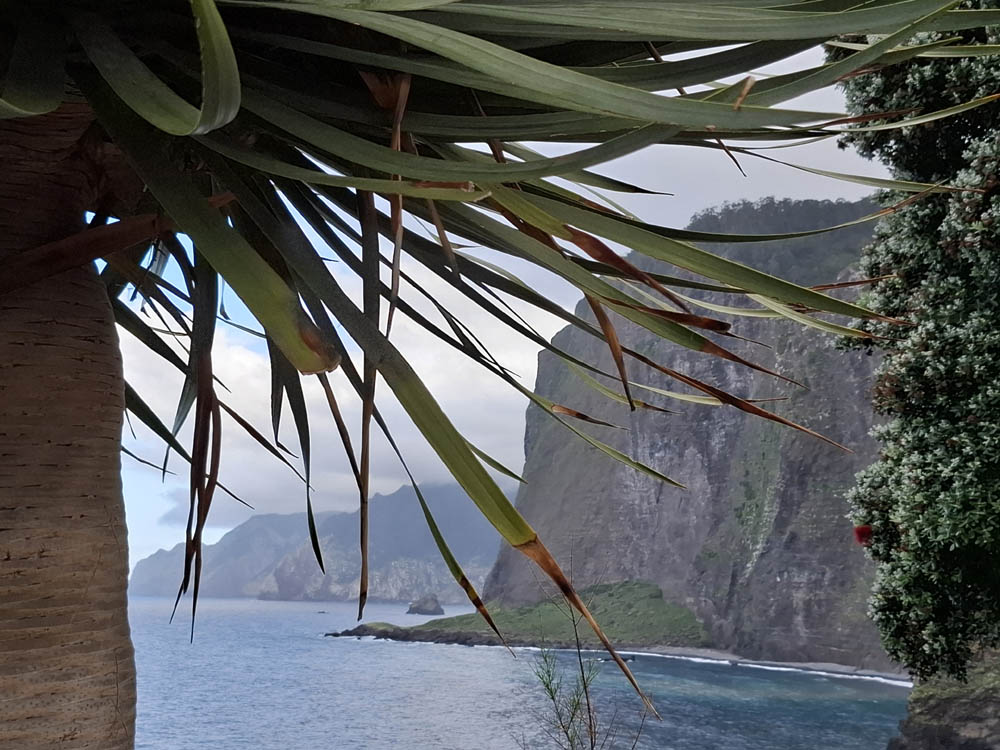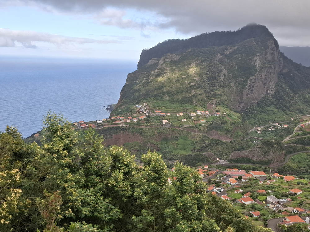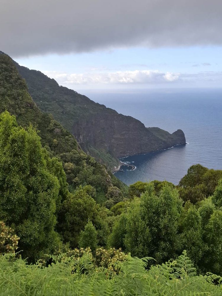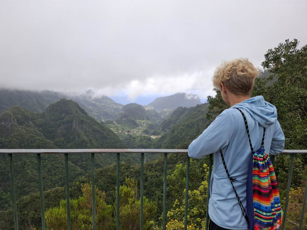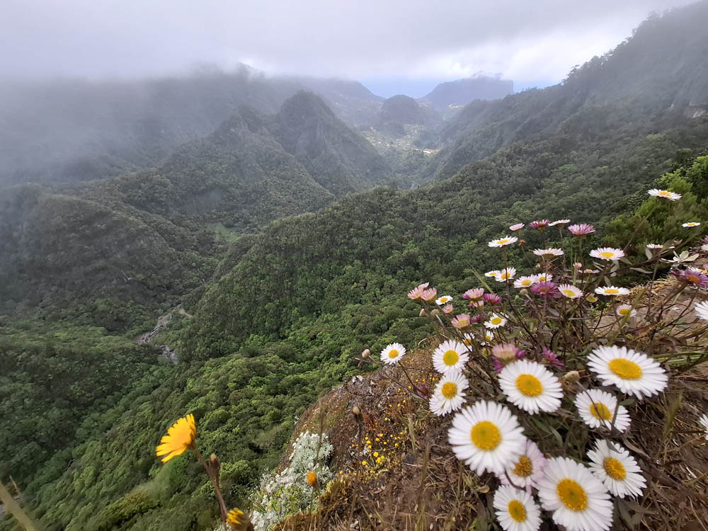 Pamiętam kręte drogi na Teneryfie, ale tu doznania zdają się być mocniejsze. Przecięliśmy wyspę z południowego wschodu na północ. W ciągu kwadransa wjechaliśmy na wysokość niemal 1300 m z poziomu morza. Momentami jechaliśmy w chmurach. Zatrzymaliśmy się w Ribeiro Frio na pysznym pstrągu. Obok knajpy początek miała jedna z lewad Dos Balcoes. Poszliśmy nią na spacer na punkt widokowy. Piękna zieleń i bogactwo roślinności, do tego śpiew ptaków. Trochę chmur, ale mimo to widoki fajne, mało turystów.