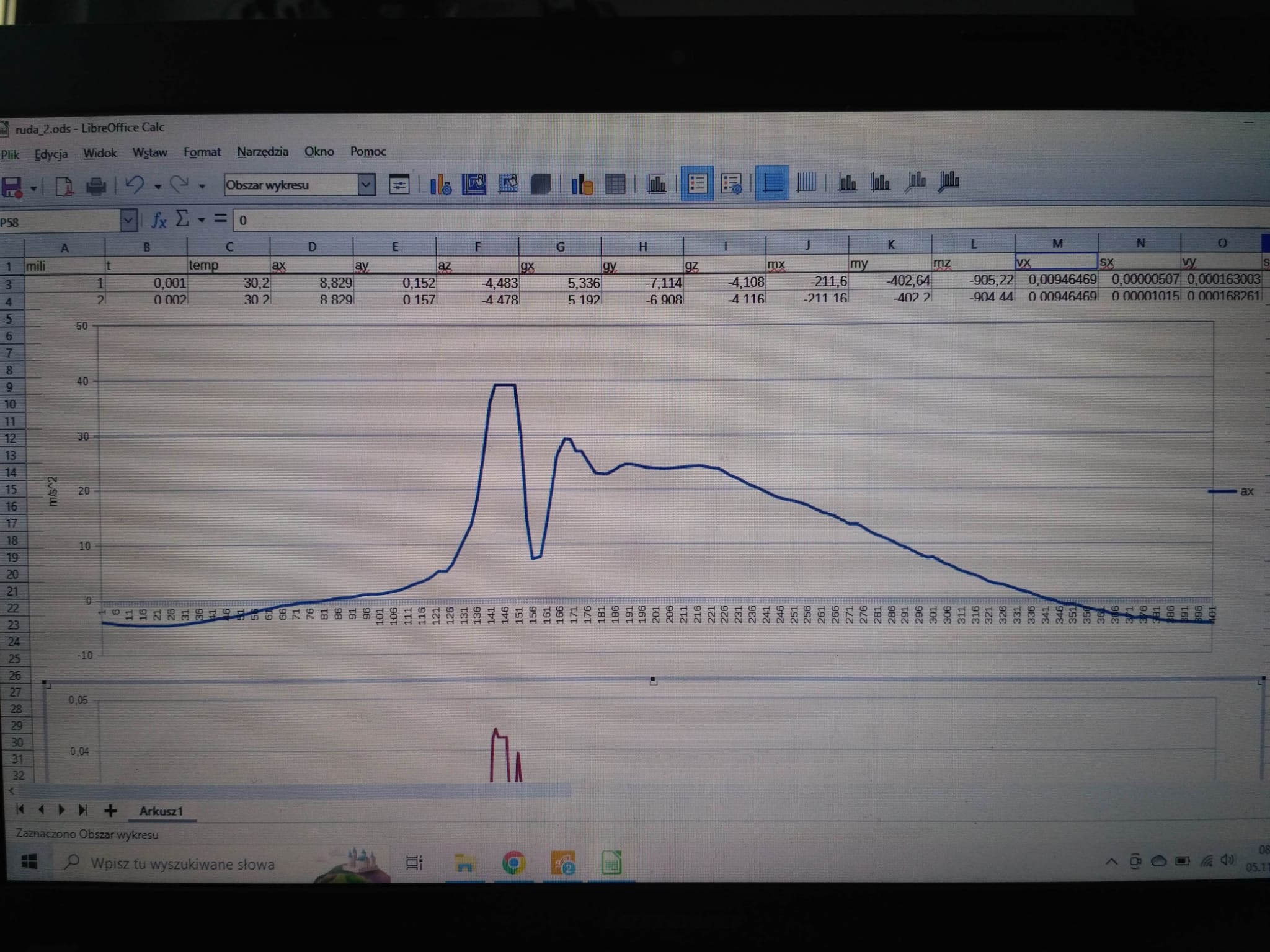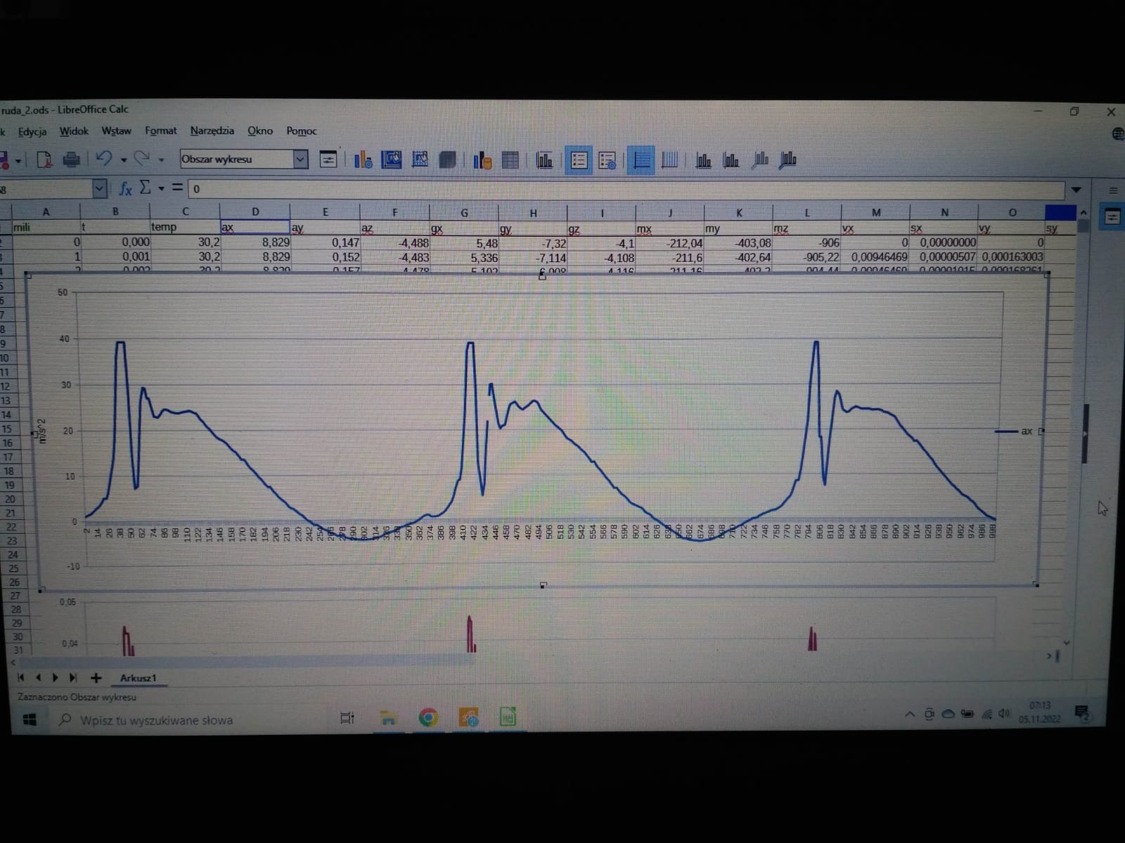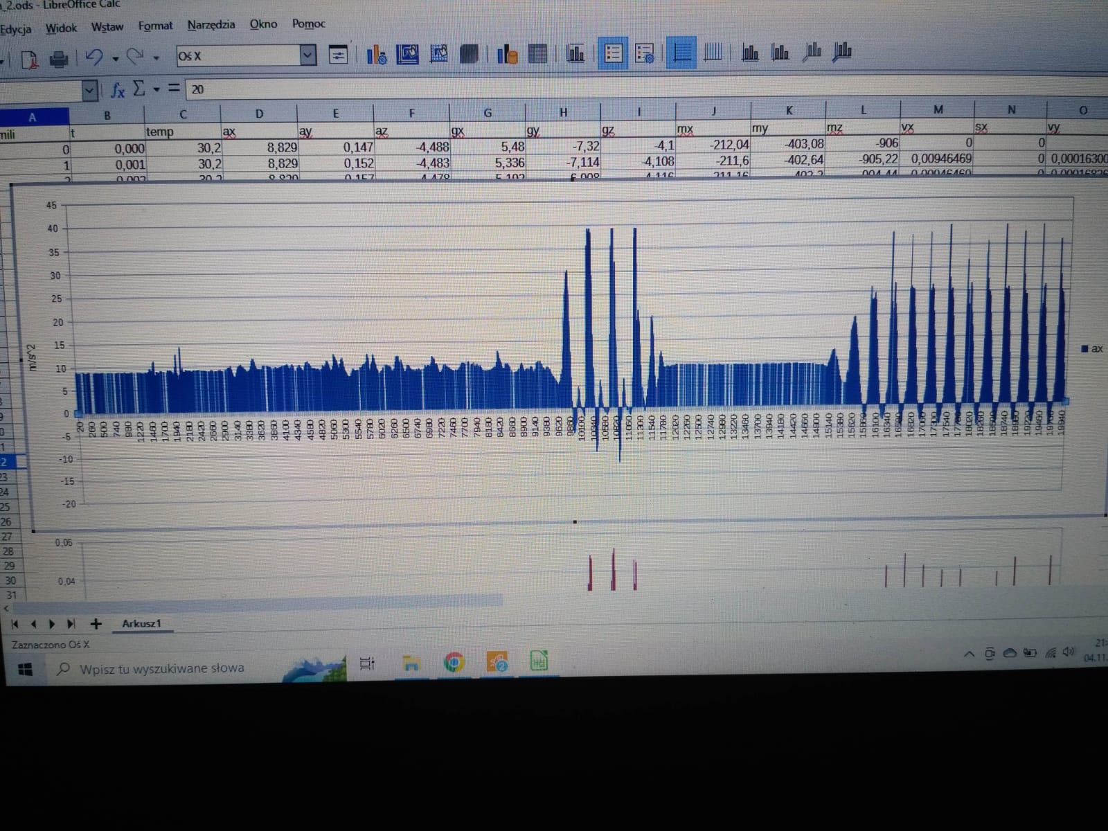 Maja zmierzyła już dla nas kilka krótkich odcinków w biegu. Poniżej wrzucam trzy skriny z wykresami przyspieszeń w osi góra-dół. Na pierwszym skrinie widać 20 sekund nagrania (oś czasu wyskalowania jest w milisekundach). Bieg rozpoczyna się w około 15 sekundzie. Widać wtedy charakterystyczny, powtarzający się wzór zmian przyspieszenia. Na kolejnym skrinie pokazany jest widok przeciążeń w 19 sekundzie tego samego nagrania. Widać na nim trzy charakterystyczne przebiegi przeciążeń odpowiadające trzem krokom. Ostatni skrin to maksymalne powiększenie dla pierwszego kroku z 19 sekundy. Tak wyglądają przeciążenia w jednym kierunku. Są to wciąż surowe dane prosto z Mai. Być może potrzebne będą kolejne optymalizacje i kalibracje urządzenia oraz metody prezentacji wyników i dalsze wyliczanie z tego już prędkości i odległości.