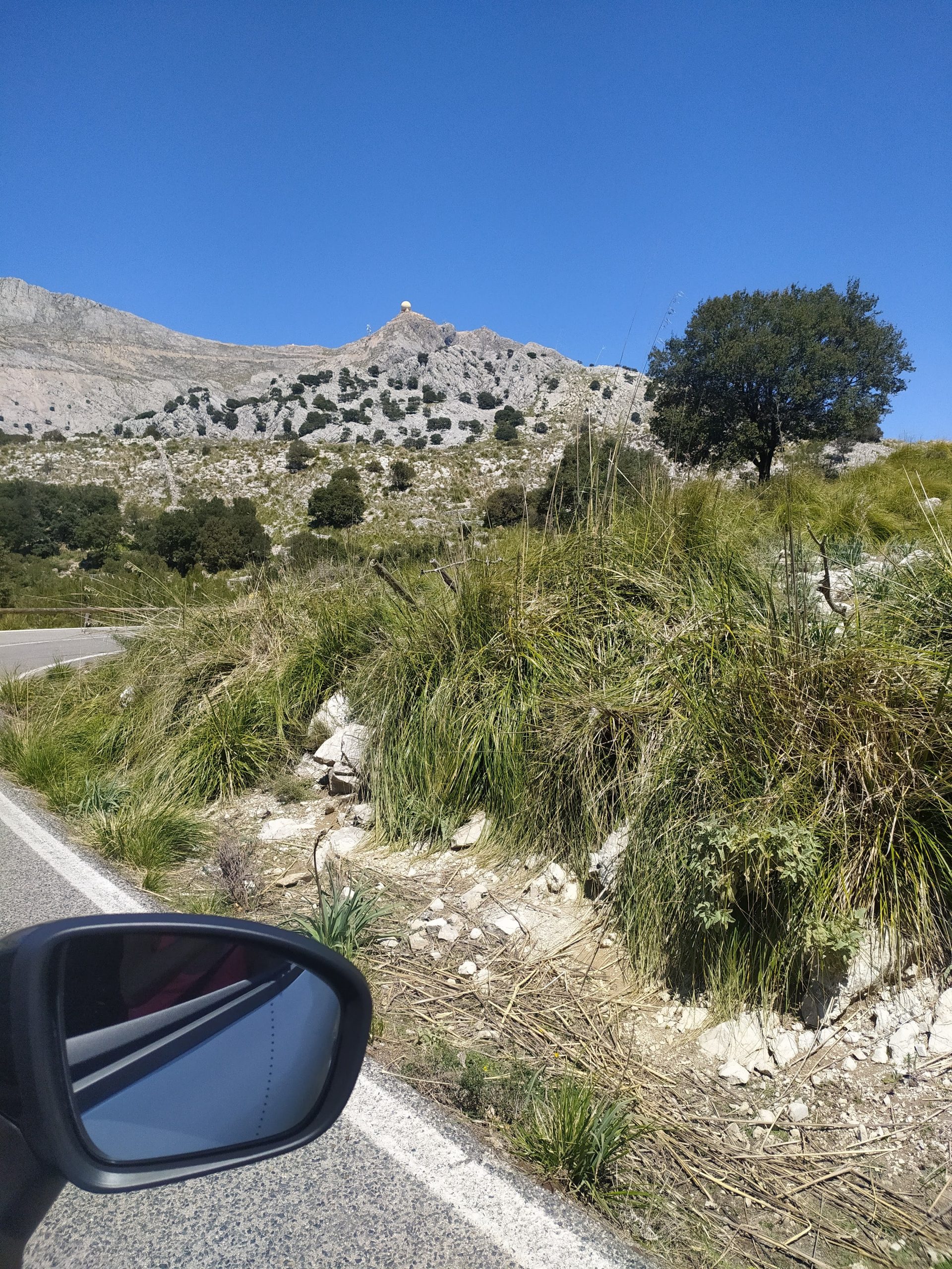 Koło południa wybraliśmy się na wycieczkę, na najwyższy szczyt wyspy Puig Major (1445 m n.p.m.). Co prawda dzień wcześniej, gdzieś nam majaczył na horyzoncie i to, że znajdują się na nim radary wojskowe, ale nie wiedzieć czemu nie pomyśleliśmy, ani nie sprawdziliśmy zawczasu w necie czy da się tam wejść… I to był błąd. Jechaliśmy ponownie na południowy zachód wyspy, pięknymi górskimi drogami, pełnymi serpentyn i setek kolarzy… To była droga przez mękę. Drogi były bardzo wąskie, peletony kolarzy jadących w górę i w dół, których nie było jak wyprzedzić, bo często jechali obok siebie całą szerokością pasa drogi. Ci jadący z góry jechali środkiem z naprawdę dużą prędkością. W sumie odcinek niespełna 50 km zajął nam blisko 2h jazdy.