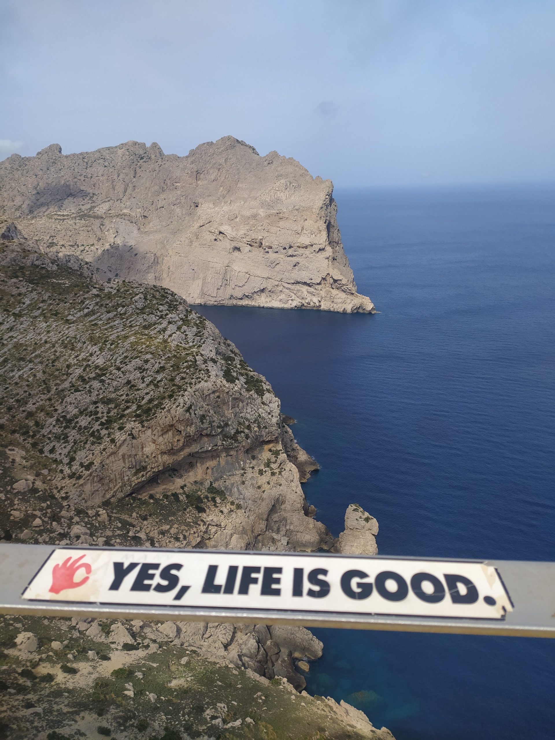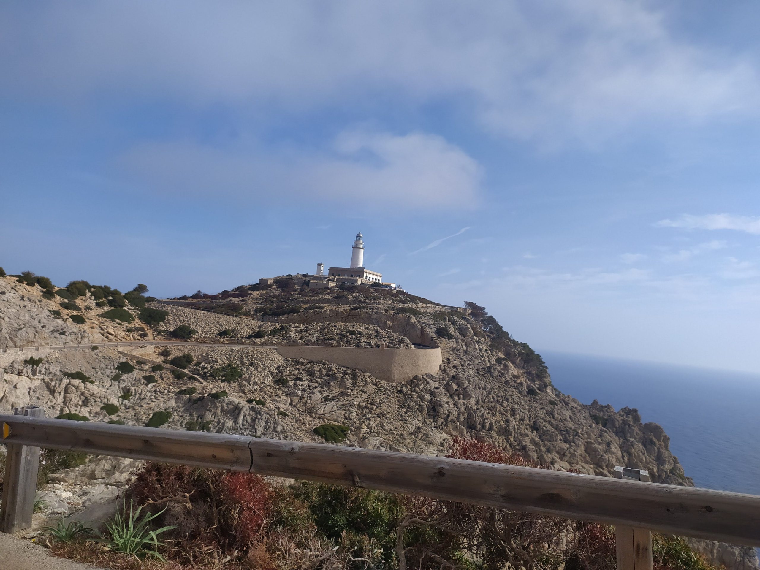 Dobrze przypuszczaliśmy. O 9 rano droga na Cap Formentor była jeszcze w zasadzie pusta. Widoki super. W wyższych partiach pasły się kozy. Poboczne punkty widokowe zostawiliśmy sobie do zobaczenia w drodze powrotnej. Czytałam, że pod latarnią morską jest bardzo mały parking, raptem na kilka aut. Jak jest dużo ludzi trzeba parkować wzdłuż wąskiej drogi dojazdowej i potem kombinować z nawracaniem. Nam udało się dojechać, gdy parking był w połowie pusty. Dzięki temu mogliśmy cieszyć się spokojnym podziwianiem okolicy. Wypiliśmy kawę i zjedliśmy po ciachu. Majorka ponownie zaczęła nam się podobać 😃