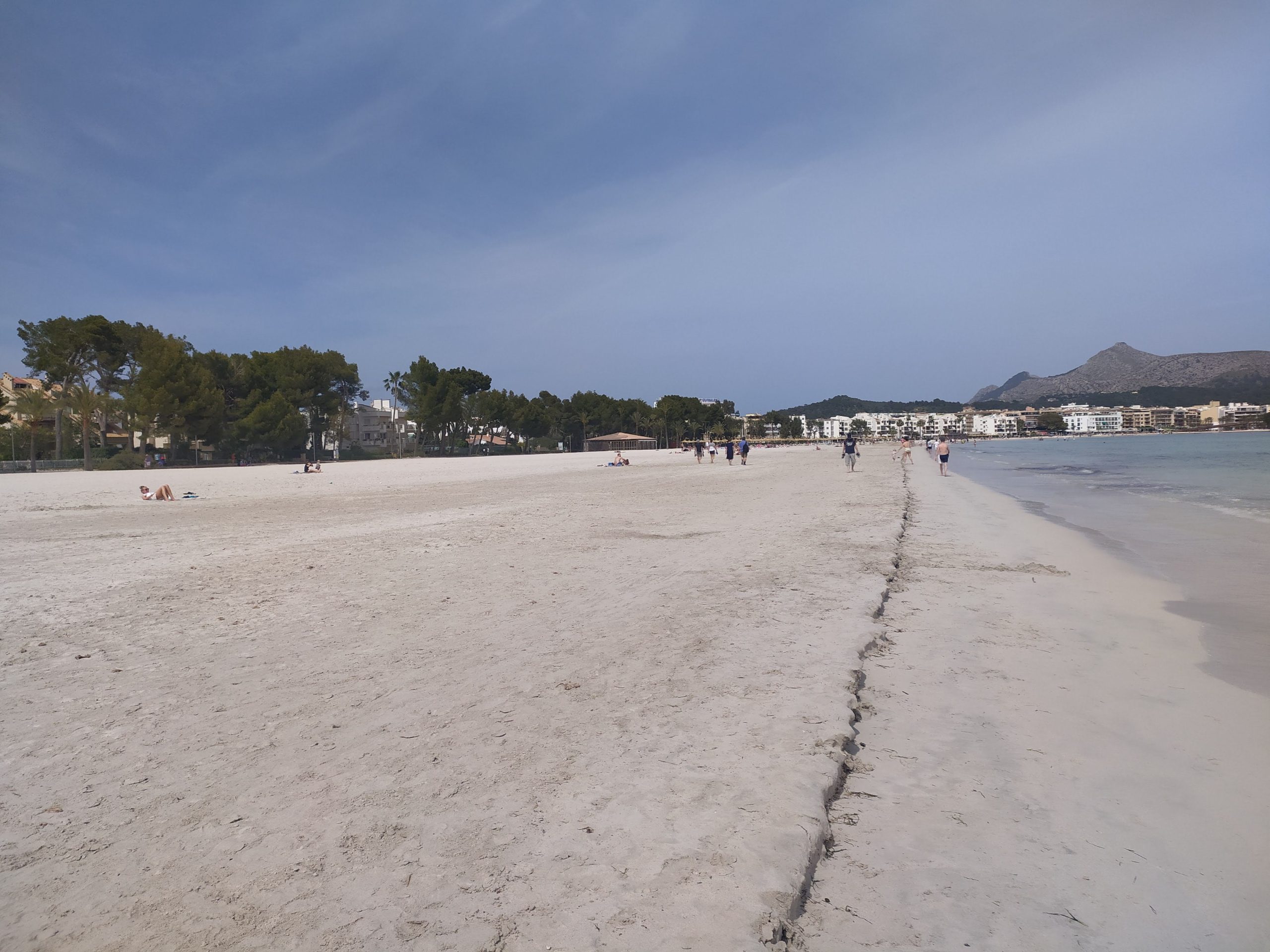 W końcu dotarliśmy na naszą plażę. Delikatny żółty piasek, bardzo płytka i ciepła woda. Idealne miejsce dla rodzin z dziećmi. Wzdłuż plaży promenada, restauracje wszelkiego typu. Dużo jest tu knajp serwujących włoską kuchnię. Dalej, w głębi lądu była ulica, która łączy Port de Alcudia z kolejną miejscowością – Can Picafort. Wzdłuż całej drogi raczej niska zabudowa, hotele i apartamenty, wynajem rowerów i aut i setki sklepów. Typowa miejscowość nadmorska.