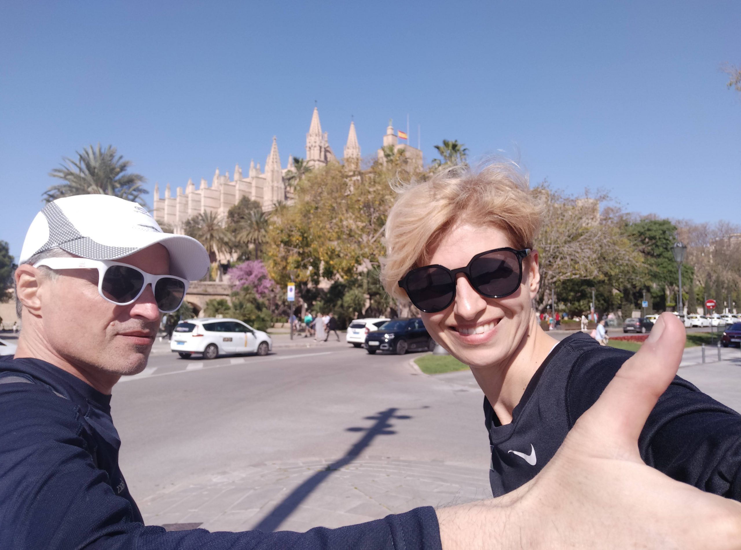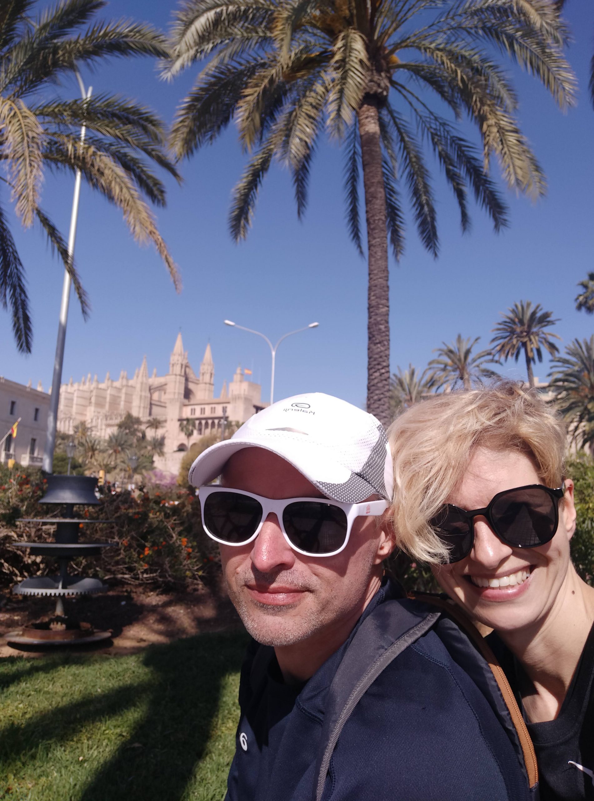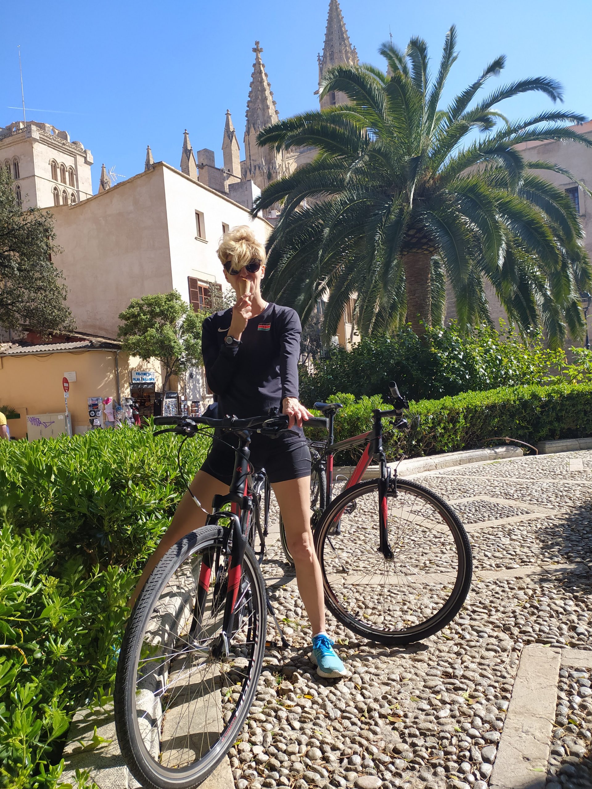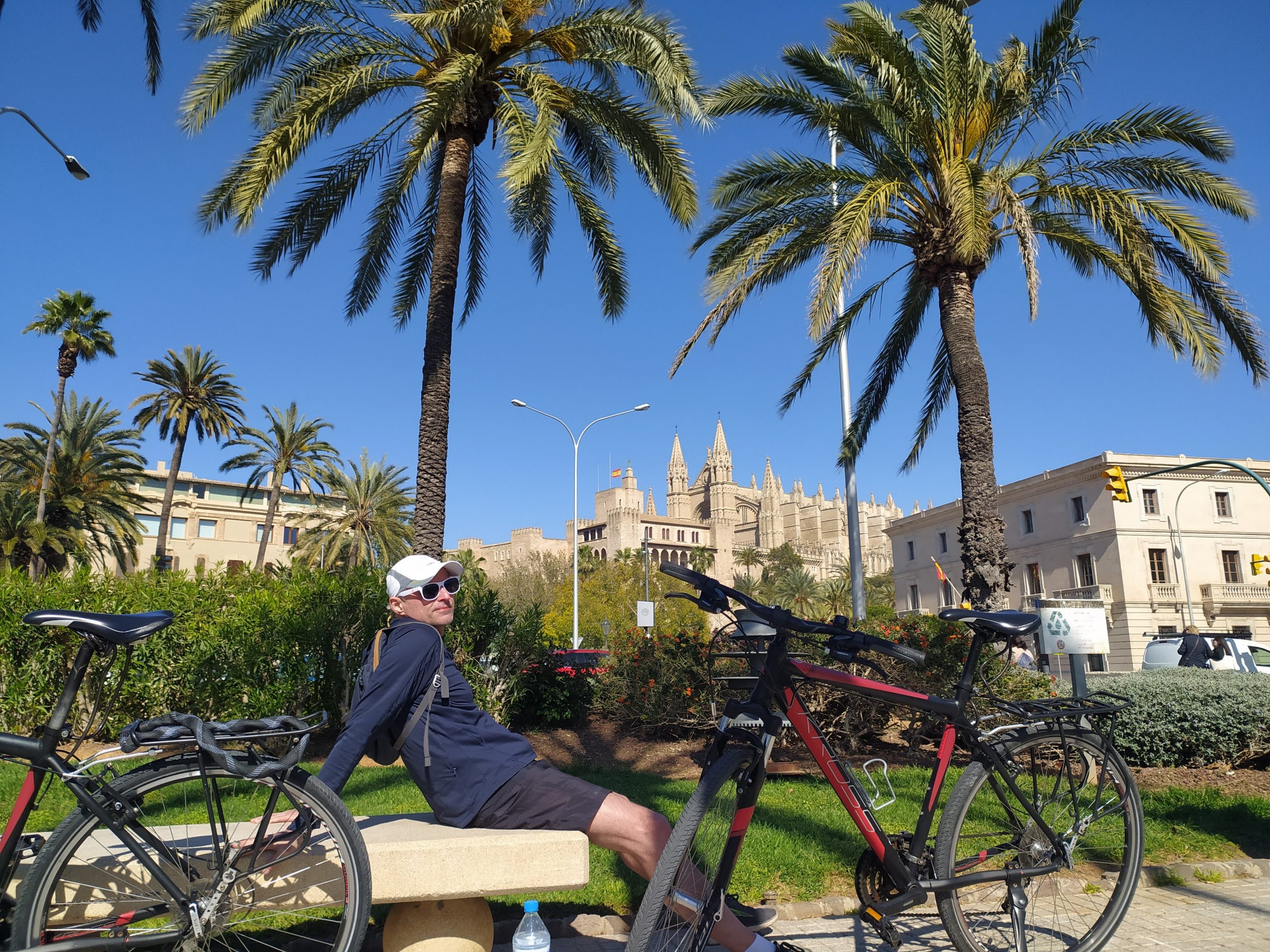 Do centrum Palmy mieliśmy około 10km. Po drodze przerwa na lunch i piwko, potem na zdjęcia i filmiki. W samej Palmie też jest sporo ścieżek rowerowych. Czasem jeździliśmy po chodnikach, choć nie mam pewności czy jest to dozwolone. W okolicy słynnej katedry i na licznych placach było już więcej turystów. Miasto podobne klimatem do Walencji czy Malagi. Jackowi przez kwadratowe place skojarzyło się z Madrytem, nie wiem, nie byłam. Jeszcze 😉