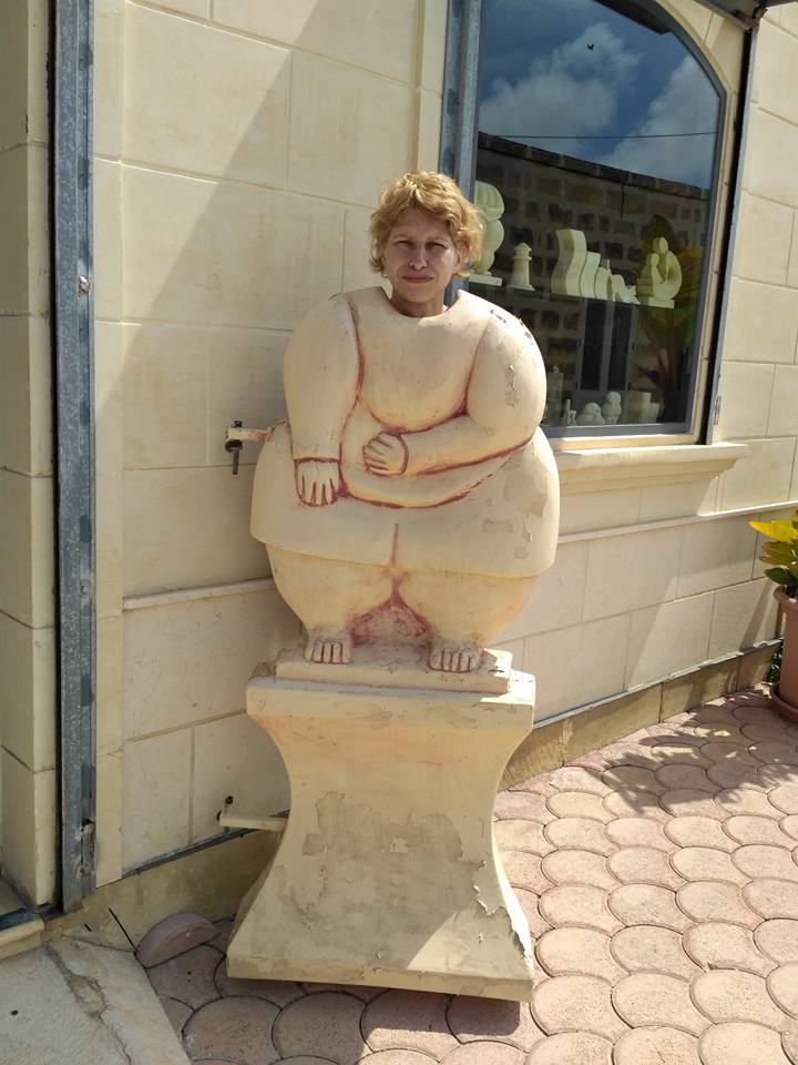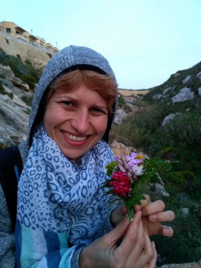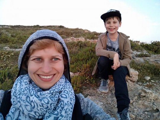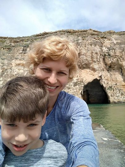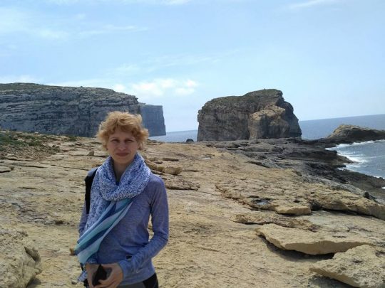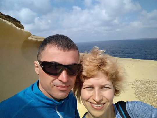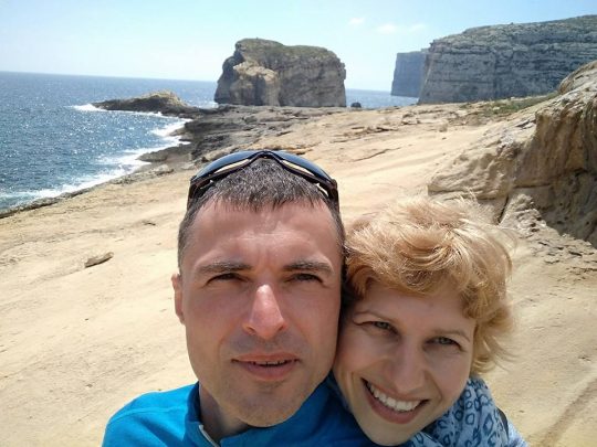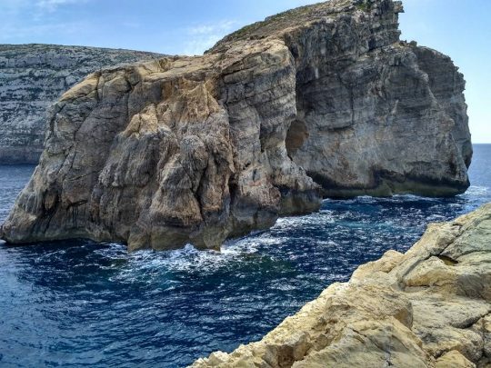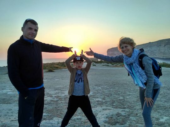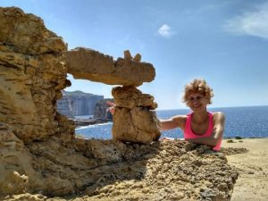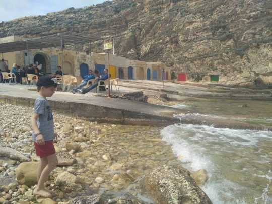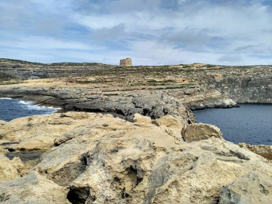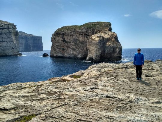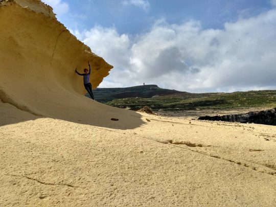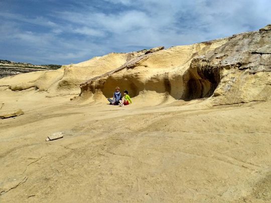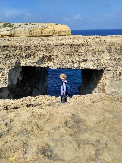 Od rana zrobiłam z Jankiem rekonesans terenu. Znaleźliśmy jedyny w okolicy sklep, typu supermarket. Kupiliśmy świeże bułki i lokalne przysmaki na śniadanie. Potem Jarek poszedł na pieszą wędrówkę, a my pojechaliśmy autem zwiedzać okolicę. Najpierw północ wyspy i klify. Żółte nawisy robiły spore wrażenie. W nich zatopione muszle. Były też małe domki myśliwych, podobno na Gozo popularne są polowania na ptaki. Potem pojechaliśmy zobaczyć drugie znane okno skalne, Wied il Mielah. Wiszący most mniejszy niż w Azur Window (które runęło do wody parę tygodni przed naszym przyjazdem) i bardziej schowany w ląd. Może dzięki temu woda i wiatr nie zniszczą go…