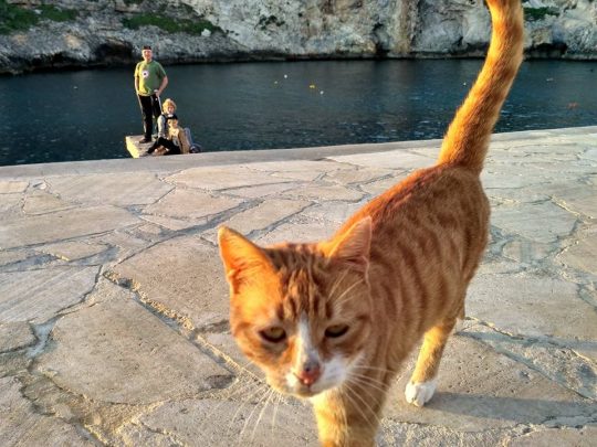 Najedliśmy się wyśmienicie. Potem obowiązkowy spacer. Towarzyszył nam rudy kot. Słońce było coraz niżej, więc postanowiliśmy wspiąć się na zbocze stamtąd obejrzeć zachód słońca. Słońce było czerwone i dosłownie w ciągu 2 minut od chwili zetknięcia się z morzem wpadło pod wodę. Wracaliśmy już do auta w półmroku. Szybko robi się tu ciemno. Ja nazrywałam sobie kilka kolorowych kwiatków, jedne wydzielały biały płyn, jak nasz mlecz. No i dostałam nauczkę do końca życia… Po powrocie do domu niefortunnie potarłam brudną ręką oczy. I się zaczęło. Oczy zaczęły mnie potwornie piec, jakby ktoś włożył mi do oka rozżarzone węgielki. Koszmar. Jarek zaczął mi polewać oczy butelkową wodą i robić zimne okłady. Ja leżałam i bałam się, że oślepnę. Chłopaki sprawdziły, gdzie jest najbliższy szpital. Na szczęście po pół godzinie ciągłego lania wodą po oczach, w końcu zaczęłam czuć ulgę. Teraz jest już dobrze, widzę i pieczenie ustało. Uff. Naprawdę się przestraszyłam. Nigdy więcej nie będę zrywać kwiatków!