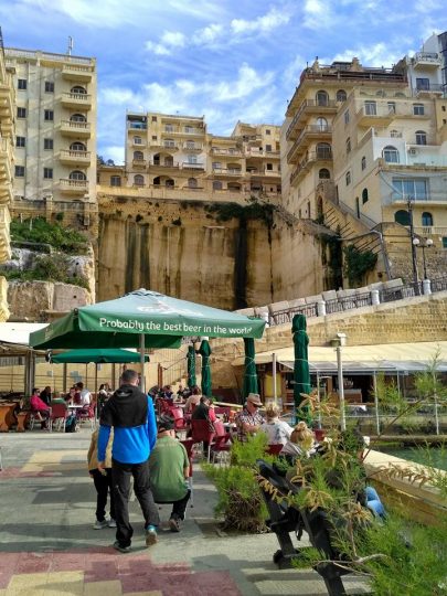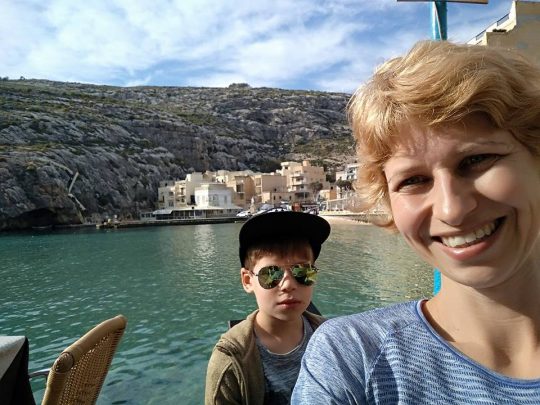 Po powrocie do domu Janek zaliczył kąpiel w basenie przyapartamentowym, mimo zimnej wody. Po południu planowaliśmy jechać na obiad do stolicy wyspy Gozo – Victorii. Ale duży ruch, korki i hałas szybko nas stamtąd przegonił. W zamian pojechaliśmy na południe wyspy do uroczej zatoczki Xlendi. To miejsce nas nie rozczarowało. Nad brzegiem morza fajne knajpki, po obu stronach zatoki wysokie klify. Kelner szybko się nami zajął. Janek dostał swoją pizzę po 5 minutach, my nasze rybki równie szybko. Pan zaproponował mi, że wyfiletuje mi moją. Sprawnie mu to poszło.