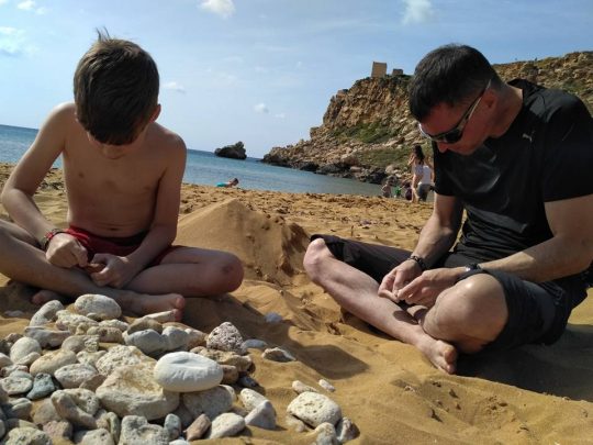 Potem chłopaki zajęli się rzeźbieniem w kamieniu. Kamieni na plaży było sporo więc mieli zajęcie na godzinę. Dziś poczuliśmy klimat nadmorskich wakacji. Było zakopywanie w piasku i zamki z piasku.