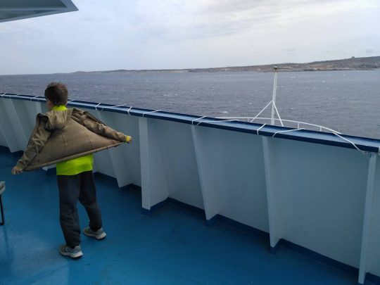Pogoda nas dziś nie rozpieszczała. Wiatr urywał głowę. Zaczynało robić się późno. Odpuściliśmy więc spacer plażą i ruszyliśmy prosto do portu. Prom tradycyjnie już na nas czekał. Mocno dziś nim bujało. Z portu na Malcie droga na lotnisko zajęła nam godzinę. Nie da się tu rozpędzić, wiąże się to też z pomyleniem drogi. Dziś też kilka razy musieliśmy nawracać, mimo GPS w komórce. Spóźniliśmy się godzinę z oddaniem auta do wypożyczalni. Pan machnął ręką. Nie starczyło nam już dziś czasu na spacer uliczkami zabytkowej stolicy Malty, Valletty. Zostawiamy to na kolejny raz.