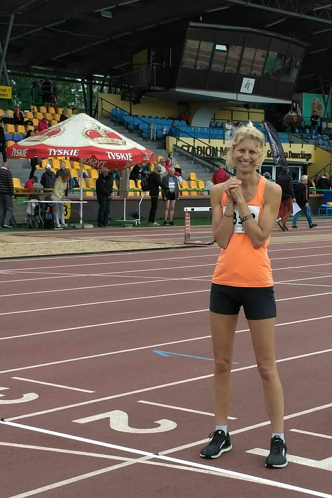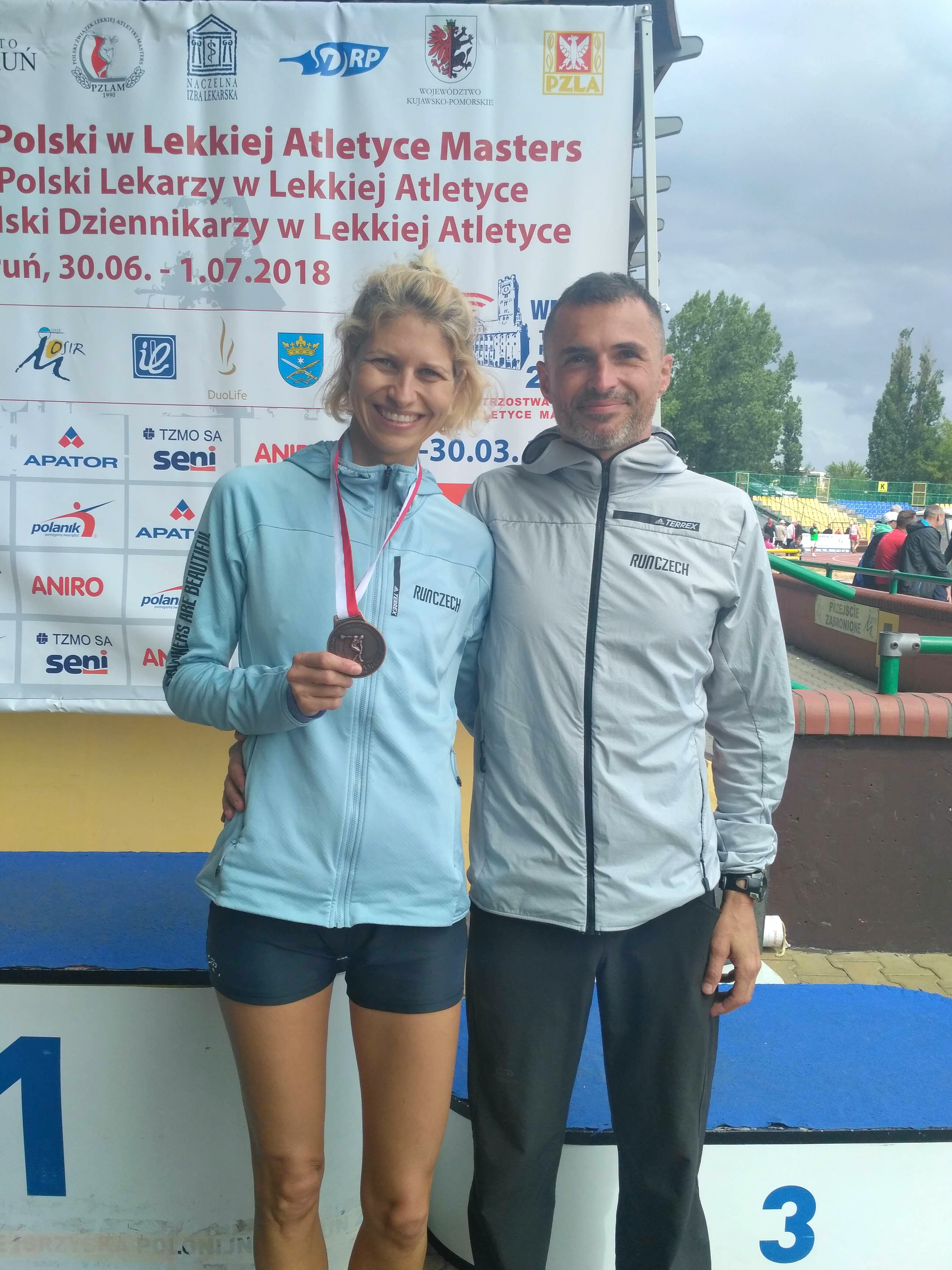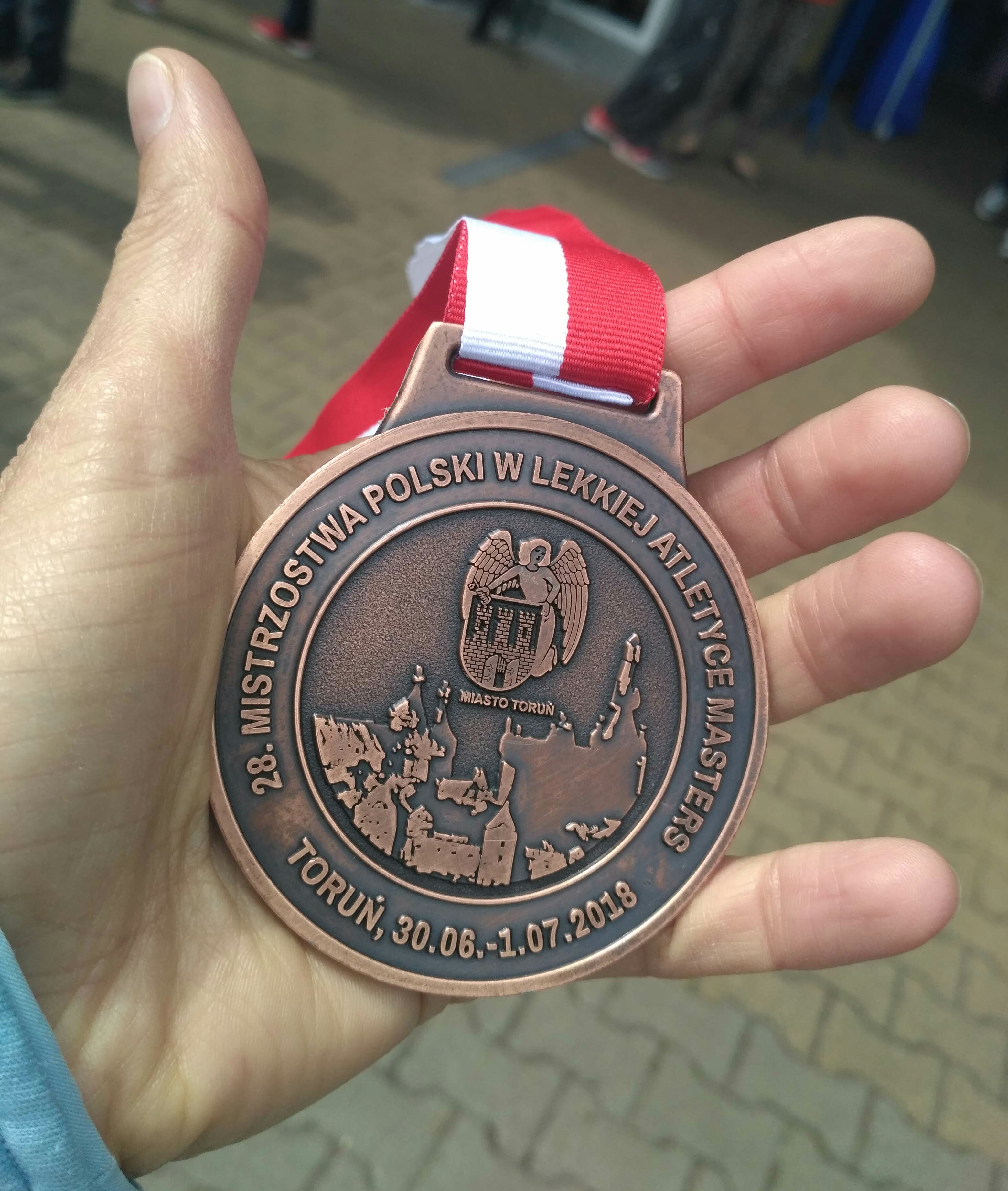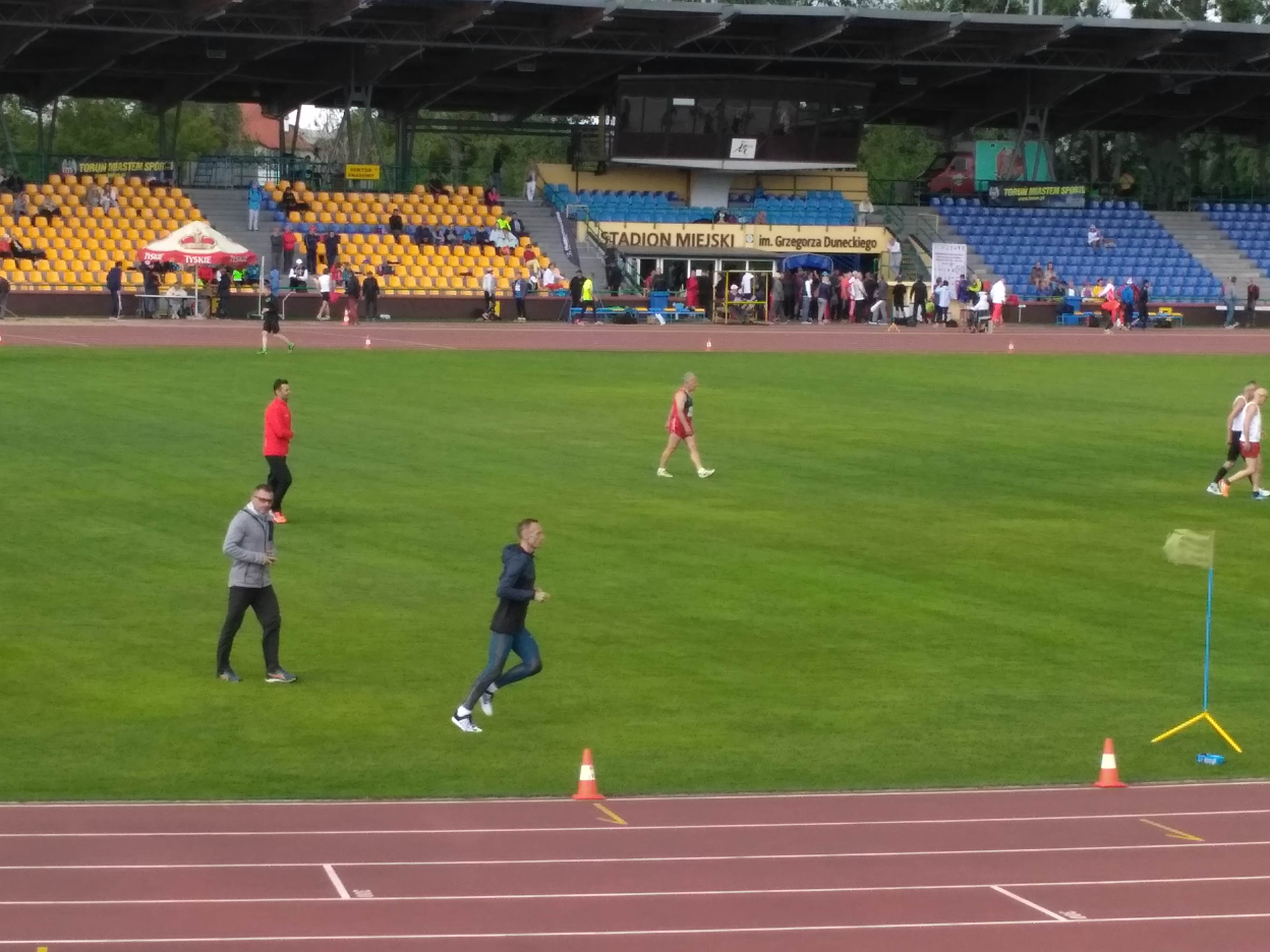 Dziś w Toruniu odbywał się drugi dzień Mistrzostw Polski w Lekkiej Atletyce Masters. Pogoda była jeszcze paskudniejsza niż wczoraj. Wiatr nie zelżał, do tego przelotnie padał deszcz. Mój start na 800 m trochę się opóźnił. Do rywalizacji ponownie stanęło blisko 20 kobiet, w kategoriach wiekowych od K35 do K80. Najstarsza uczestniczka, wszystkim znana pani Janina, startowała na kilku dystansach w ciągu tych dwóch dni mistrzostw. Zostałam ustawiona na pierwszym torze, właśnie z nią. Spodziewałam się, że stanie bardziej z tyłu, by nie blokować mi startu, ale wręcz przeciwnie, to ja zostałam zepchnięta do linii bocznej toru. Dostałam też kuksańca, bym uważała i nie nadeptywała na linię startu. Wystrzał startera dziś już mnie nie zaskoczył tak jak wczoraj. Yacool zakładał, że powinnam pobiec w granicach 2:50. Pierwsze 200 m pokonałam w 39 sekund, koło zamknęłam w 1:22. Ponownie czułam, że na początku drugiego koła mogłabym biec minimalnie szybciej, ale brak doświadczenia i obiegania dystansu sprawił, że nie byłam pewna swoich możliwości. Na przeciwległej prostej wiatr stawiał do pionu, ale dziś cały dystans biegłam za plecami innych uczestniczek. Na wyjściu z ostatniego łuku przyspieszyłam. Zrównałam się z panią Janiną, która kończyła pierwsze koło. Mijając zahaczyłam ją lekko. Wydaje mi się, że dość szeroko wychodziła z łuku… Powinnam bardziej wyjść na drugi tor. Nauczka na przyszłość. Trochę mnie to wybiło niestety z rytmu. Do mety dobiegłam z czasem 2:50:75. Wystarczyło to na brązowy medal w mojej kategorii wiekowej – mój pierwszy z imprezy mistrzowskiej. Jest niedosyt wynikowy zarówno z wczorajszego półtoraka jak i dzisiejszej osiemsetki, ale zdecydowanie oba dystanse przypadły mi bardzo do gustu.