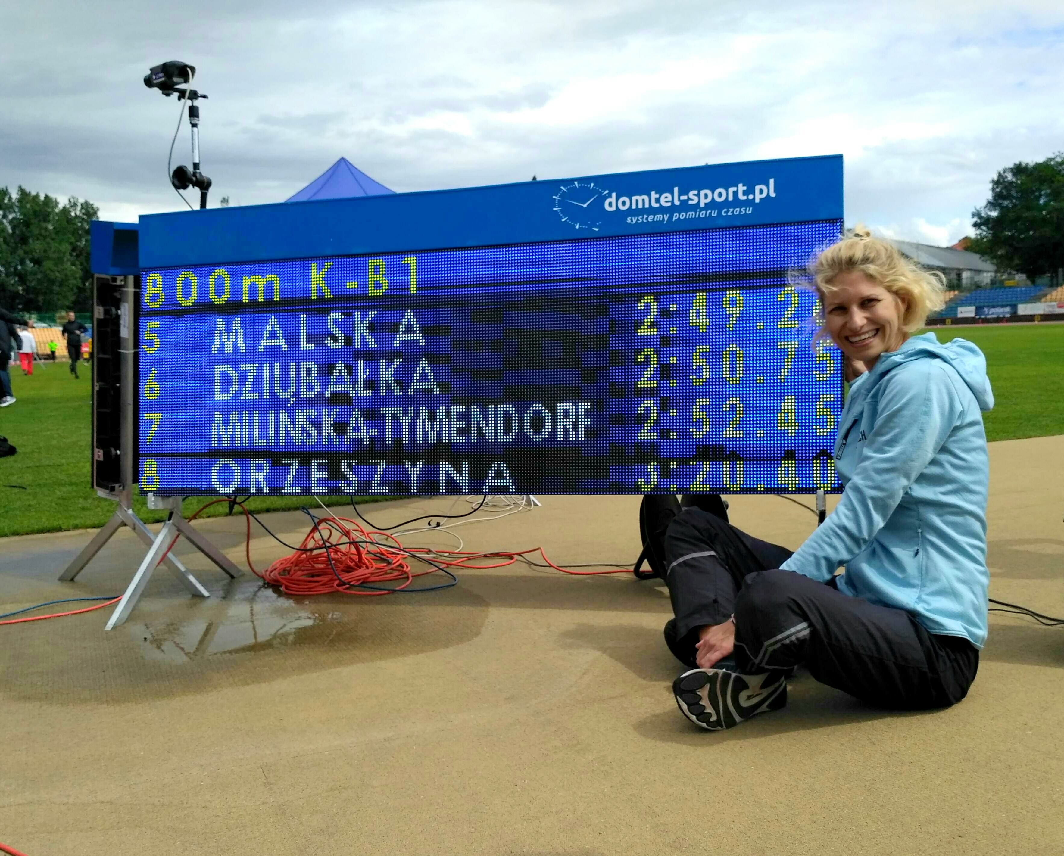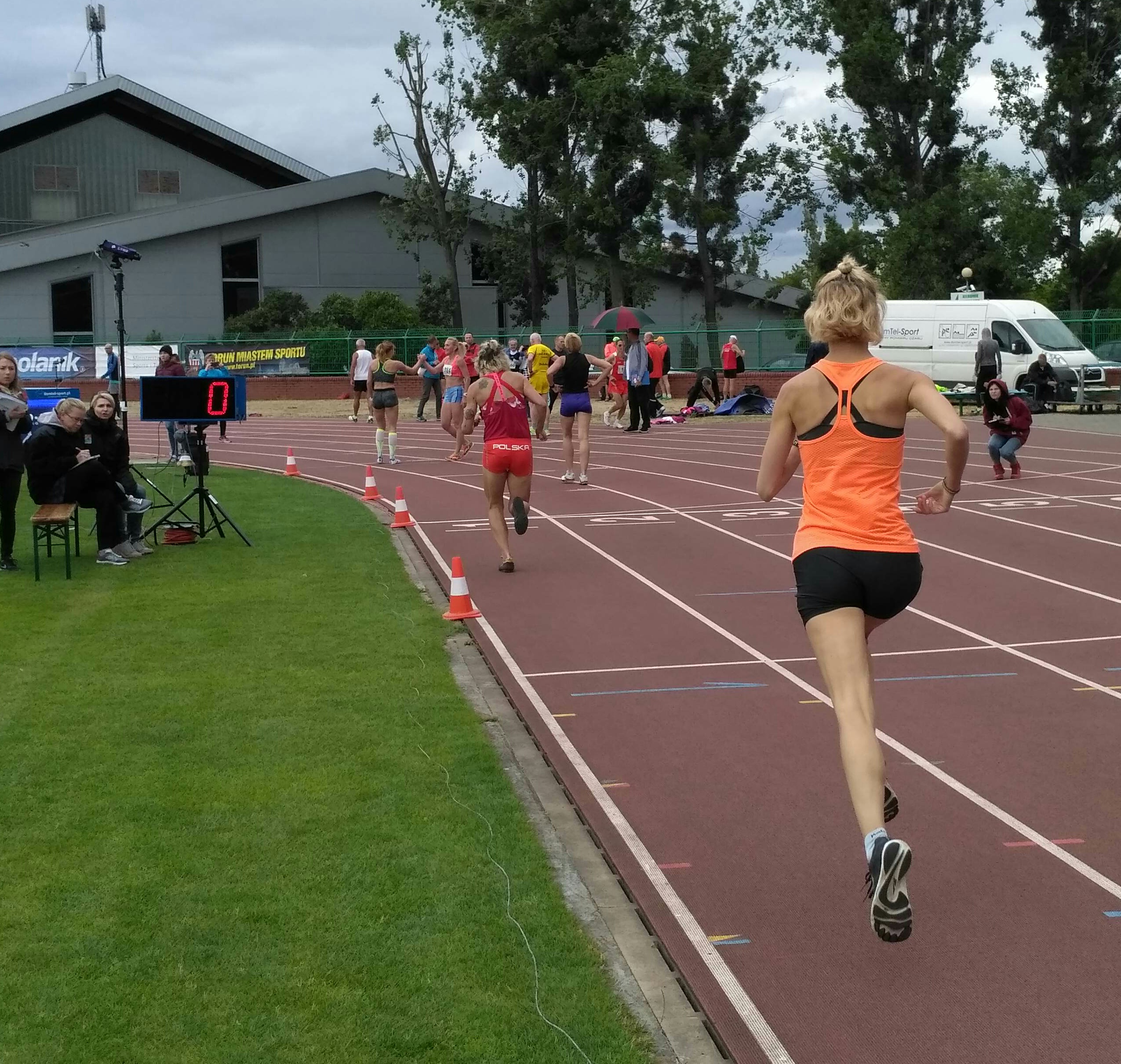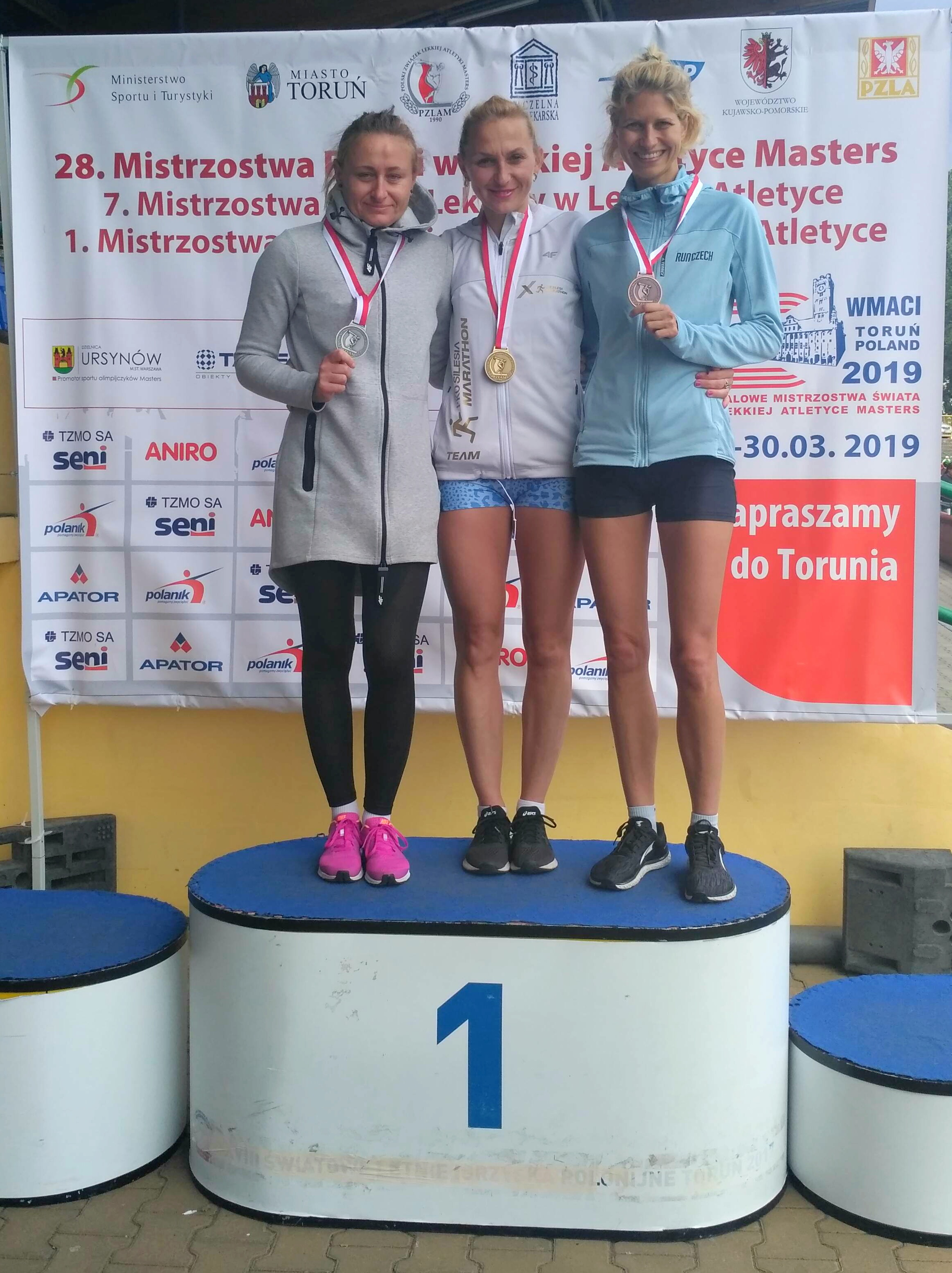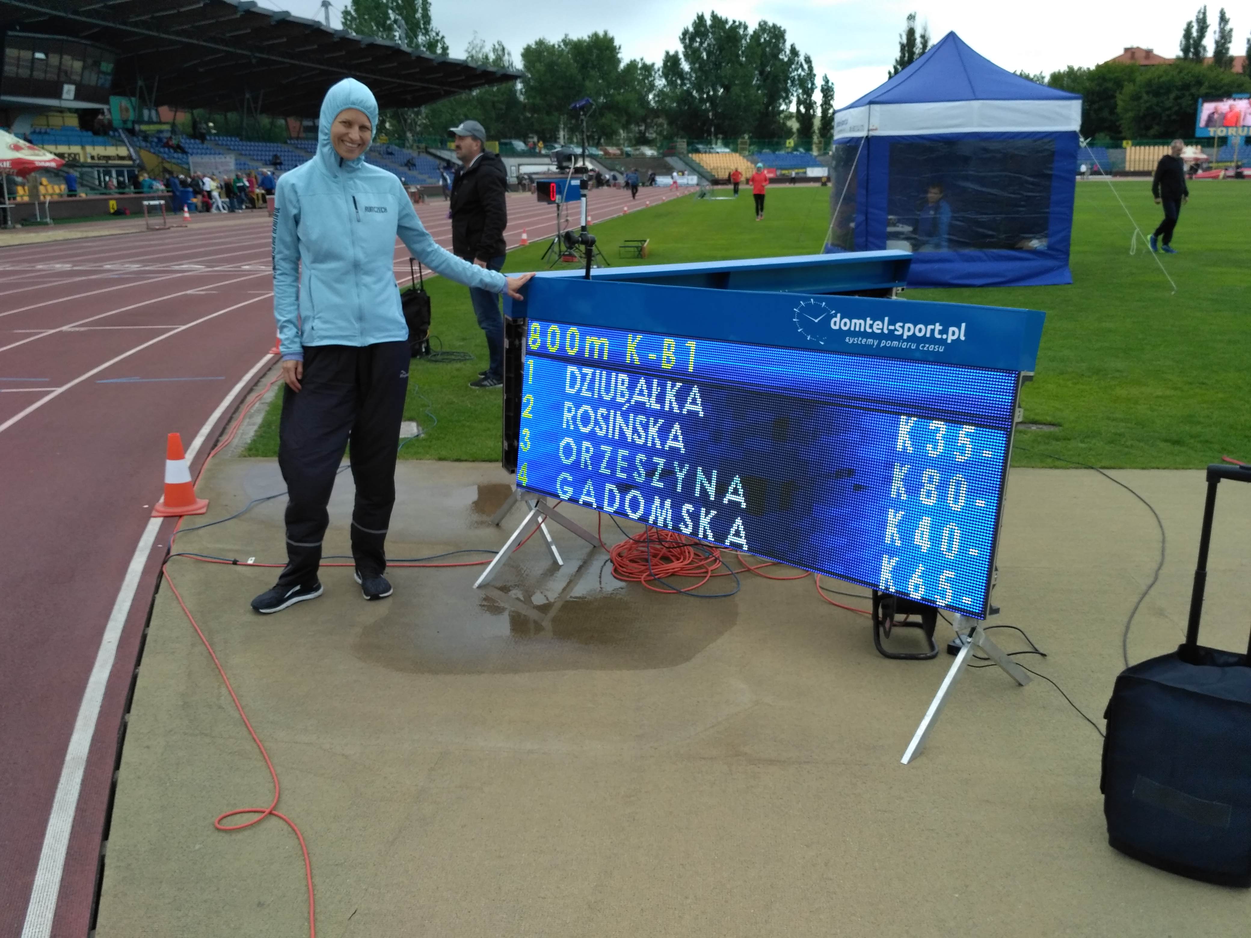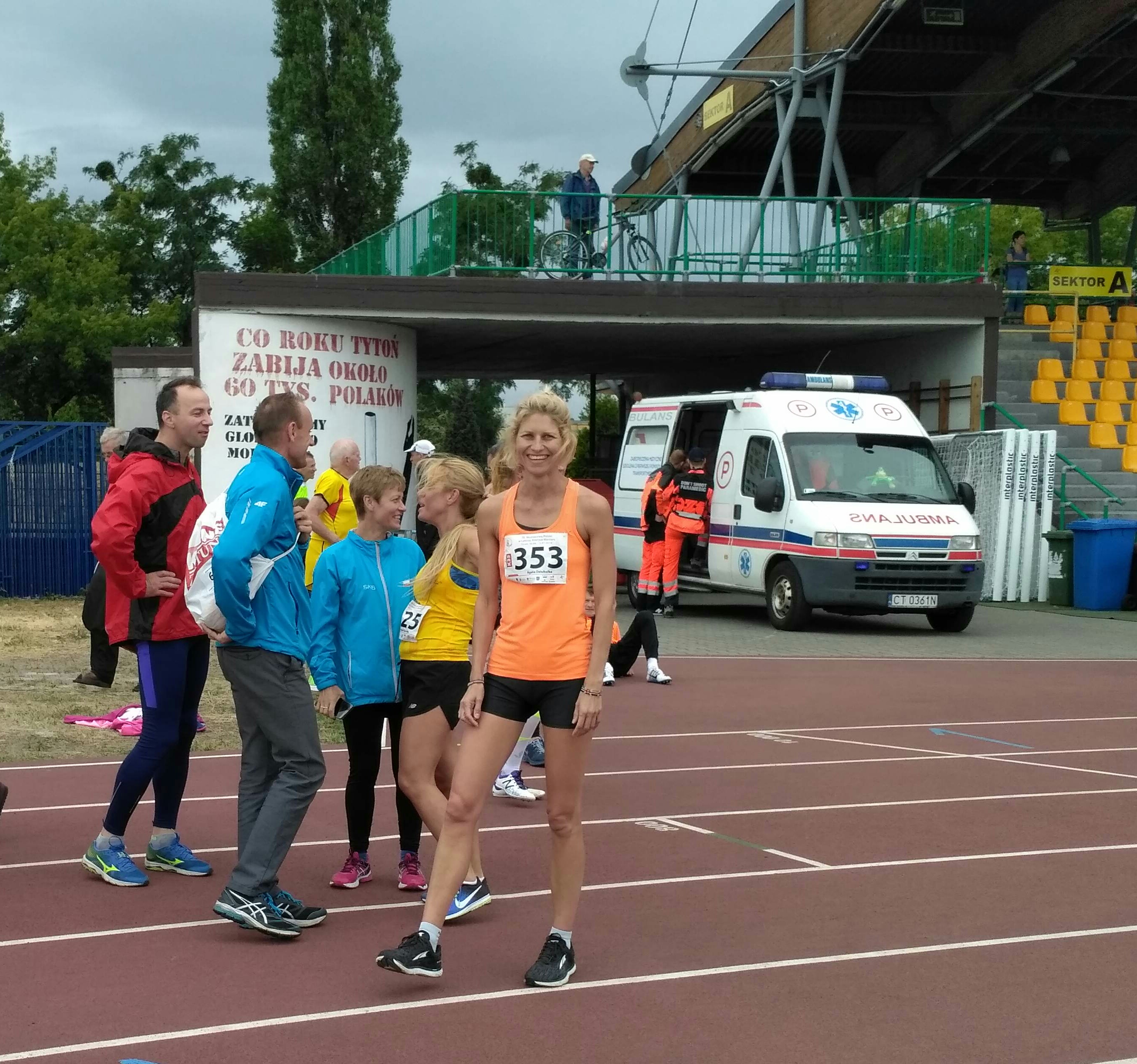 Dziś w Toruniu odbywał się drugi dzień Mistrzostw Polski w Lekkiej Atletyce Masters. Pogoda była jeszcze paskudniejsza niż wczoraj. Wiatr nie zelżał, do tego przelotnie padał deszcz. Mój start na 800 m trochę się opóźnił. Do rywalizacji ponownie stanęło blisko 20 kobiet, w kategoriach wiekowych od K35 do K80. Najstarsza uczestniczka, wszystkim znana pani Janina, startowała na kilku dystansach w ciągu tych dwóch dni mistrzostw. Zostałam ustawiona na pierwszym torze, właśnie z nią. Spodziewałam się, że stanie bardziej z tyłu, by nie blokować mi startu, ale wręcz przeciwnie, to ja zostałam zepchnięta do linii bocznej toru. Dostałam też kuksańca, bym uważała i nie nadeptywała na linię startu. Wystrzał startera dziś już mnie nie zaskoczył tak jak wczoraj. Yacool zakładał, że powinnam pobiec w granicach 2:50. Pierwsze 200 m pokonałam w 39 sekund, koło zamknęłam w 1:22. Ponownie czułam, że na początku drugiego koła mogłabym biec minimalnie szybciej, ale brak doświadczenia i obiegania dystansu sprawił, że nie byłam pewna swoich możliwości. Na przeciwległej prostej wiatr stawiał do pionu, ale dziś cały dystans biegłam za plecami innych uczestniczek. Na wyjściu z ostatniego łuku przyspieszyłam. Zrównałam się z panią Janiną, która kończyła pierwsze koło. Mijając zahaczyłam ją lekko. Wydaje mi się, że dość szeroko wychodziła z łuku… Powinnam bardziej wyjść na drugi tor. Nauczka na przyszłość. Trochę mnie to wybiło niestety z rytmu. Do mety dobiegłam z czasem 2:50:75. Wystarczyło to na brązowy medal w mojej kategorii wiekowej – mój pierwszy z imprezy mistrzowskiej. Jest niedosyt wynikowy zarówno z wczorajszego półtoraka jak i dzisiejszej osiemsetki, ale zdecydowanie oba dystanse przypadły mi bardzo do gustu.
