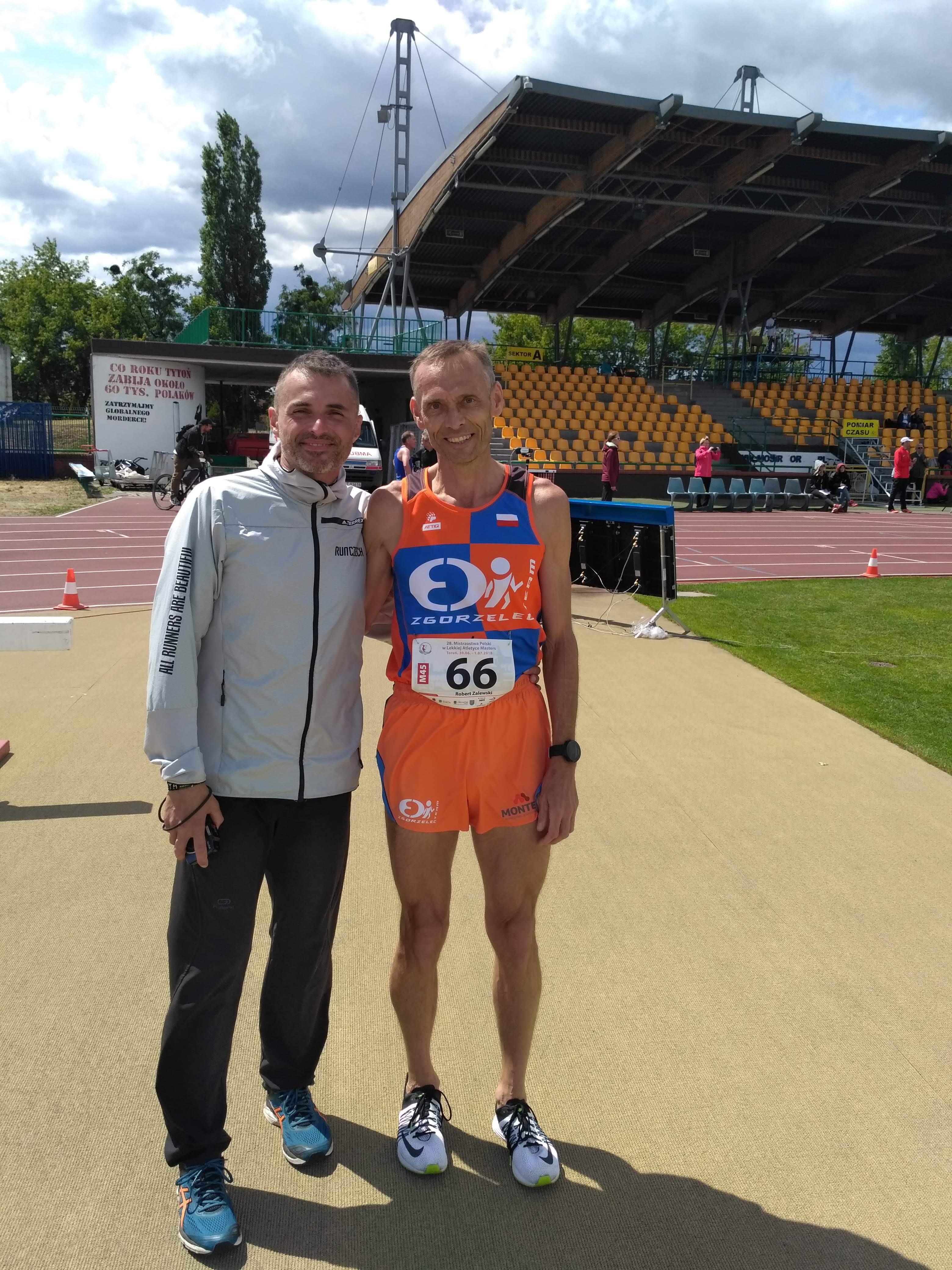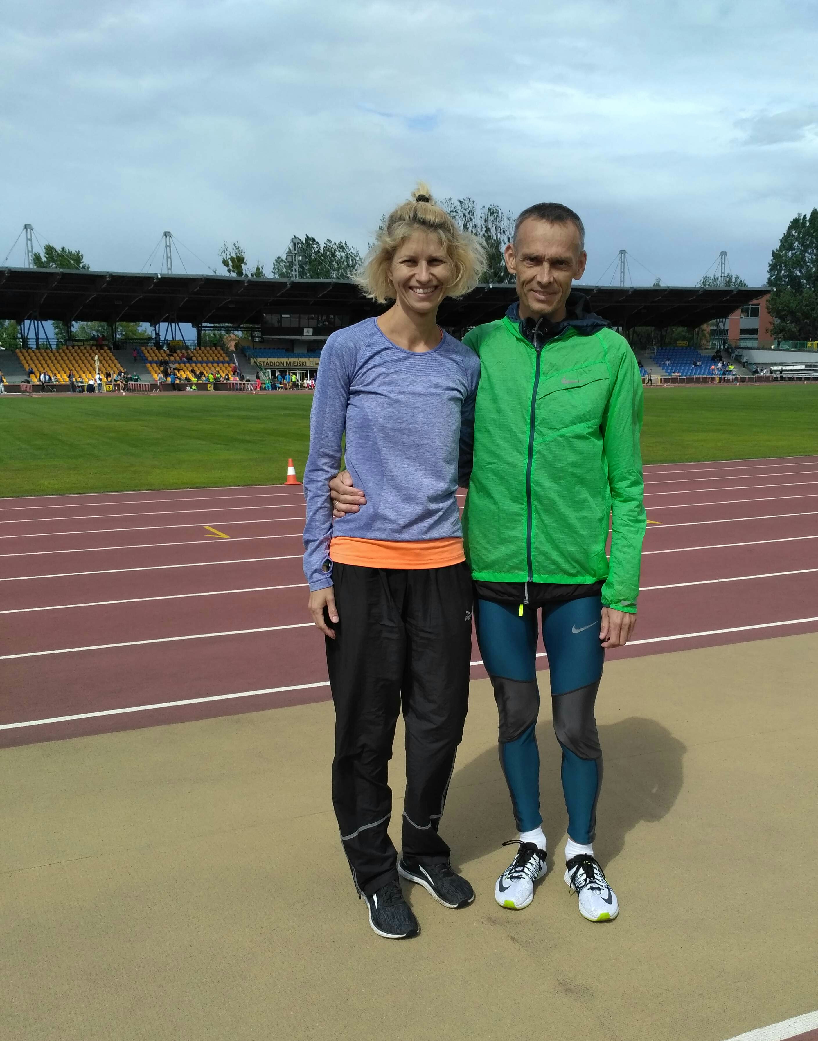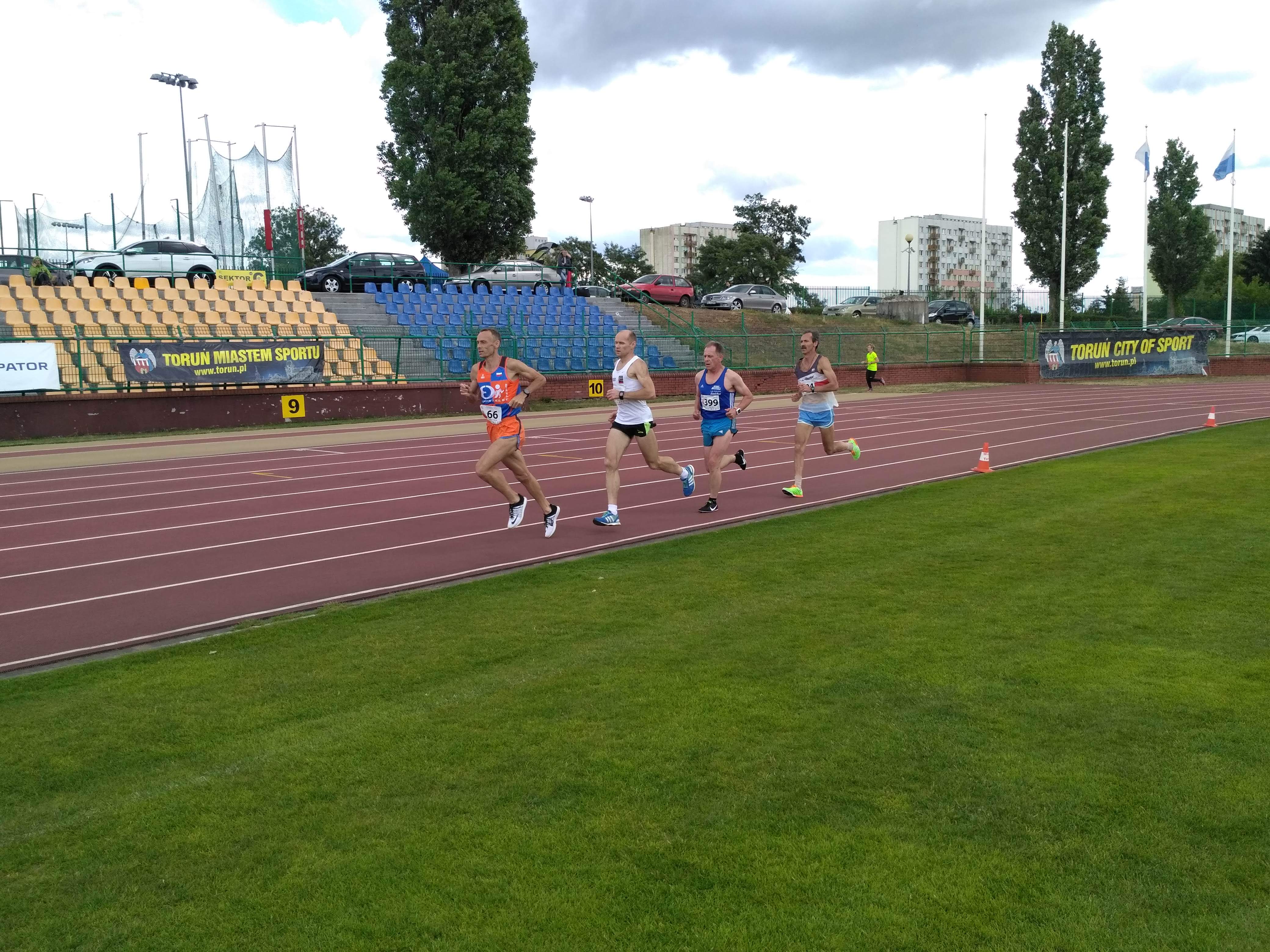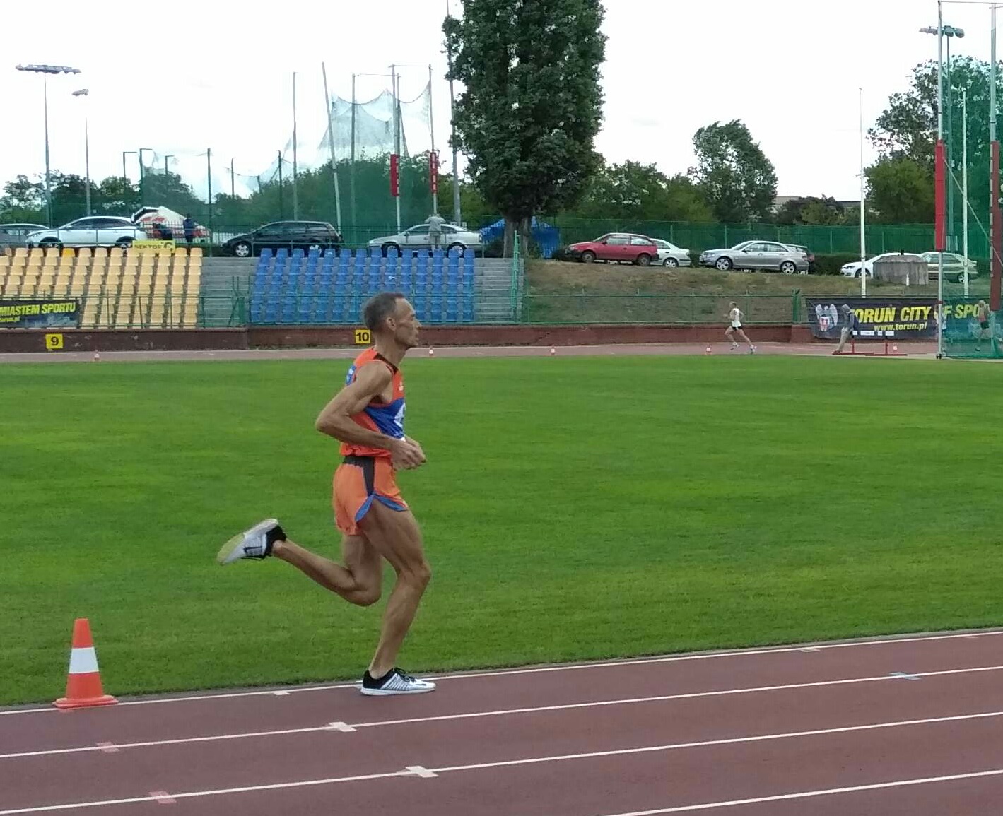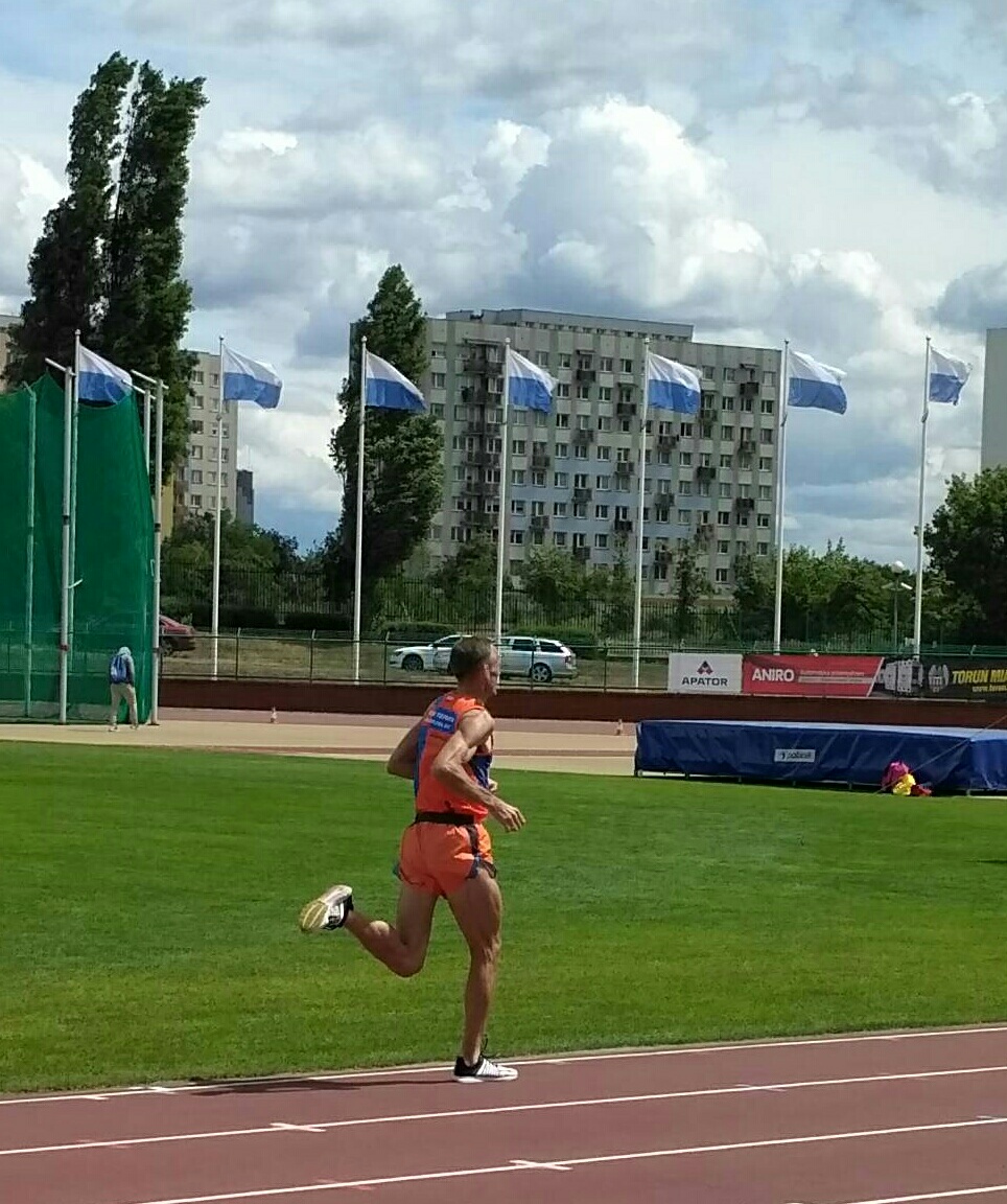 Robert, po całej nocy spędzonej w pociągu ze Zgorzelca przybył do Torunia o świcie. Gdy się spotkaliśmy rano na stadionie wyglądał na nieźle zmęczonego. Do tego pogoda z każdą godziną pogarszała się. Rozgrzewkę robił w deszczu i z czarnymi chmurami nad głową. Yacool też przetruchtał z nim kilka kółek. Ja ich ponagrywałam, by potem mogli siebie zanalizować. Robert stwierdził, że spokojnie do czasu jego biegu wyjdzie słońce. I faktycznie tak się stało! Choć wiatr nadal mocno dokuczał. Bieg na 5000 m panowie rozpoczęli dość wolno, po 3:46/km. Do drugiego kilometra Robert przewodził grupce. W kolejnym etapie na czoło wyszedł inny z zawodników, biegnący do tej pory za plecami Roberta, tempo wzrosło i to on ostatecznie zwyciężył. Robert dobiegł na drugim miejscu z dużą przewagą nad kolejnymi biegaczami, zdobywając tym samym srebrny medal w kategorii M45.