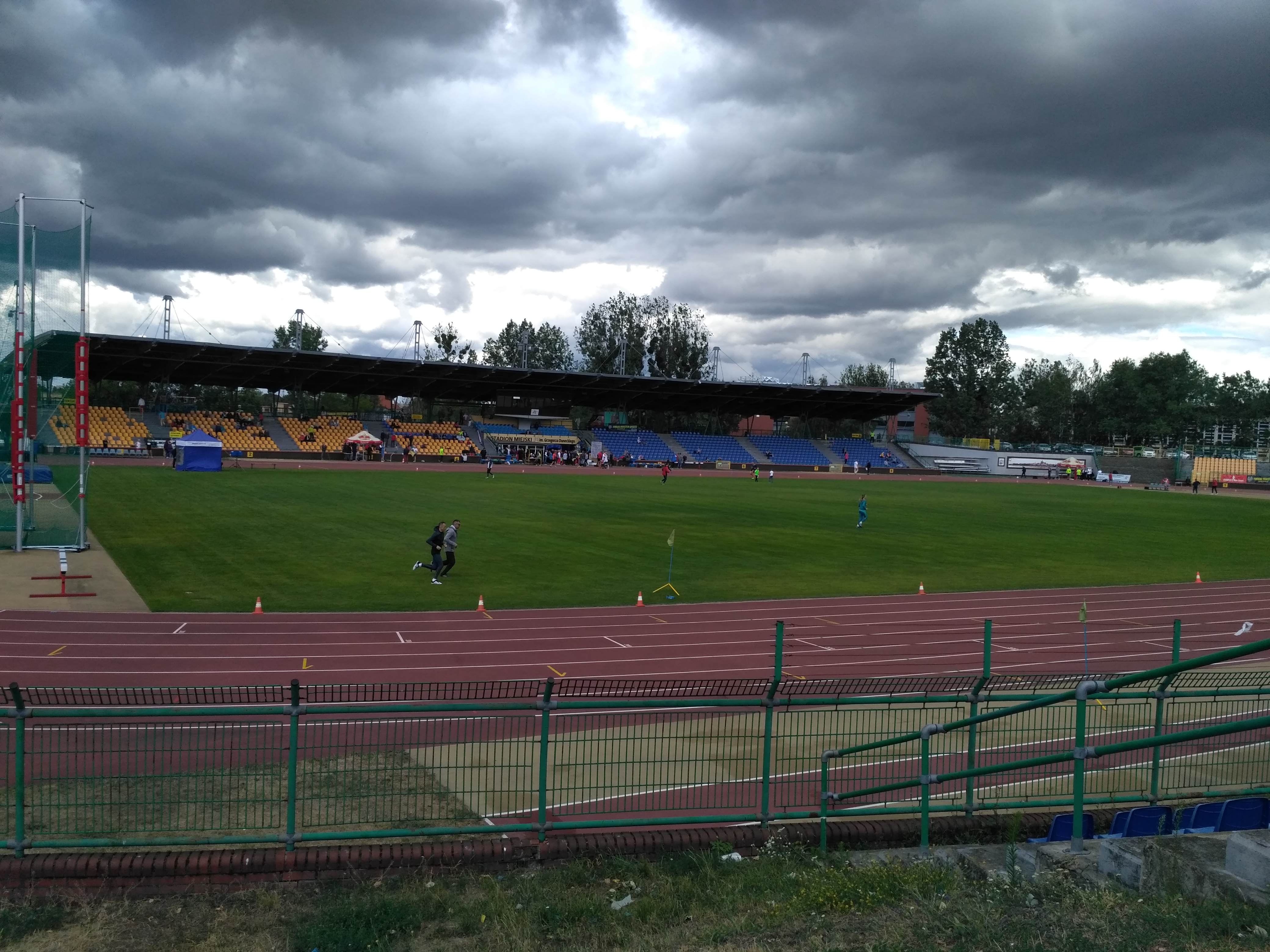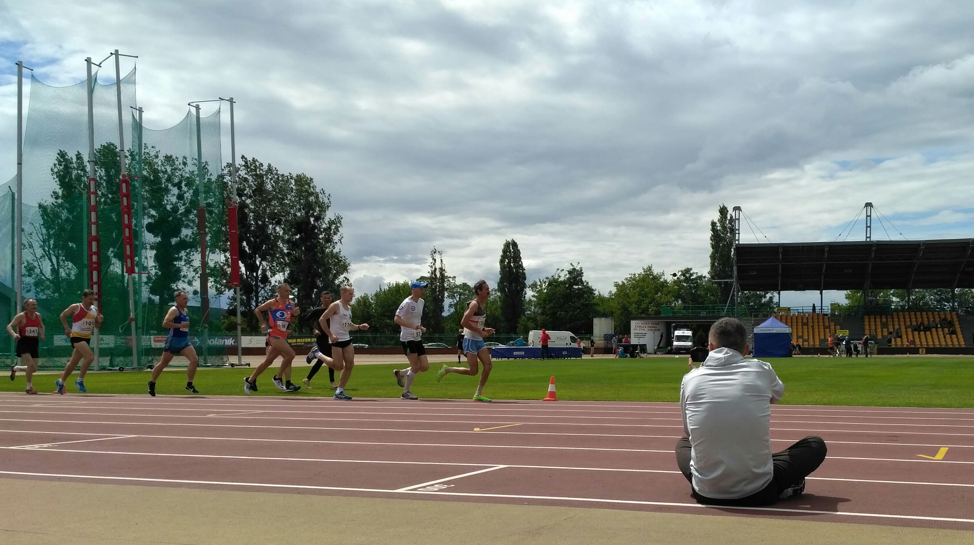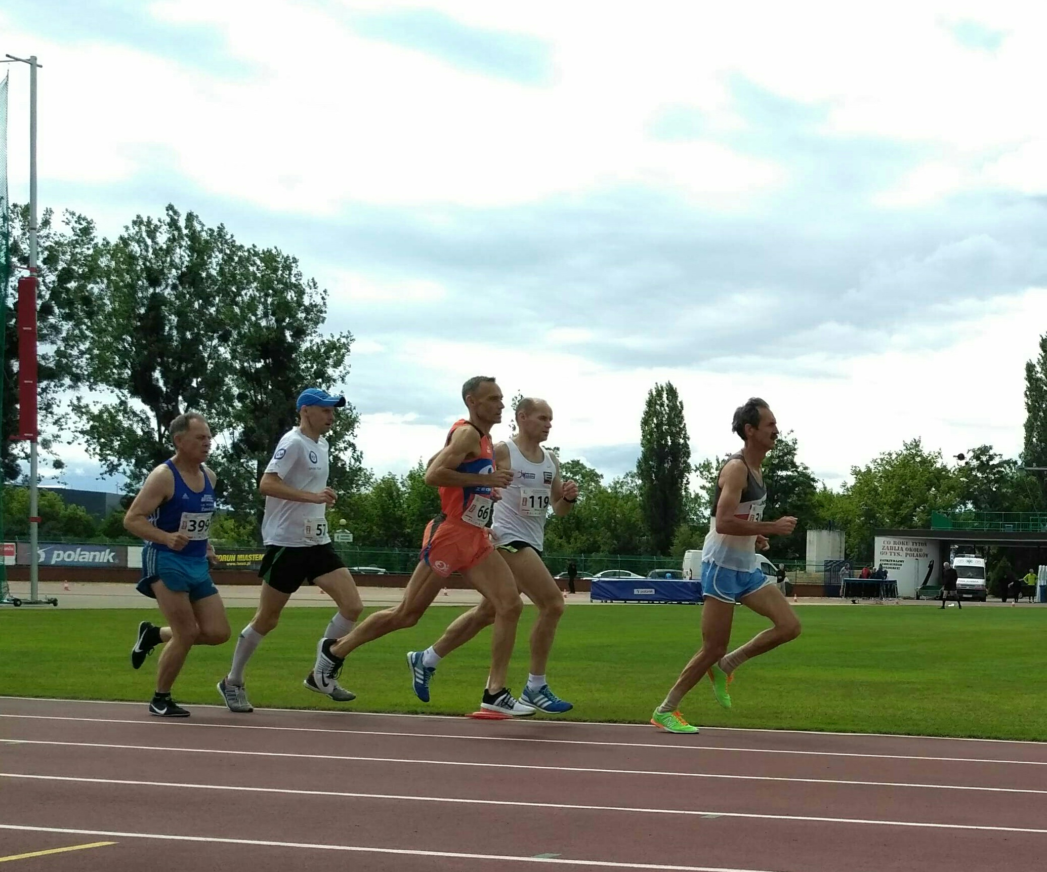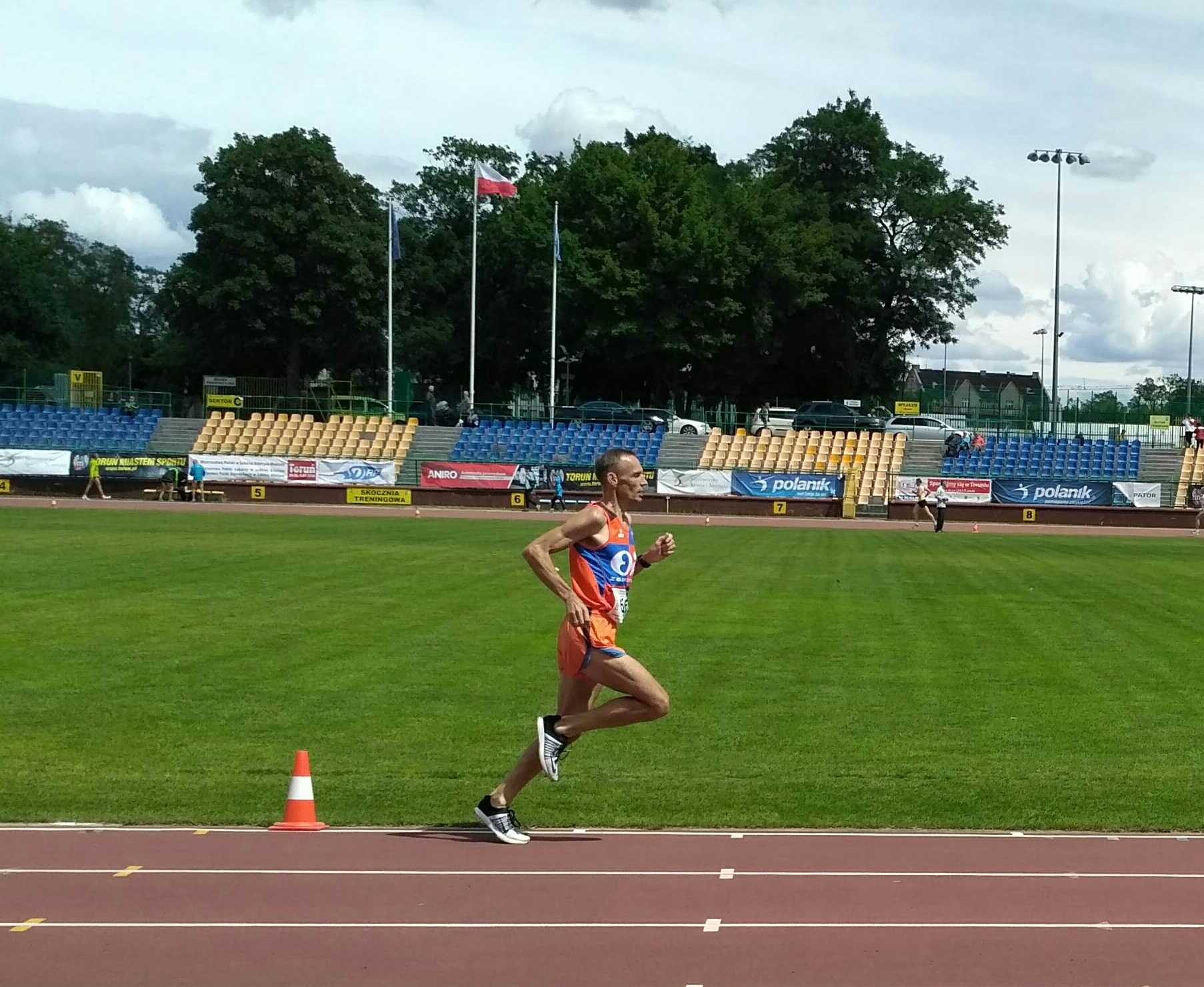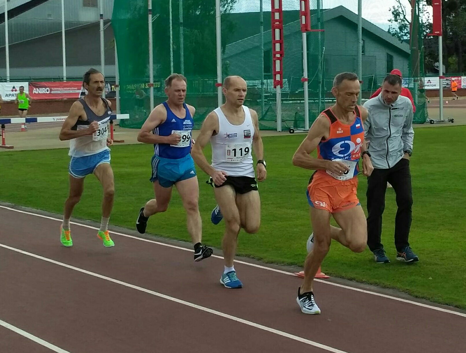 Robert, po całej nocy spędzonej w pociągu ze Zgorzelca przybył do Torunia o świcie. Gdy się spotkaliśmy rano na stadionie wyglądał na nieźle zmęczonego. Do tego pogoda z każdą godziną pogarszała się. Rozgrzewkę robił w deszczu i z czarnymi chmurami nad głową. Yacool też przetruchtał z nim kilka kółek. Ja ich ponagrywałam, by potem mogli siebie zanalizować. Robert stwierdził, że spokojnie do czasu jego biegu wyjdzie słońce. I faktycznie tak się stało! Choć wiatr nadal mocno dokuczał. Bieg na 5000 m panowie rozpoczęli dość wolno, po 3:46/km. Do drugiego kilometra Robert przewodził grupce. W kolejnym etapie na czoło wyszedł inny z zawodników, biegnący do tej pory za plecami Roberta, tempo wzrosło i to on ostatecznie zwyciężył. Robert dobiegł na drugim miejscu z dużą przewagą nad kolejnymi biegaczami, zdobywając tym samym srebrny medal w kategorii M45.