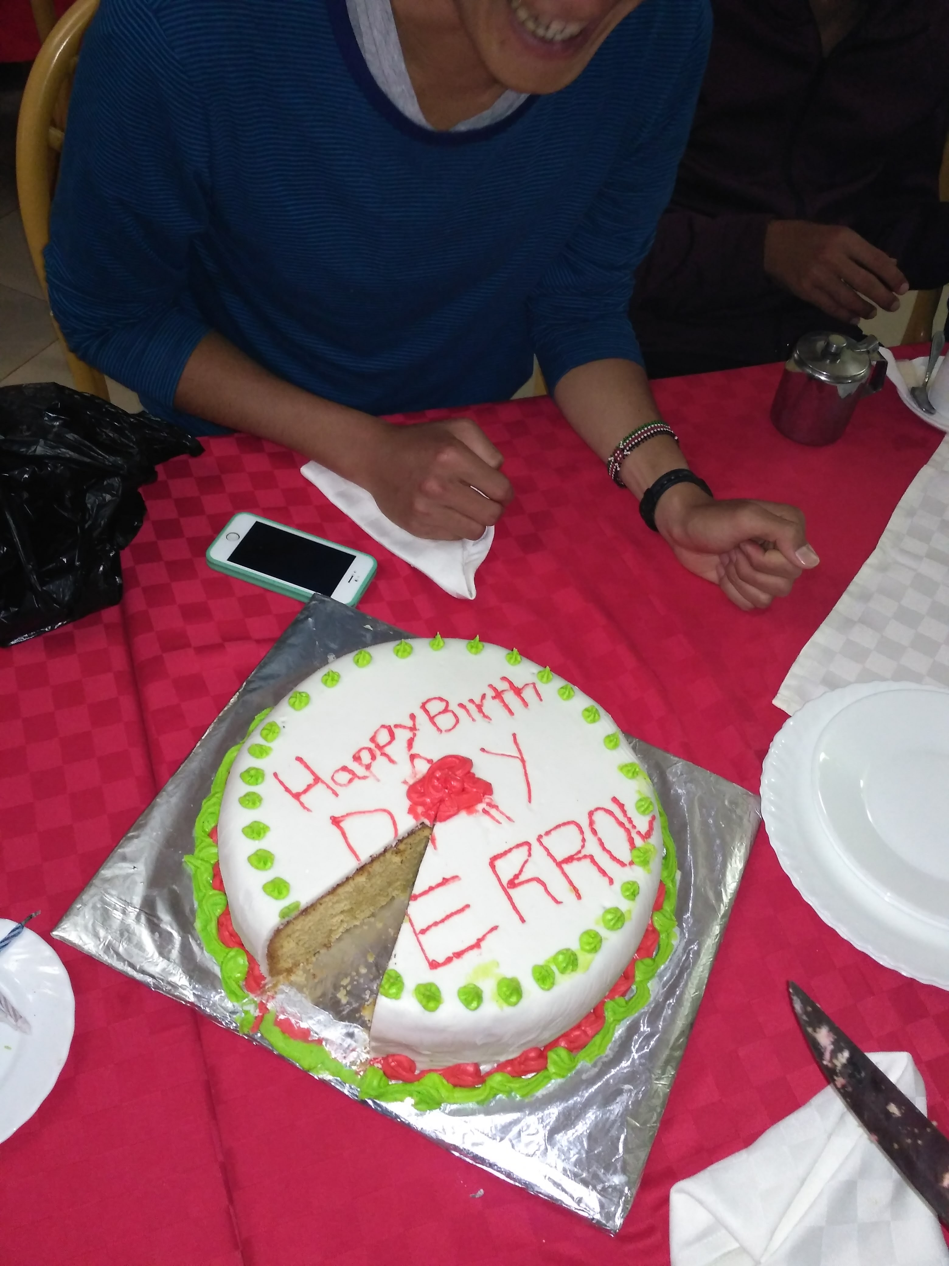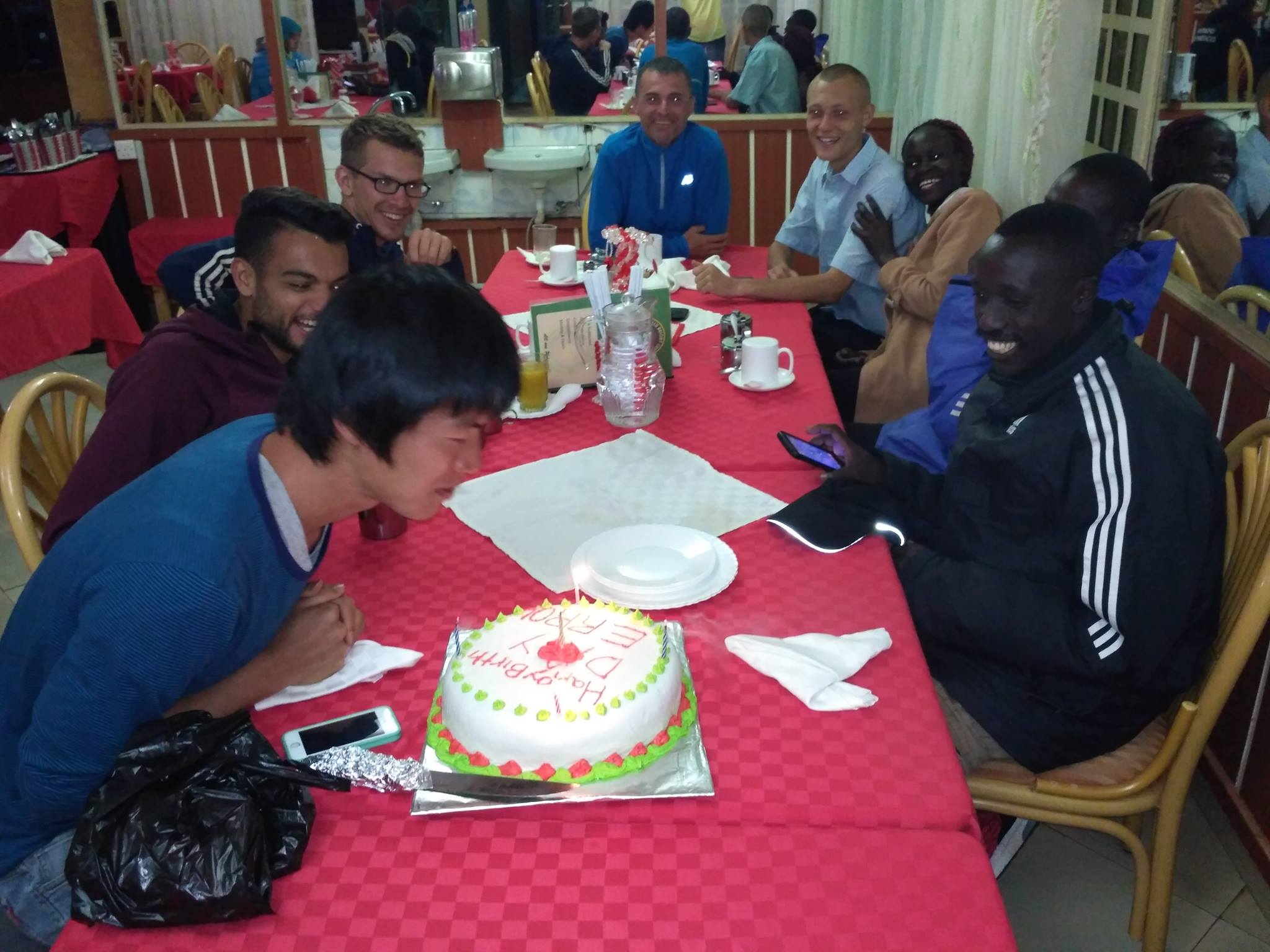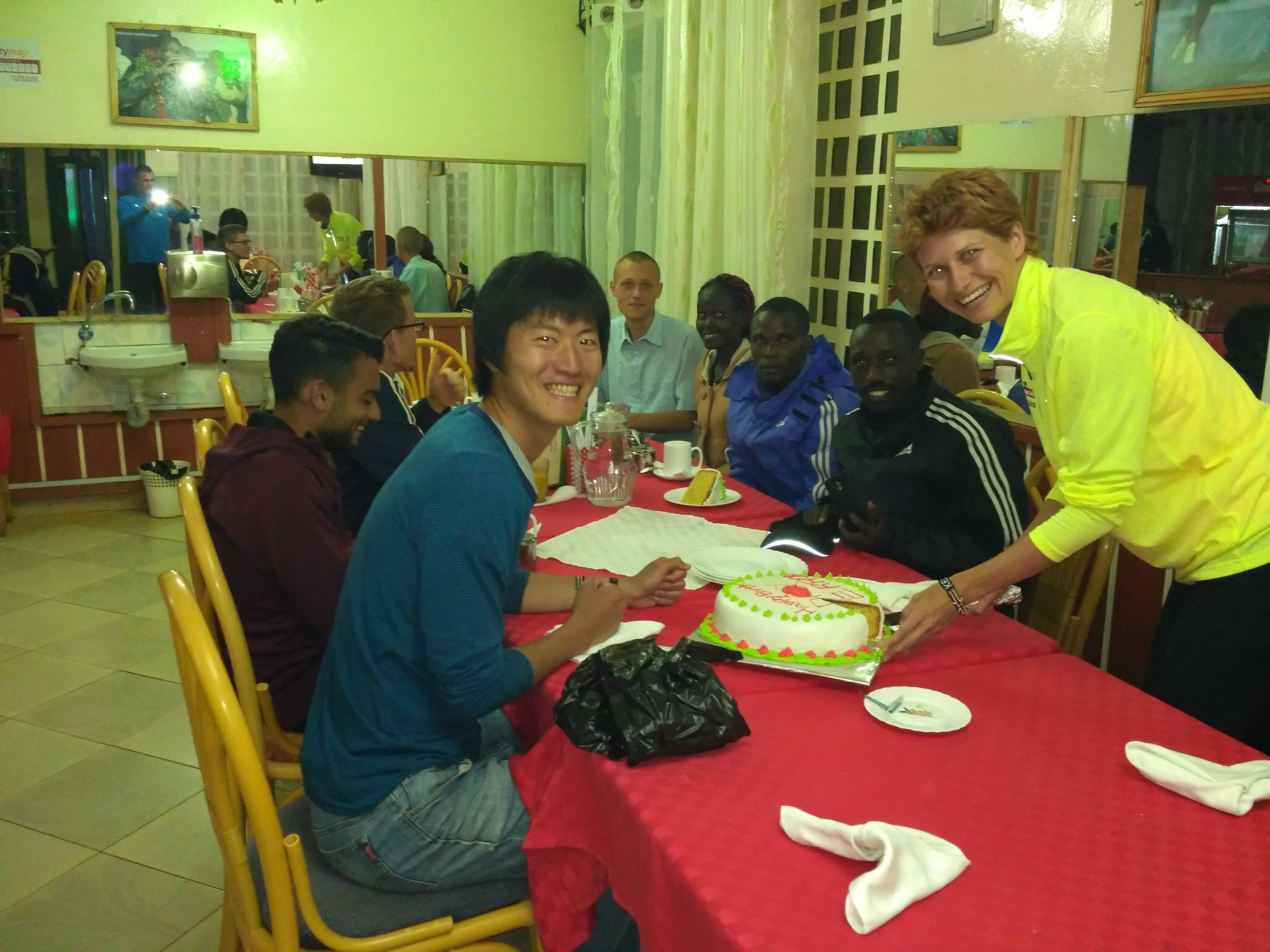 Dogadaliśmy szczegóły wyjazdu, godzinę i miejsce zbiórki. Zaznaczyłam wyraźnie, że ma to być 5:30 czasu europejskiego, a nie kenijskiego czyli, że mają się stawić punktualnie. Chłopaki wydają się słowne, jeden jest bratem naszego znajomego biegacza, który zrobił z nami kilka treningów, drugi to jego wujek. Żaden z nich nie był jeszcze w tym parku. Z wcześniejszych informacji wiedziałam, że dojazd tam zajmie około 2h. Kenijczycy w pierwszej chwili powiedzieli, że przynajmniej 4-5h. Potem zeszli do około 2,5h. Mam nadzieję, że będą znać drogę i że nie ładuję nas znowu na jakąś turystyczną minę… Potem razem z Meshackiem i Reubenem pojechaliśmy do hotelu. Dziś Tajwańczyk miał urodziny i zrobiliśmy sobie multikulti spotkanie. Wcześniej Errol zamówił u naszej kucharki w Keellu tort. Postarała się, upiekła biszkopt i przyozdobiła go. Były też świeczki. Odśpiewaliśmy mu 100 lat po polsku, libańsku i angielsku. Okazało się, że w suahili nie śpiewają sto lat. Errol dostał prezenty. Po tej wpadce ze skarpetkami dostał od wszystkich skarpety. Ciemne, by nie musiał tak często prać.