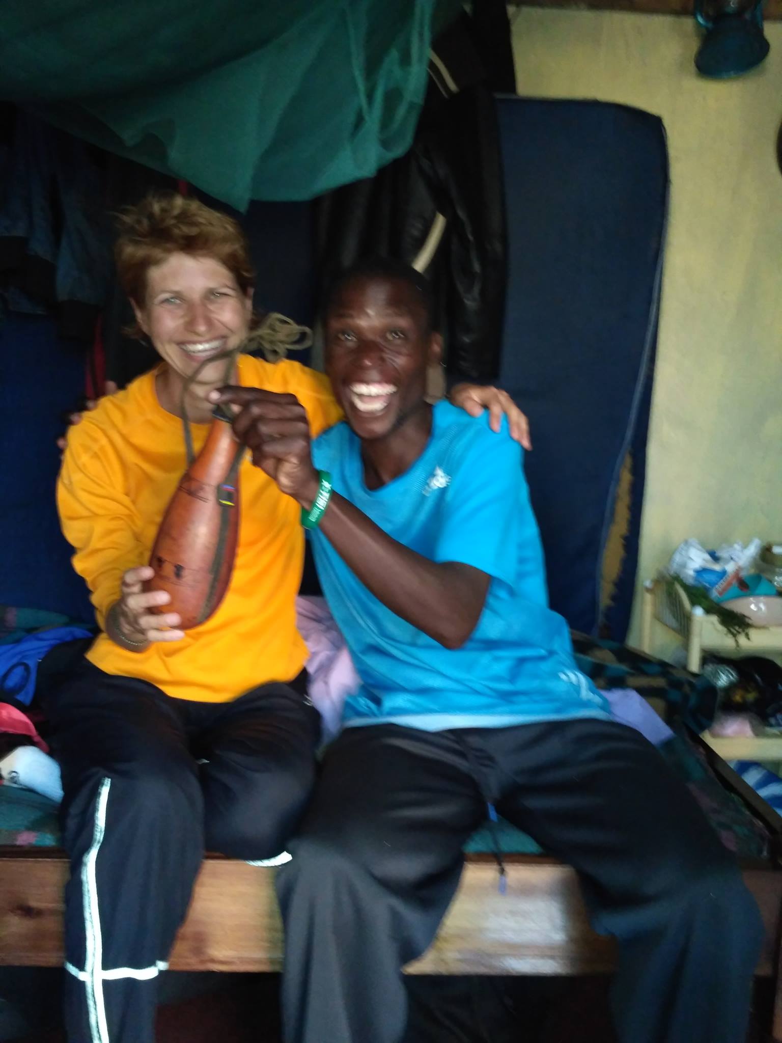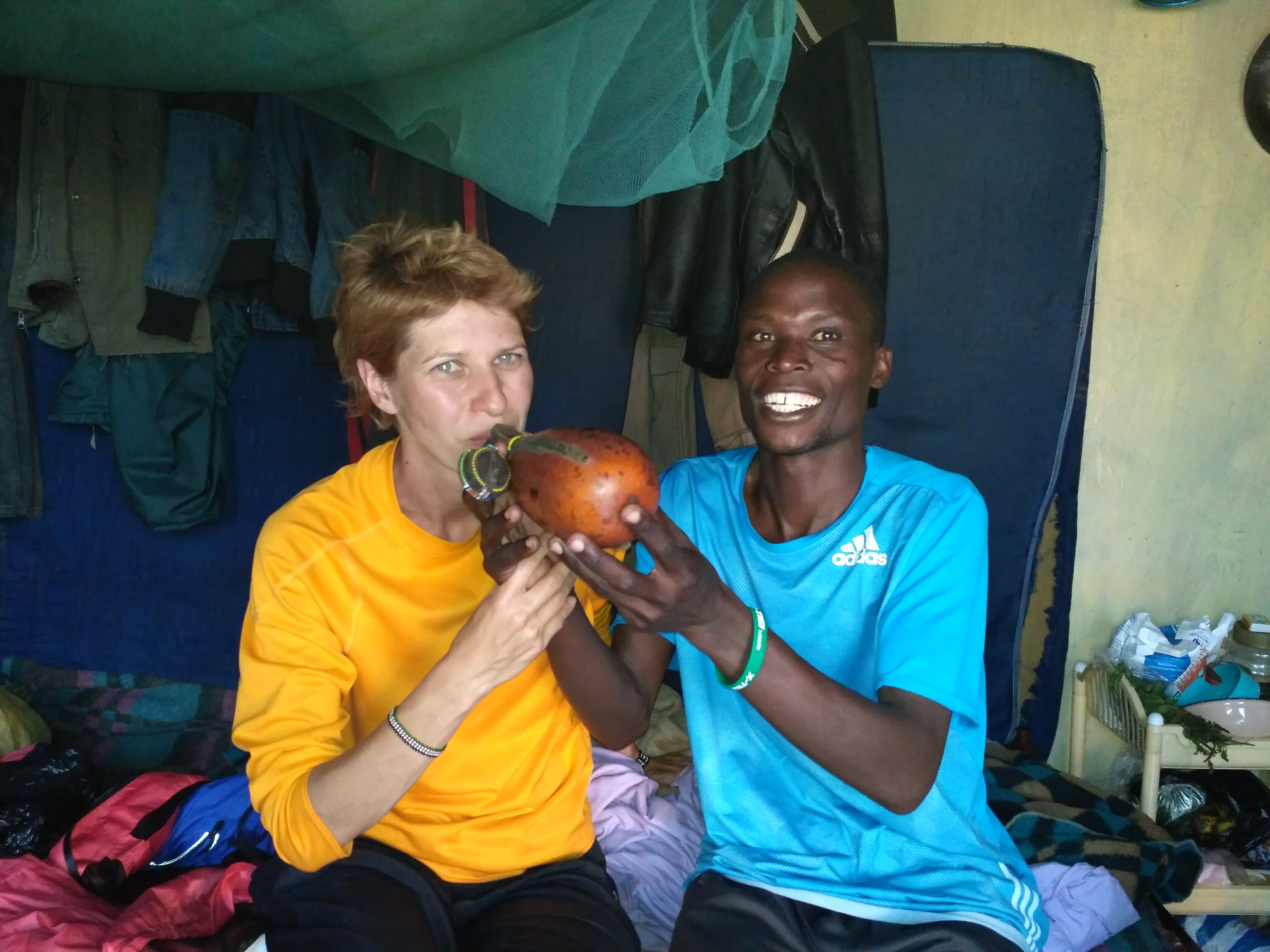 Po południu poszliśmy odwiedzić Reubena i Meshacka. Kupiliśmy Meshackowi dwie siatki owoców. Poczęstował nas gorącym kakao. Na ścianie w jego pokoju zobaczyłam tykwę. Zachwyciłam się nią, bo taką właśnie chciałam sobie sprawić na pamiątkę z naszego pobytu. Meschack zareagował na mój entuzjastuczny okrzyk pytając nieśmiało, czy może mi ją podarować. Uściskałam go z całych sił w podziękowaniu. Zwłaszcza, że powiedział, że to oryginalne naczynie, w którym wcześniej w jego domu przechowywano mleko. Teraz wisiało na ścianie nie używane.