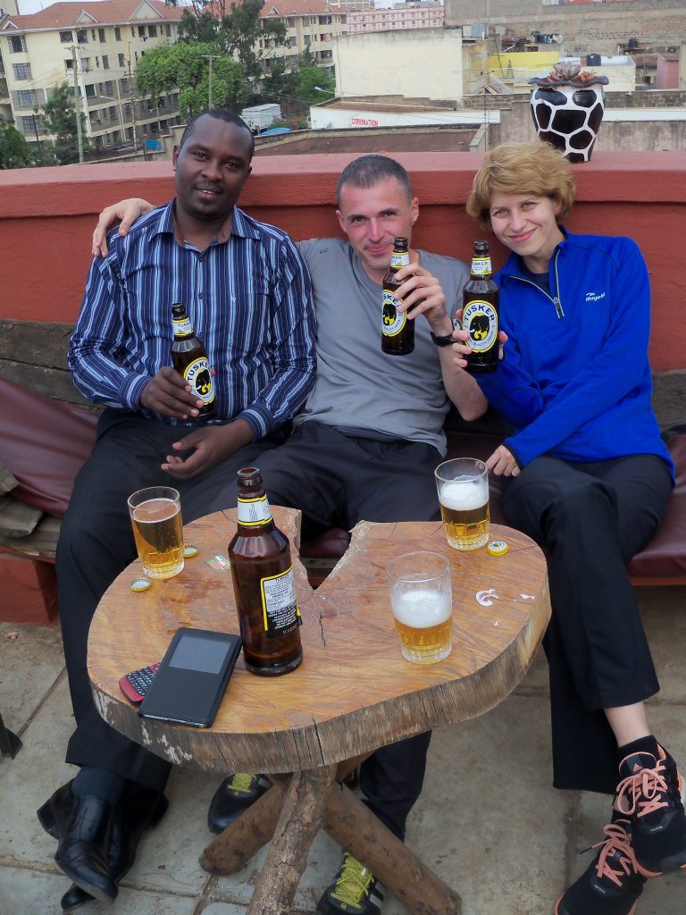 6:00 p.m. Siedzimy z naszymi kenijskimi znajomymi na dachu hotelu i pijemy Tuskera. Fantastyczny pierwszy dzień w Afryce.