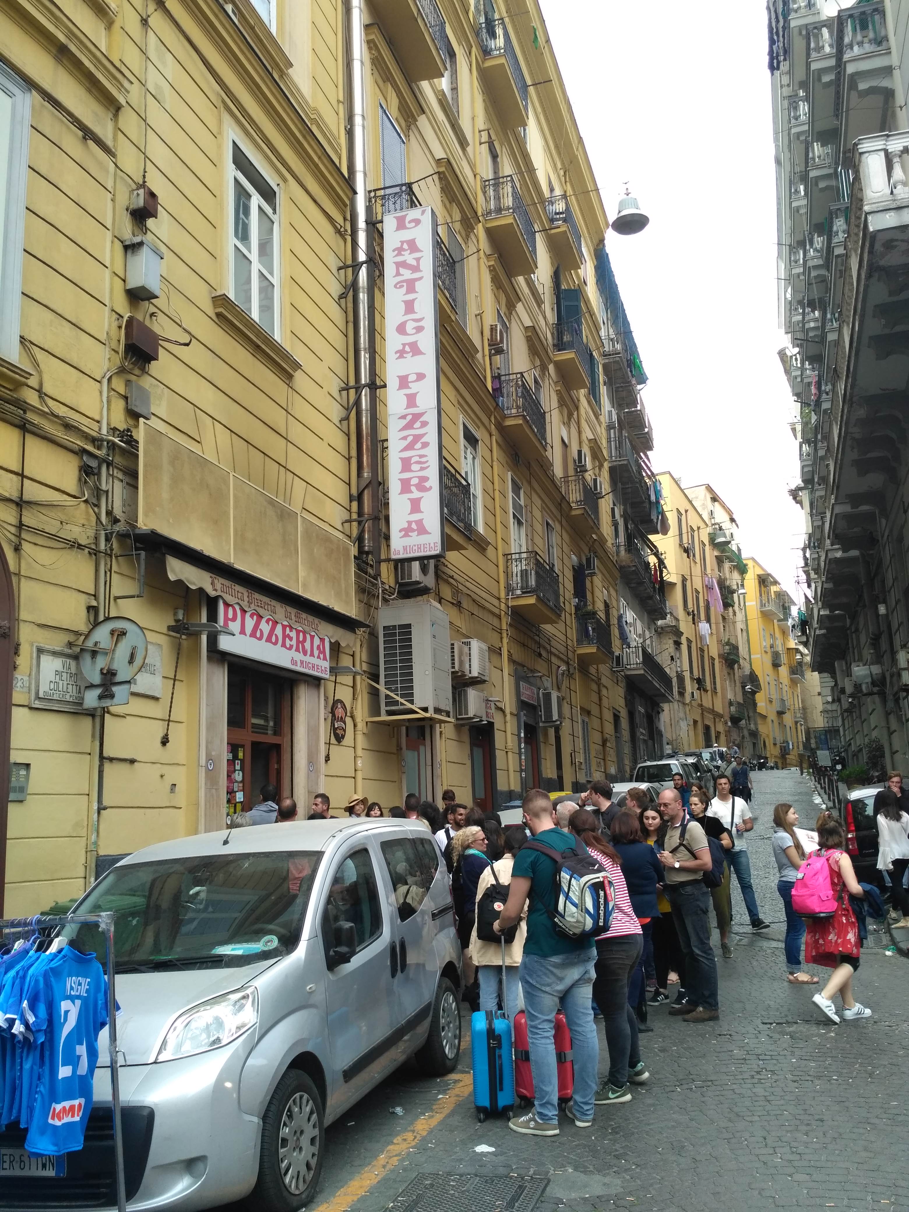 Przed wyjazdem wertowałem internet w poszukiwaniu podpowiedzi, gdzie w Neapolu można zjeść najlepszą pizzę. Kilka razy trafiałam na zachwyty nad pizzerią „da Michelle”. Były też wzmianki, że w kolejce, by zdobyć stolik w tej knajpie czeka się często ponad godzinę. Kiedy tam trafiliśmy przed lokalem stała gromada ludzi. Odpuściliśmy sobie stanie w kolejce. Byliśmy zmęczeni podróżą i głodni „na już”. Poza tym samo miejsce i otoczenie wyglądało mało zachęcająco. W ogóle Neapol nam się nie podoba, jest brudno, głośno i panuje ogólny bałagan. Zupełnie inne wrażenie niż Walencja, którą byłam zachwycona. Mimo to, Janek stwierdził później, że po tym jak zjadł tu pizzę i stał w tutejszych korkach, czuje się jak w domu.