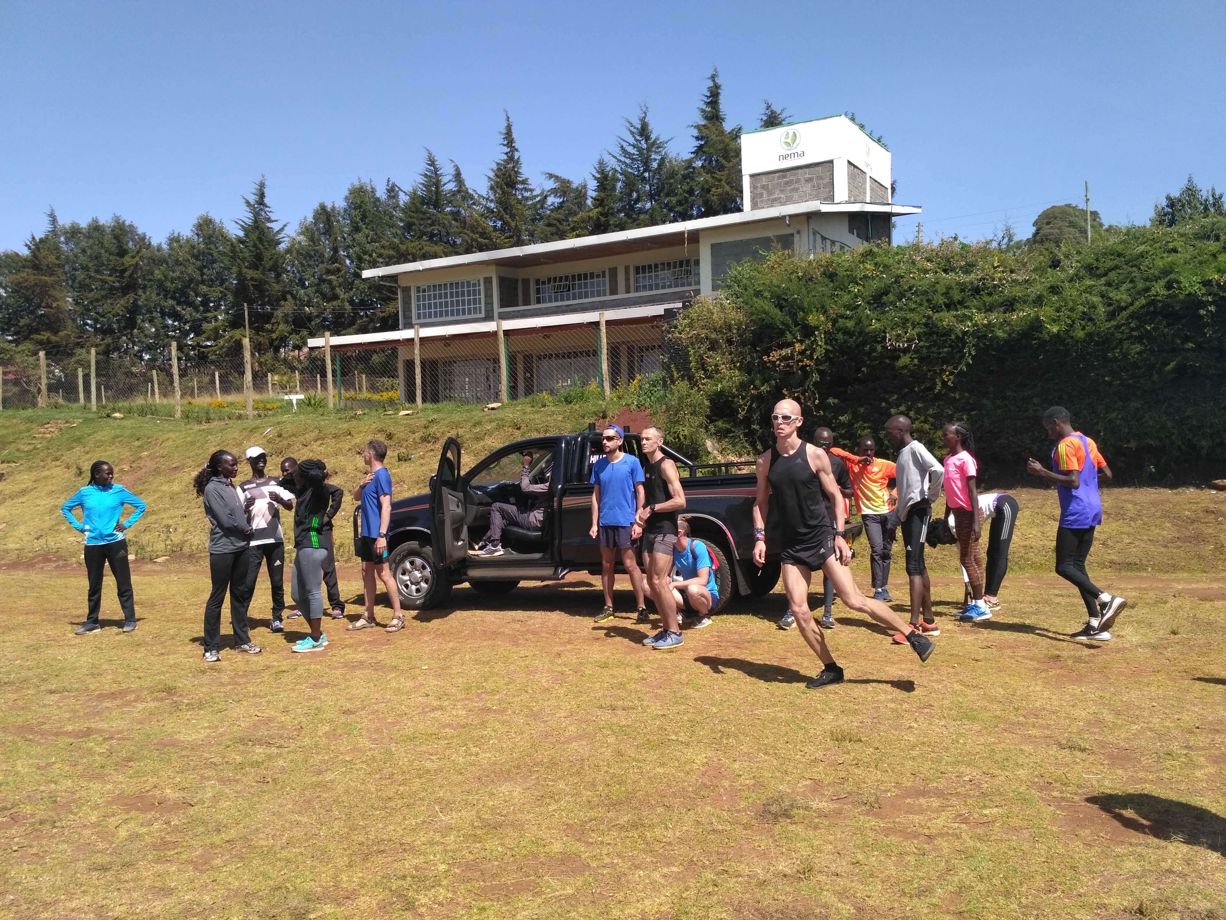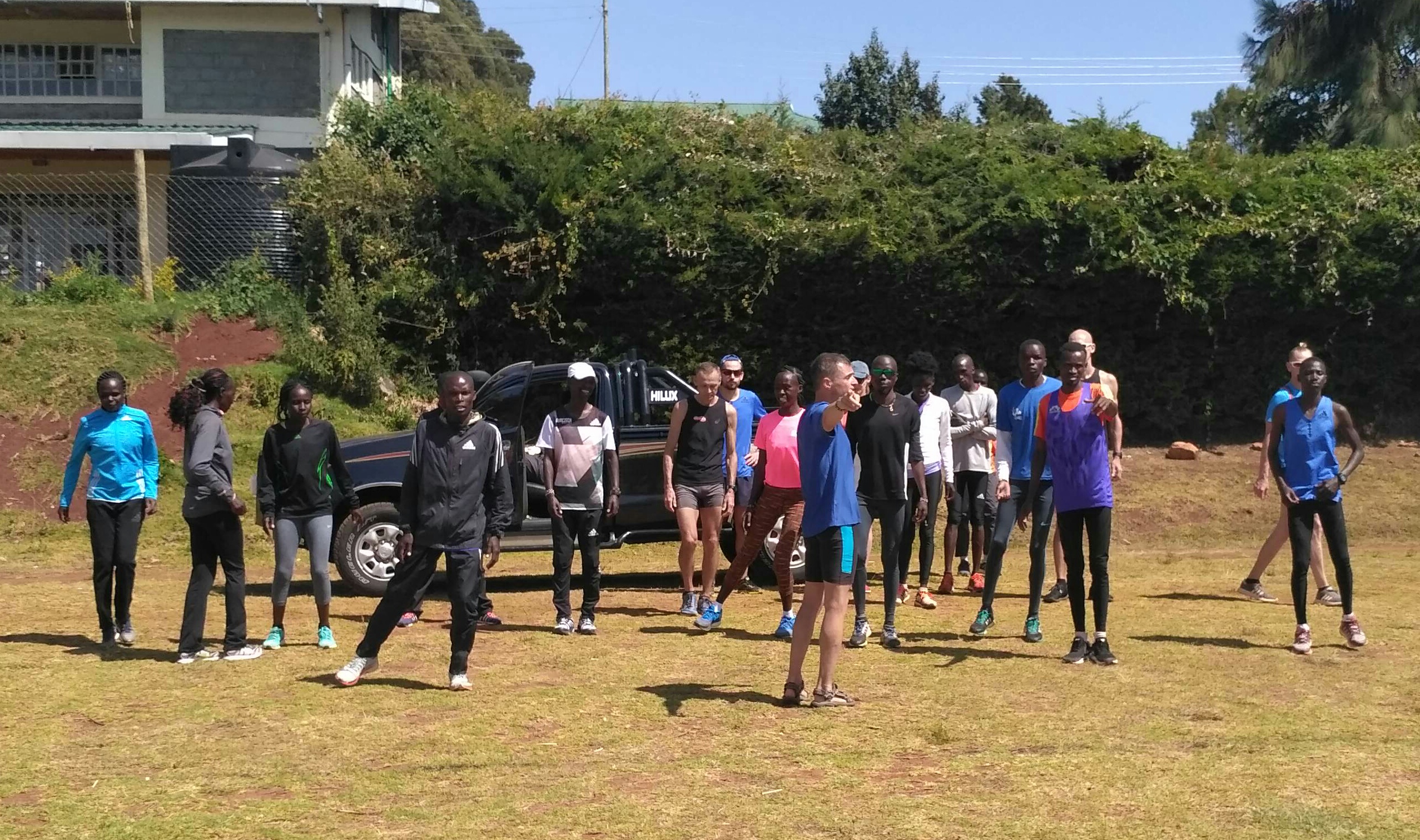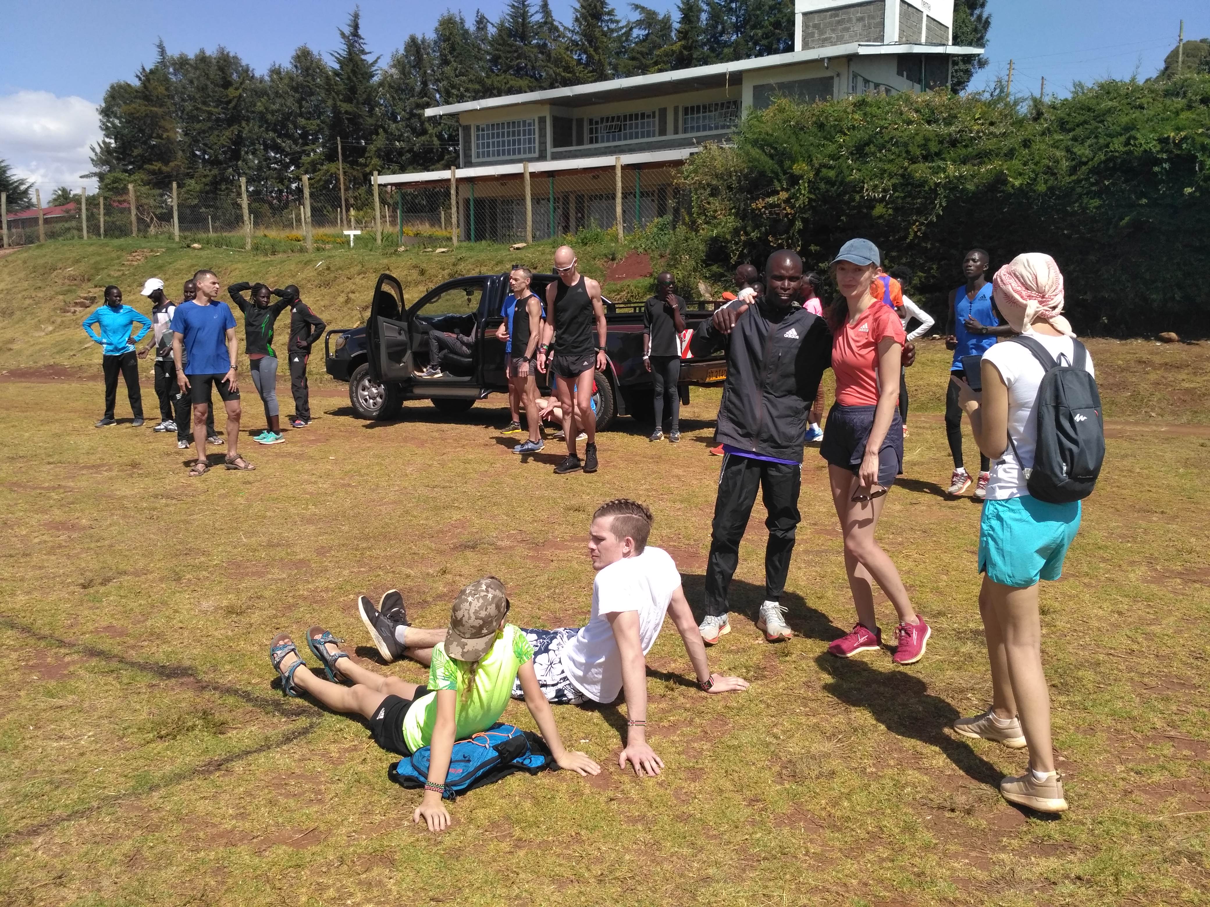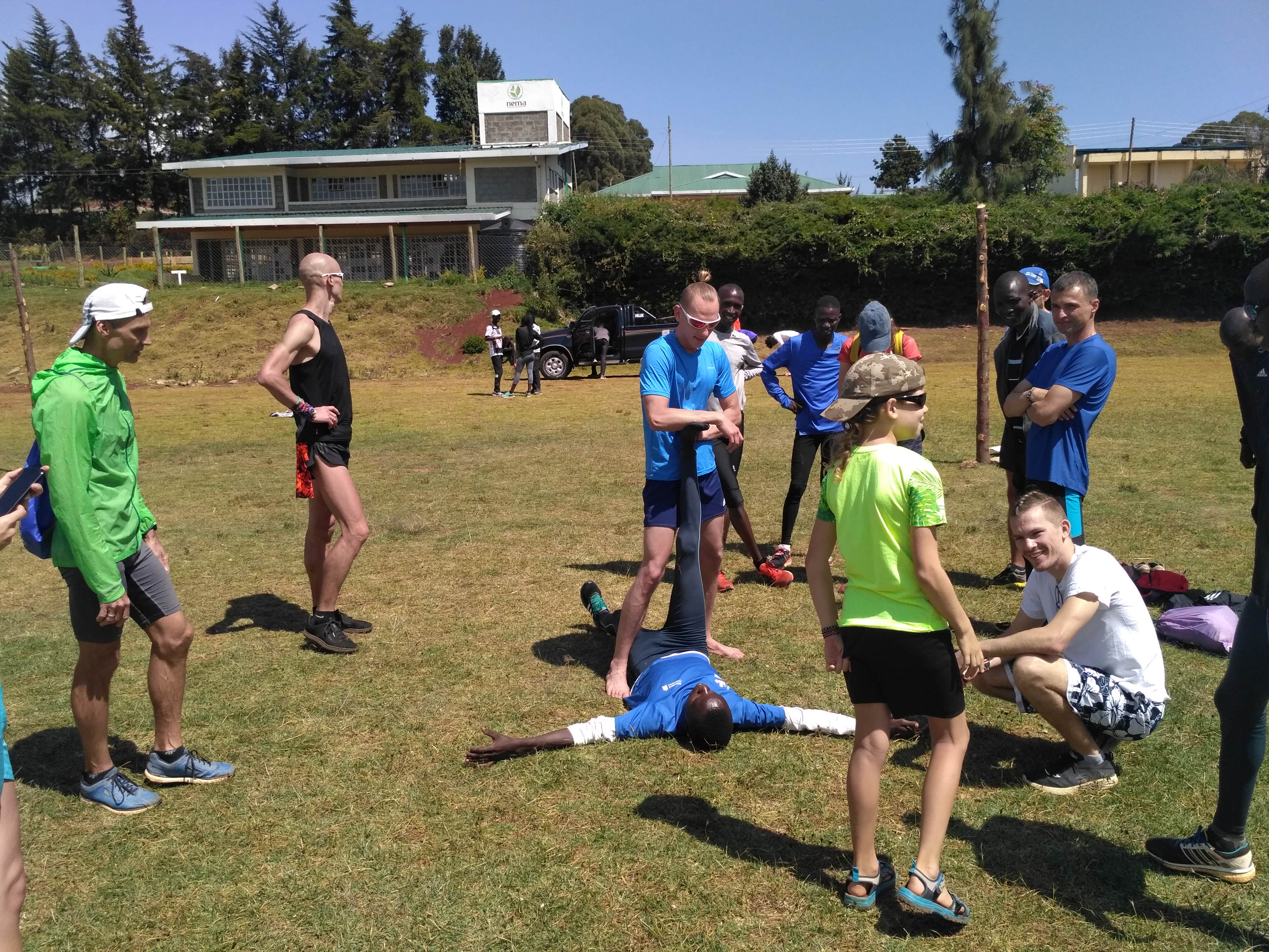 Ze wszystkimi spotkaliśmy się na boisku. Była tam też ekipa coacha Eryka. Yacool przeprowadził z naszymi i kenijskim biegaczami ostatni trening techniczny. Były ćwiczenia aktywizujące pracę mięśni pośladkowych, łapanie sprężyny w truchcie, bieganie z kijem dla zatrzymania rotacji obręczy barkowej. Z pick-upa coacha dochodziły głośne dźwięki muzyki Kalenjin, w rytm której wykonywali zadania. Wszyscy świetnie się bawili.