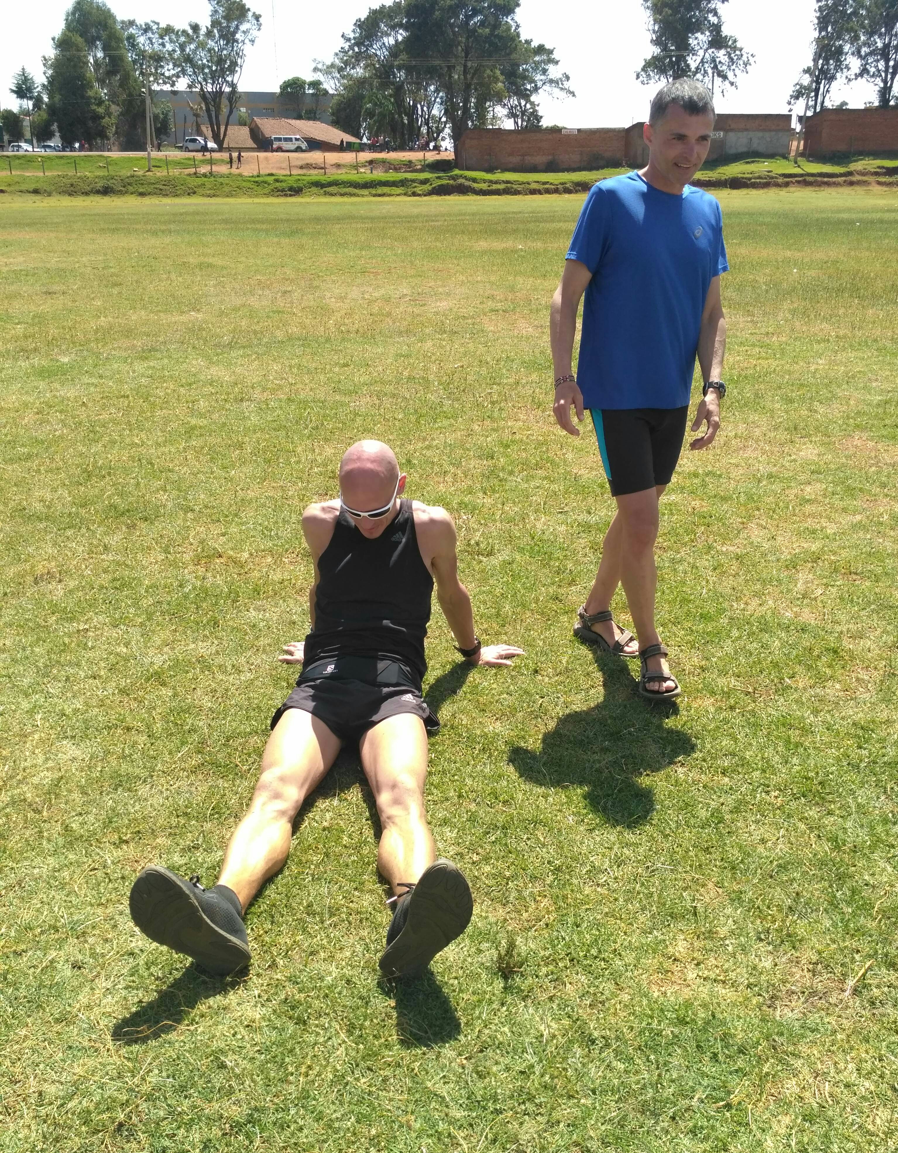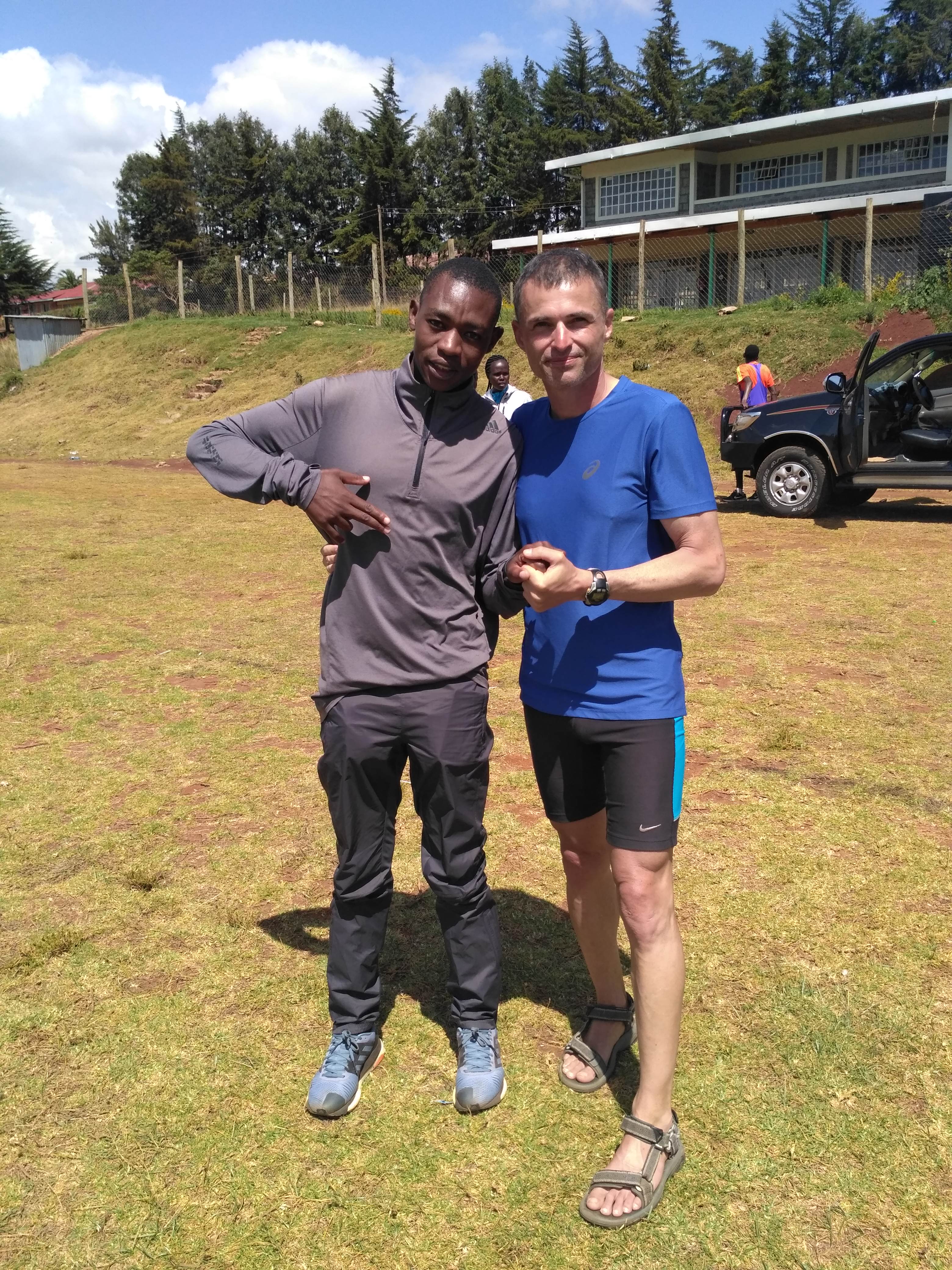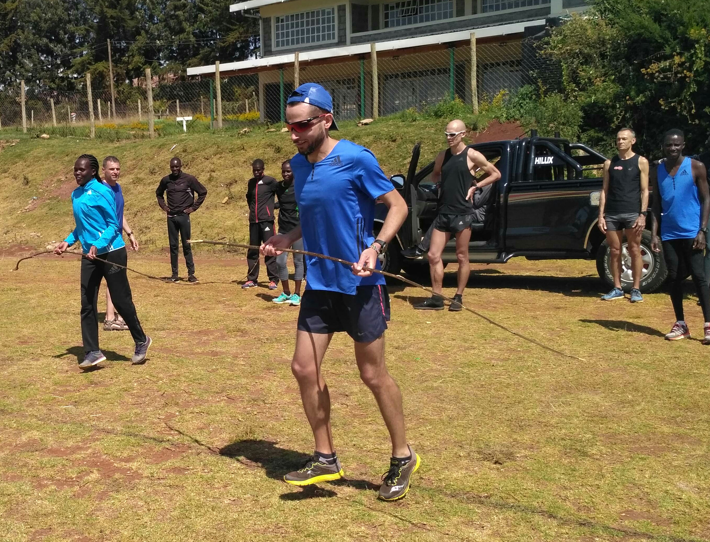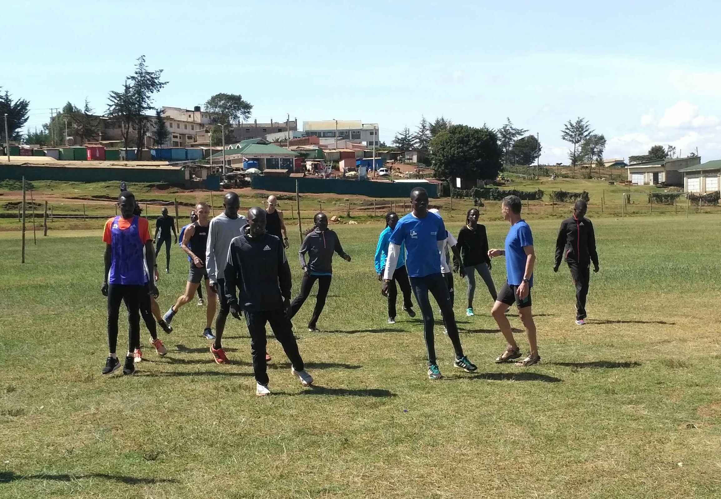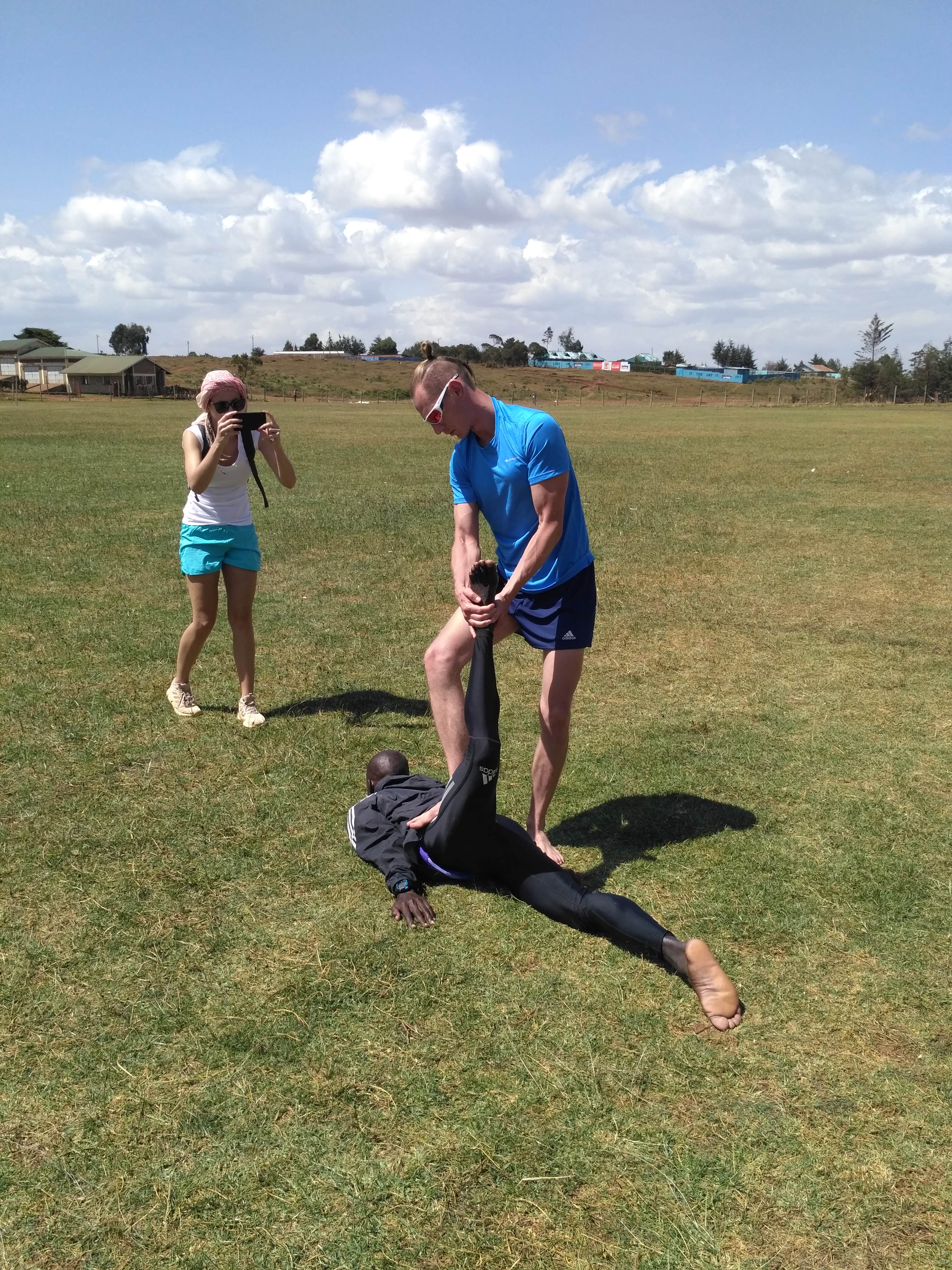 Ze wszystkimi spotkaliśmy się na boisku. Była tam też ekipa coacha Eryka. Yacool przeprowadził z naszymi i kenijskim biegaczami ostatni trening techniczny. Były ćwiczenia aktywizujące pracę mięśni pośladkowych, łapanie sprężyny w truchcie, bieganie z kijem dla zatrzymania rotacji obręczy barkowej. Z pick-upa coacha dochodziły głośne dźwięki muzyki Kalenjin, w rytm której wykonywali zadania. Wszyscy świetnie się bawili.