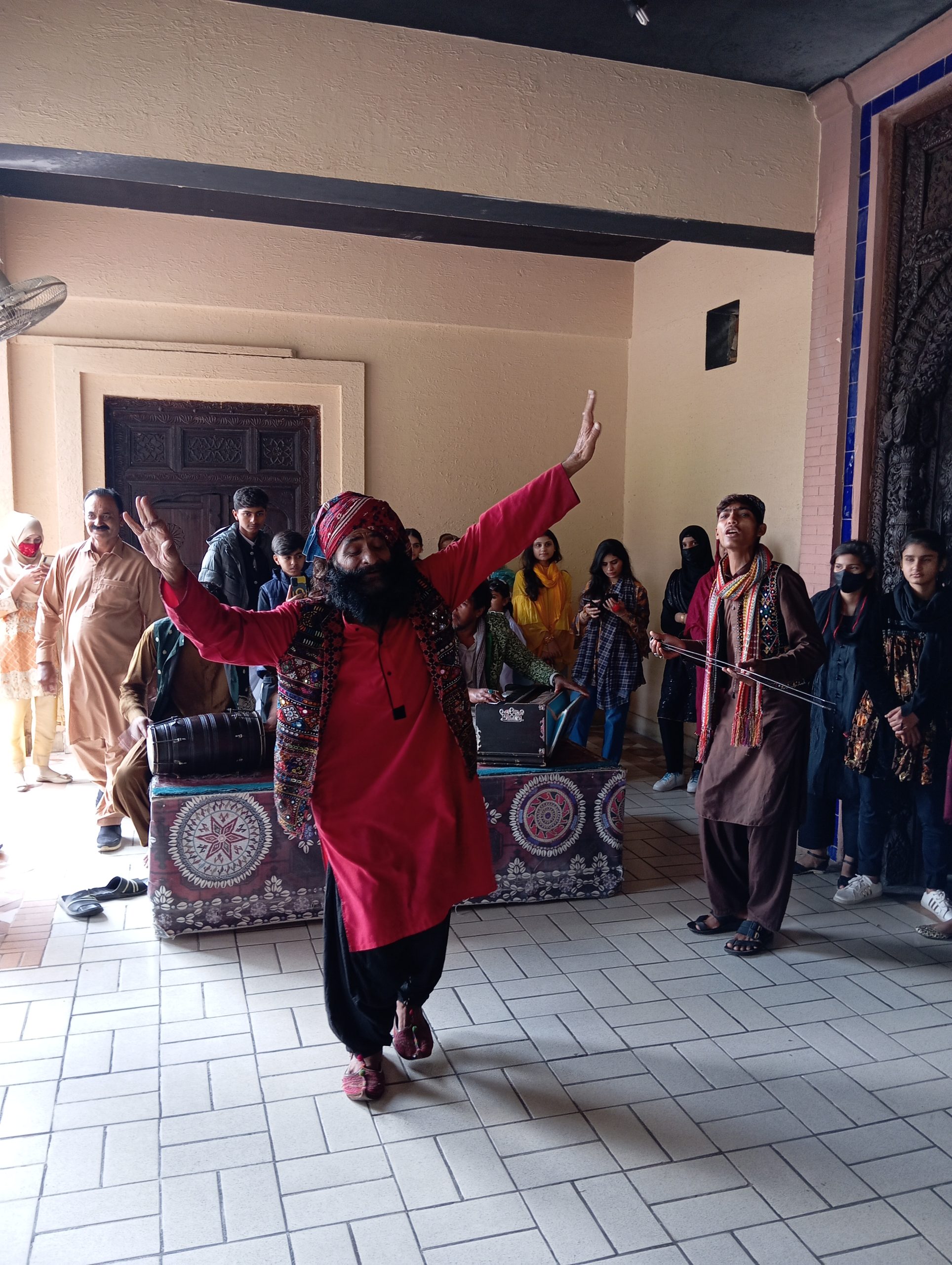 Zatrzymaliśmy się też przy muzeum. Znajdują się w nim bardzo ciekawe wystawy. Dotyczą nie tylko Pakistanu, ale i pobliskich krajów Azji, takich jak Iran, Tadżykistan, Turkmenistan, Uzbekistan. Można zobaczyć rekonstrukcje domów, narzędzi, plakaty ze zdjęciami, inscenizacje. Ale najciekawszy był występ przed wejściem do budynku. Najpierw chłopacy siedzący na podeście zaczęli grać i śpiewać i zapraszać nas do wspólnego tańca. Na koniec wystąpił wąsaty starszy pan. Śpiewał i tańczył kręcąc się w kółko, pełen folklor!