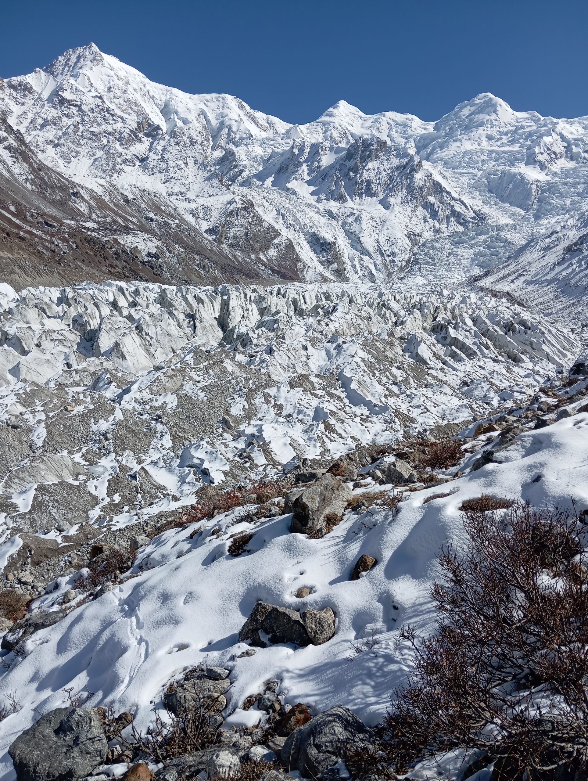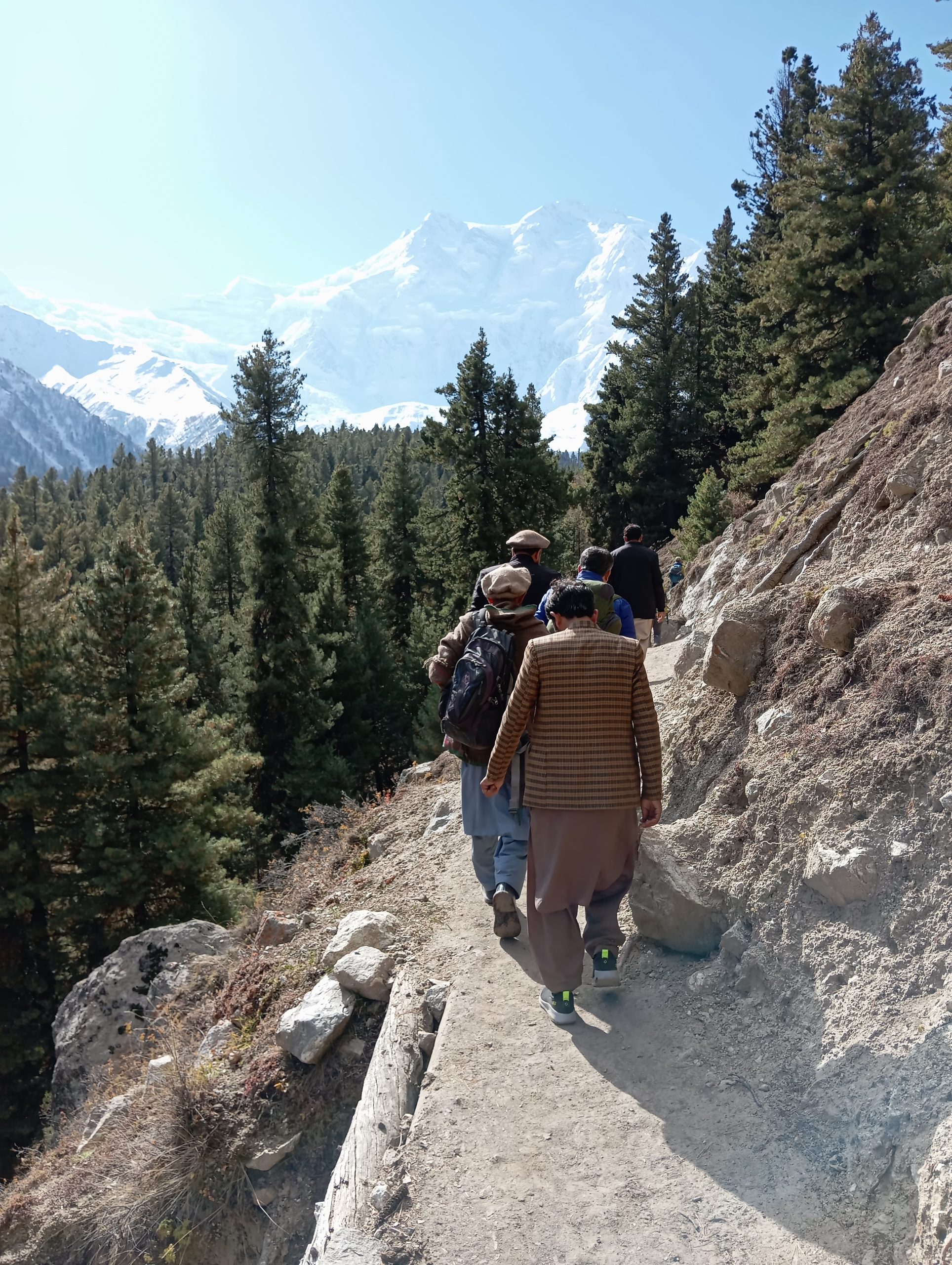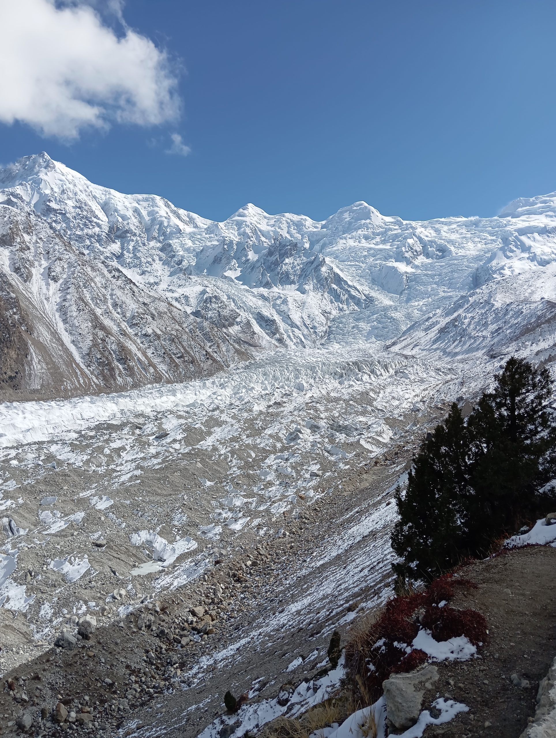 Po około 3h trekkingu doszliśmy do punktu widokowego na lodowiec schodzący ze zboczy Nanga. Prawdę mówiąc najładniejszy widok na górę był z polany poniżej. Tu szczyt przesłaniał wielki obelisk. Mimo to sesjom zdjęciowym nie było końca.