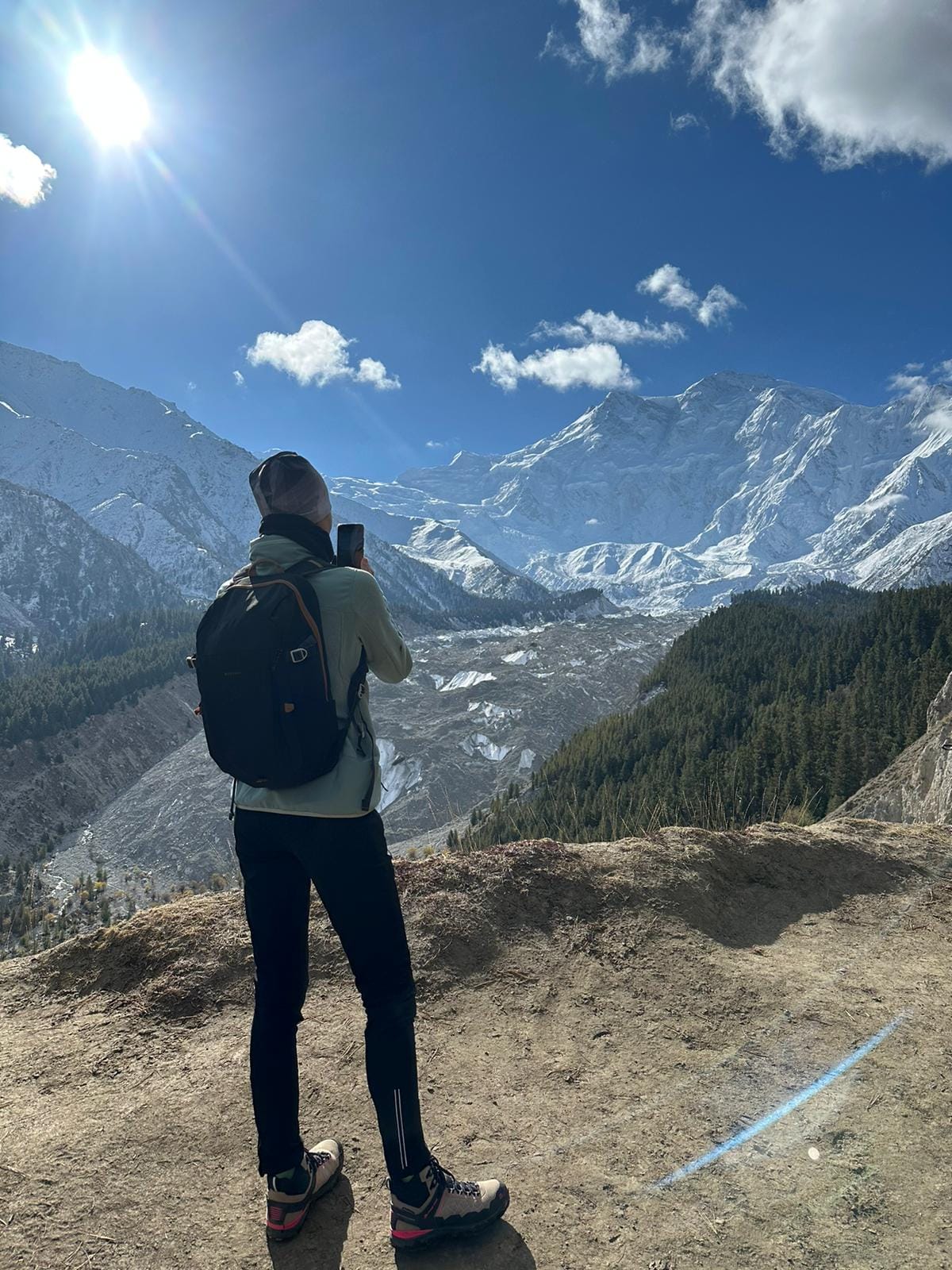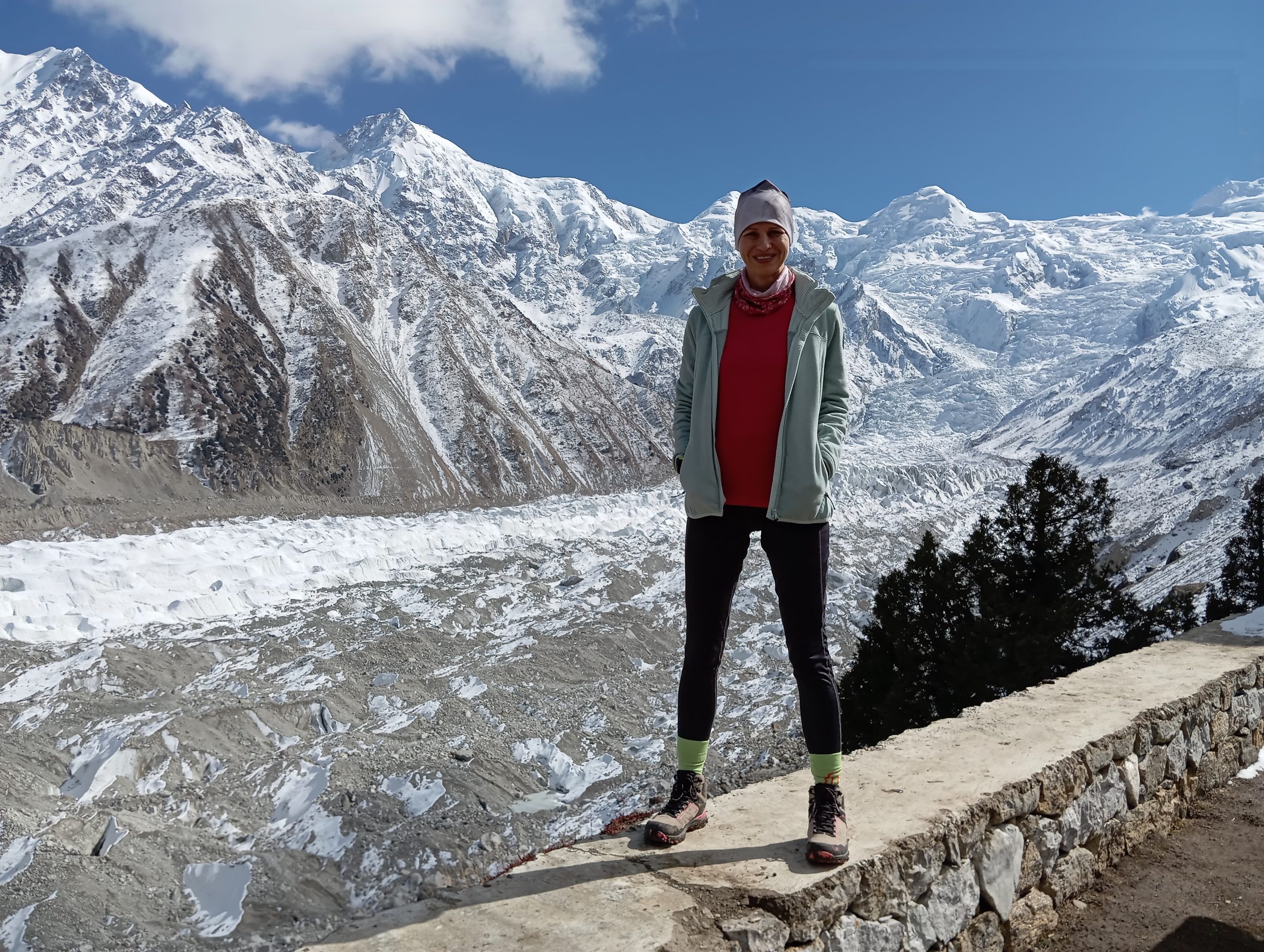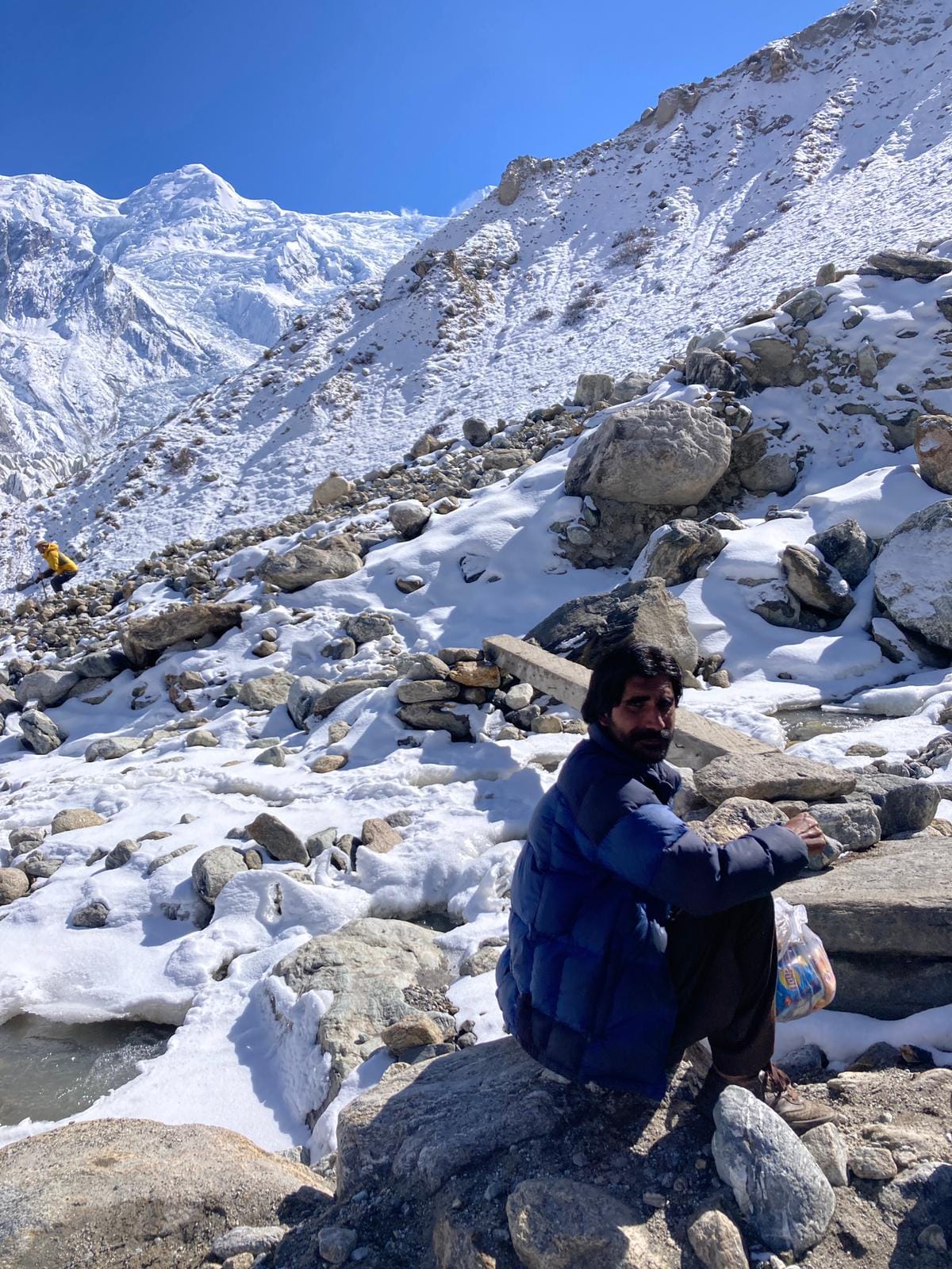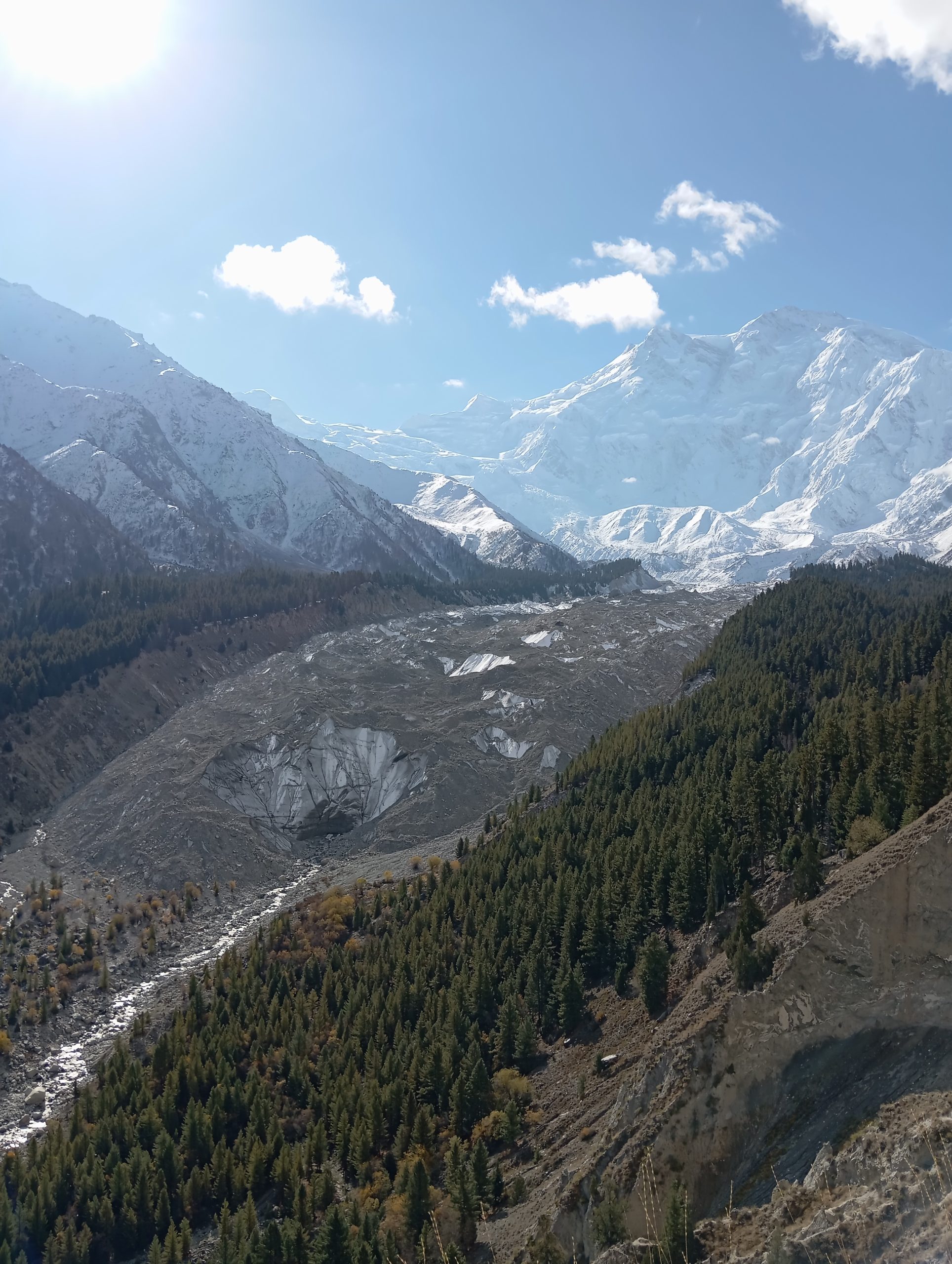 Po około 3h trekkingu doszliśmy do punktu widokowego na lodowiec schodzący ze zboczy Nanga. Prawdę mówiąc najładniejszy widok na górę był z polany poniżej. Tu szczyt przesłaniał wielki obelisk. Mimo to sesjom zdjęciowym nie było końca.