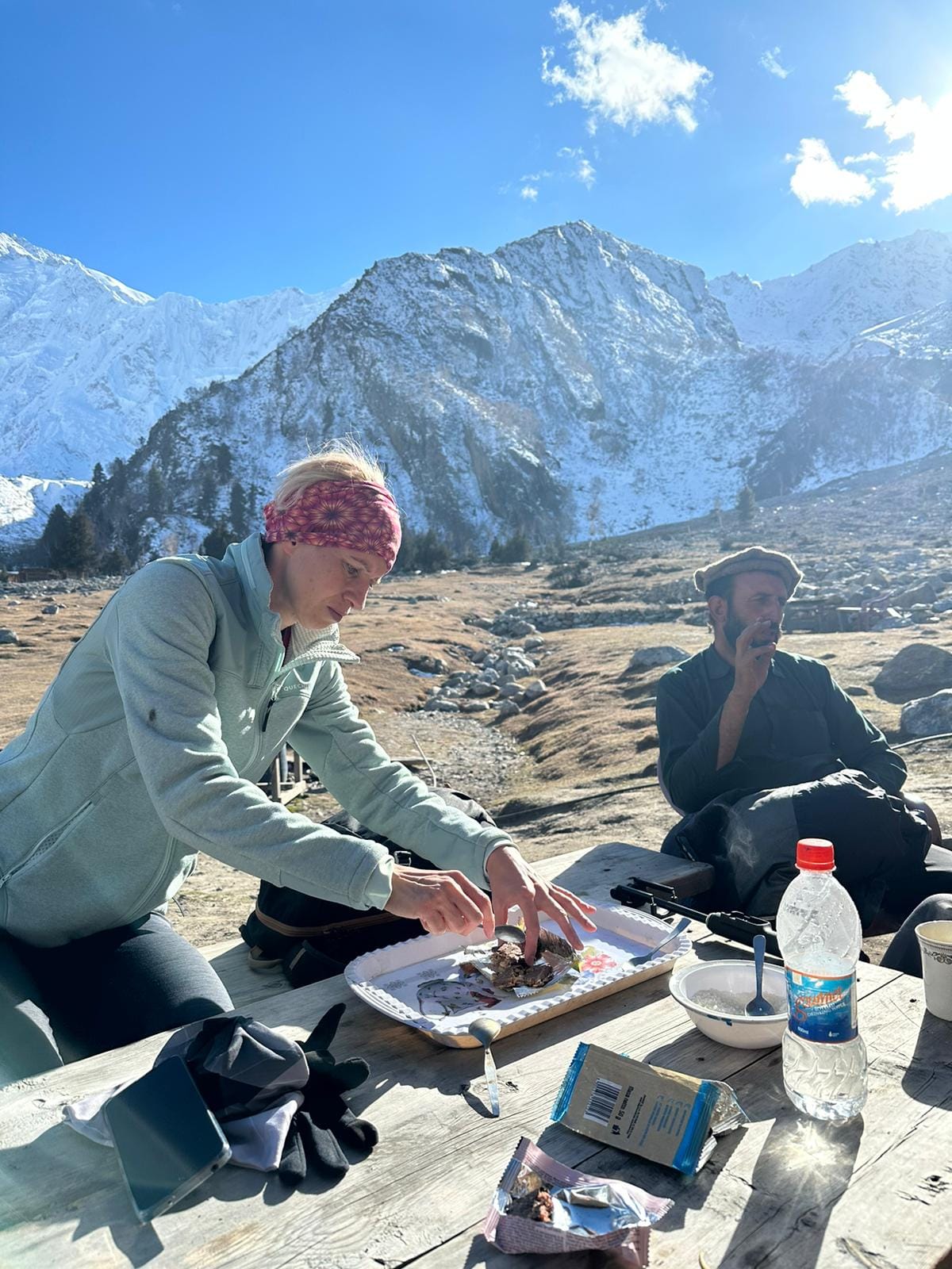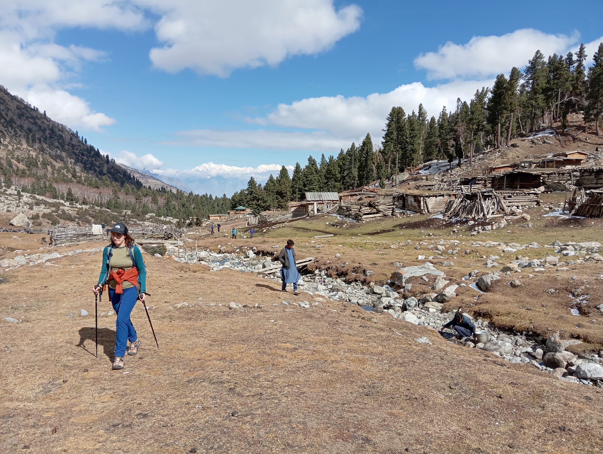 Celem na dziś było dojście do bazy pod Nanga Parbat. Po drodze czekały na nas liczne punkty widokowe, na lodowiec, Nangę i inne szczyty. Ruszyliśmy z polany Feary Meadows, na wysokości ok 3300 m npm. Sam szlak jest całkiem łatwy. Po drodze zatrzymywaliśmy się na pięknie położonych polanach. Są na nich drewniane domki, które w sezonie można wynająć. Teraz sezon się kończy i domki stoją puste. Cisza i spokój obłędne. To uroki podróżowania poza wysokim sezonem. Jednocześnie przepiękne, bezchmurne niebo i w słońcu całkiem ciepło.
