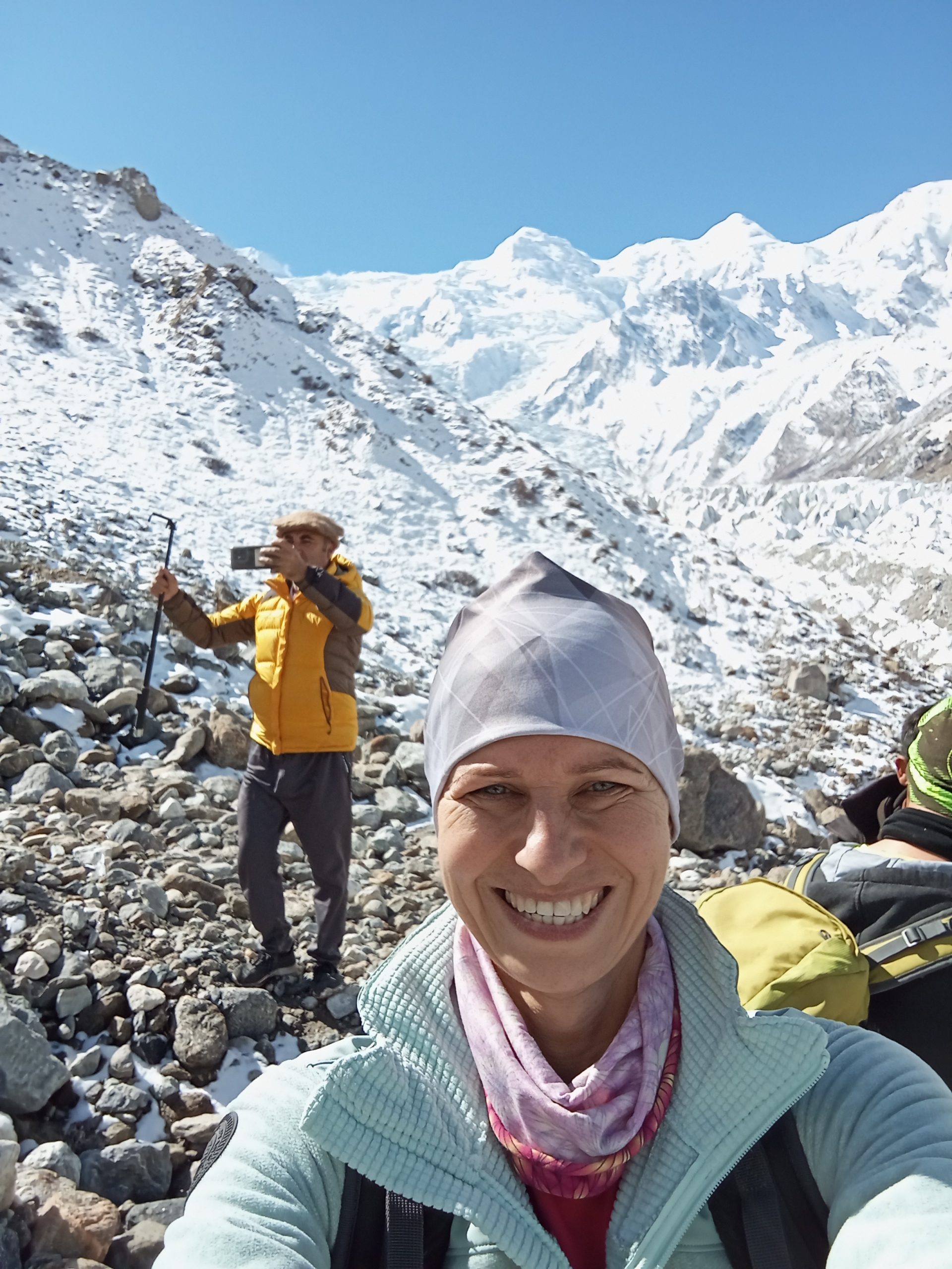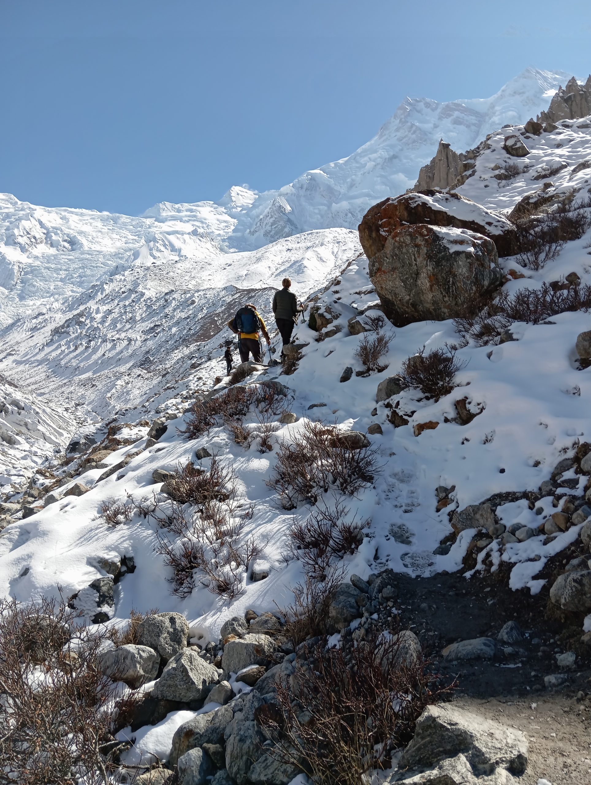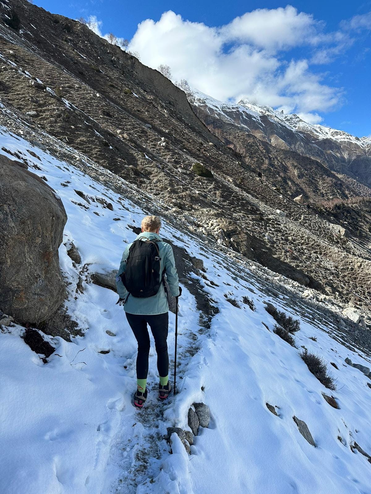 Następnie chętne osoby wyruszyły w dalszy trekking. Miałam w planie dojść do bazy. Jednak górskie, niby odpowiednie na śliską powierzchnię buty nie dawały rady. Nie miałam też kijków, wychodzi brak górskiego doświadczenia… Ścieżka prowadziła wąskim trawersem, była pokryta śniegiem, a miejscami lodem. Momentami szłam na czworakach bojąc się upadku. Doszłam do ok 3600 m npm. Z wysokością całkiem dobrze sobie radziłam, ale pokonał mnie strach przed upadkiem z góry. Stwierdziłam, że nie będę ryzykować. Zwłaszcza, że nasz guide powiedział, że czeka nas jeszcze 2h marsz. W rzeczywistości okazało się, że do punktu docelowego było ok 40 minut. Razem z koleżanką zawróciłam. Towarzyszył nam jeden z naszych guidów. Inny poszedł dalej z resztą ekipy. Jak nam potem powiedzieli do końca nie wiedzą, czy miejsce, do którego doszli, to faktycznie ta baza. O tej porze roku nic tam się nie działo, nie było nikogo, a i widok z polany niżej był lepszy.