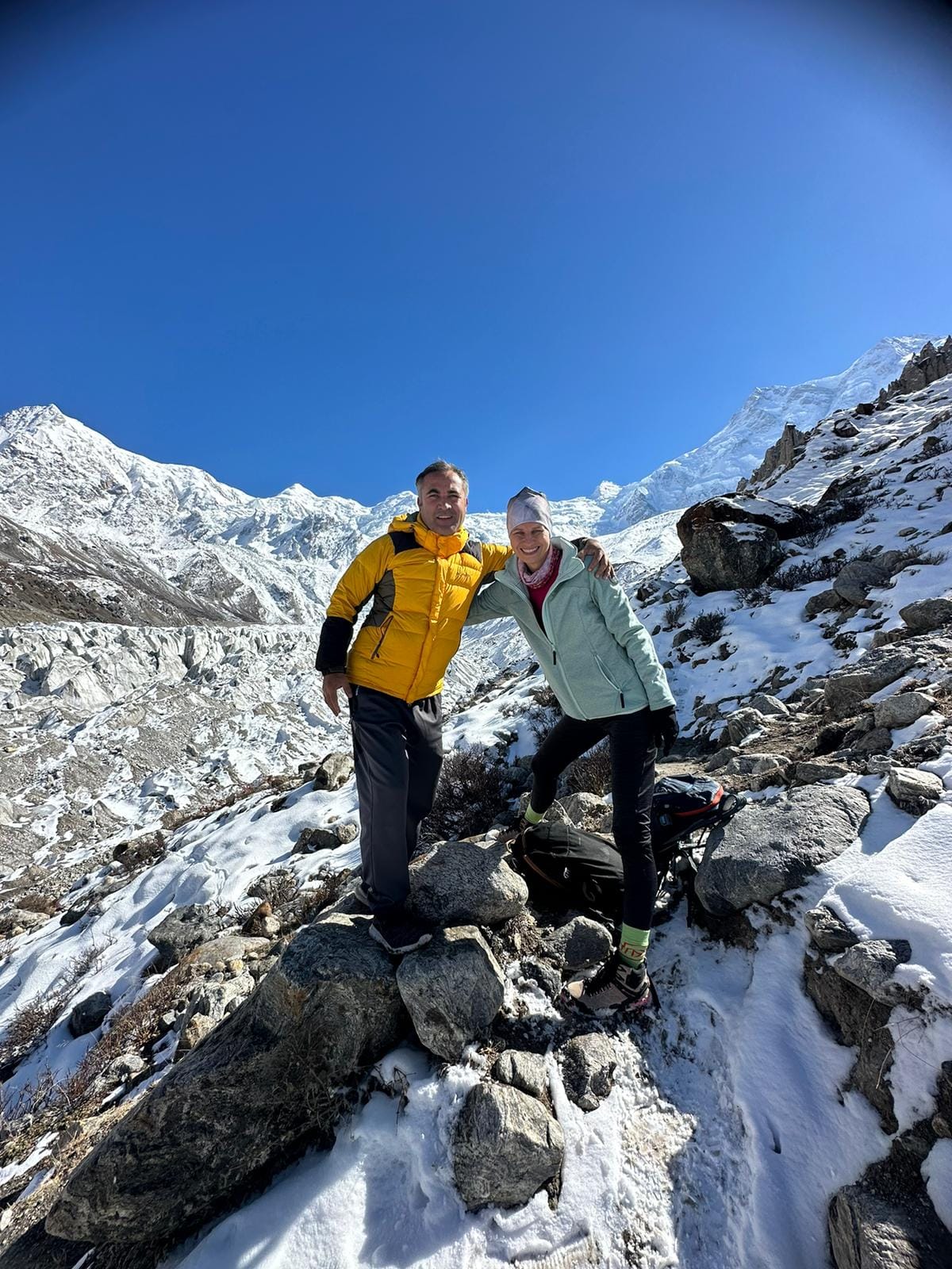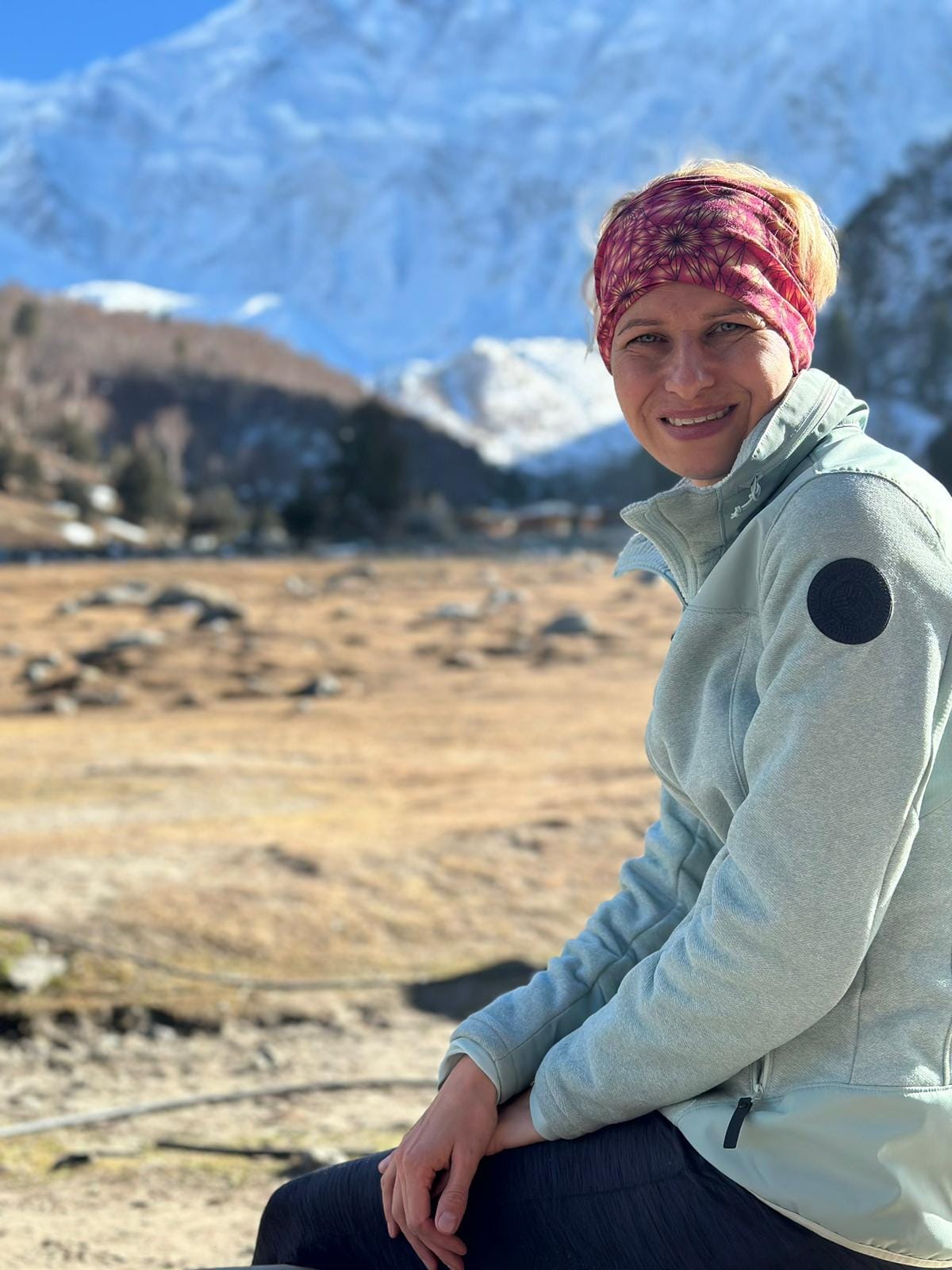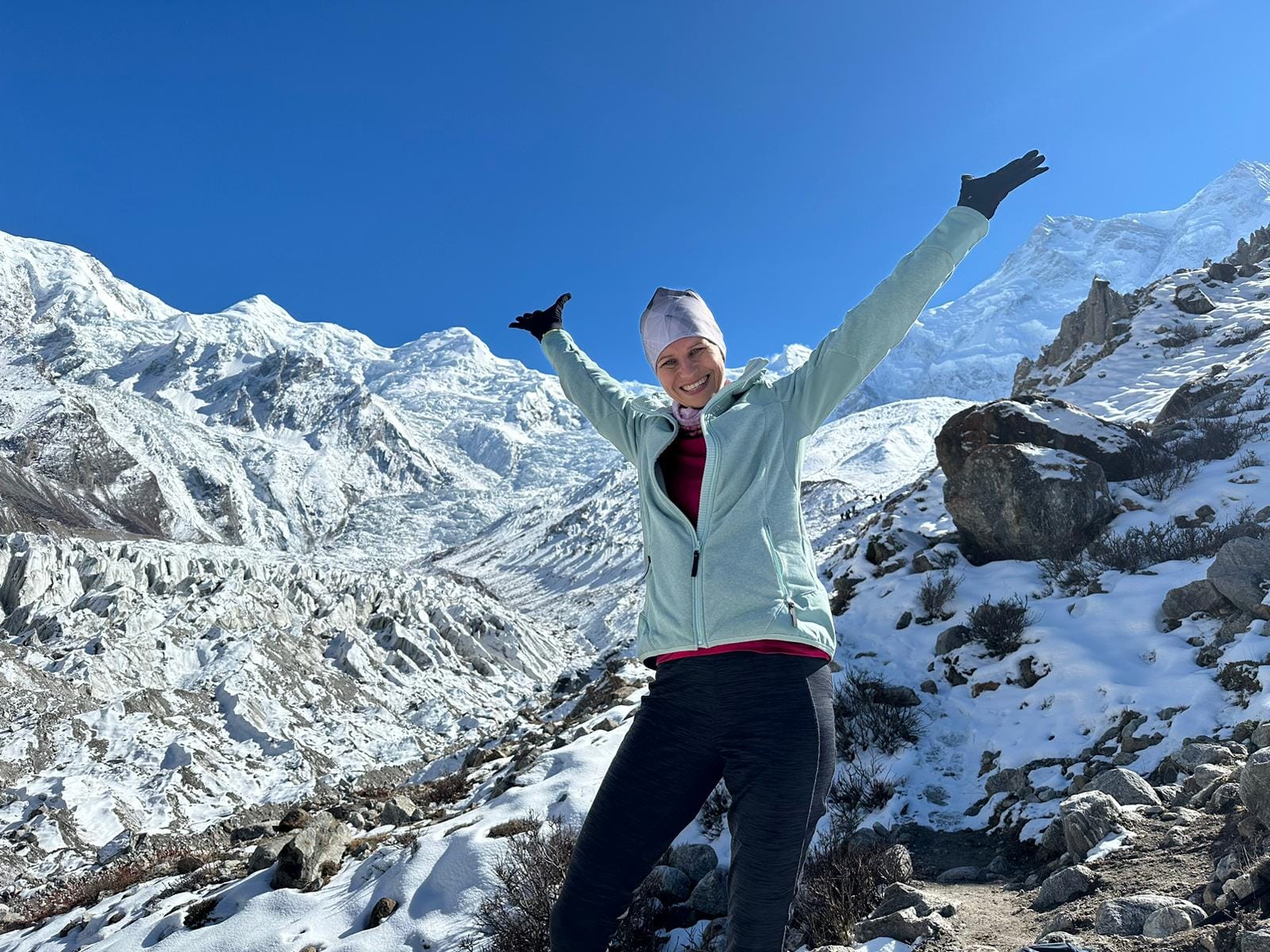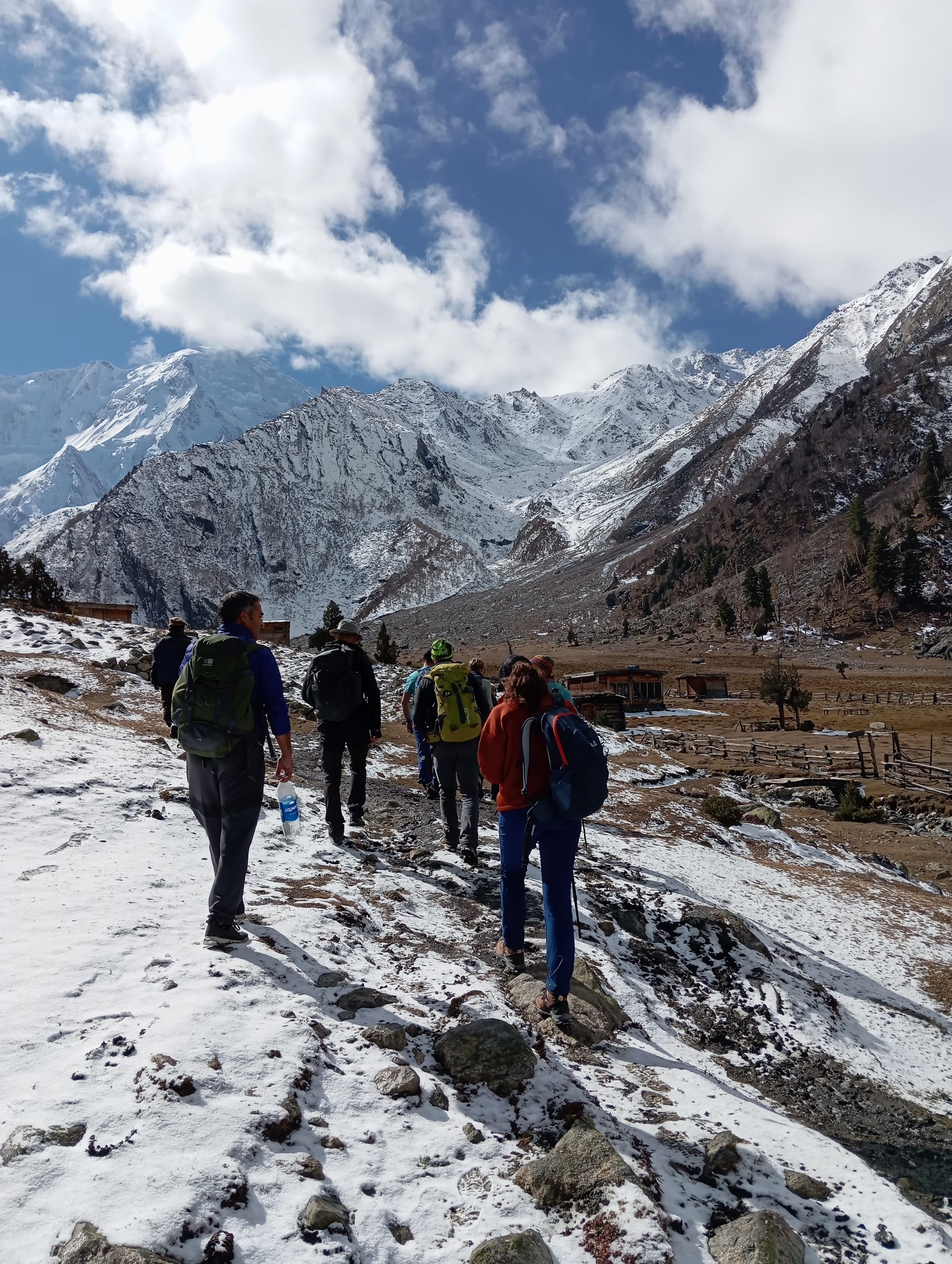 Następnie chętne osoby wyruszyły w dalszy trekking. Miałam w planie dojść do bazy. Jednak górskie, niby odpowiednie na śliską powierzchnię buty nie dawały rady. Nie miałam też kijków, wychodzi brak górskiego doświadczenia… Ścieżka prowadziła wąskim trawersem, była pokryta śniegiem, a miejscami lodem. Momentami szłam na czworakach bojąc się upadku. Doszłam do ok 3600 m npm. Z wysokością całkiem dobrze sobie radziłam, ale pokonał mnie strach przed upadkiem z góry. Stwierdziłam, że nie będę ryzykować. Zwłaszcza, że nasz guide powiedział, że czeka nas jeszcze 2h marsz. W rzeczywistości okazało się, że do punktu docelowego było ok 40 minut. Razem z koleżanką zawróciłam. Towarzyszył nam jeden z naszych guidów. Inny poszedł dalej z resztą ekipy. Jak nam potem powiedzieli do końca nie wiedzą, czy miejsce, do którego doszli, to faktycznie ta baza. O tej porze roku nic tam się nie działo, nie było nikogo, a i widok z polany niżej był lepszy.