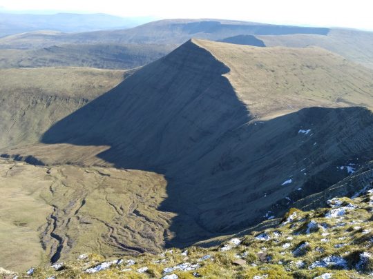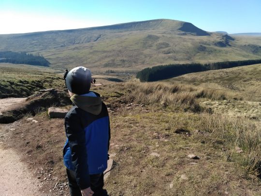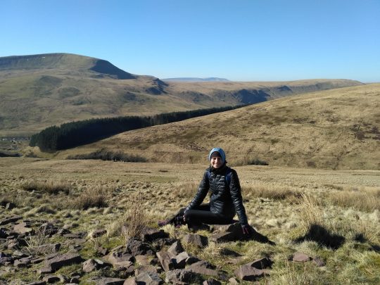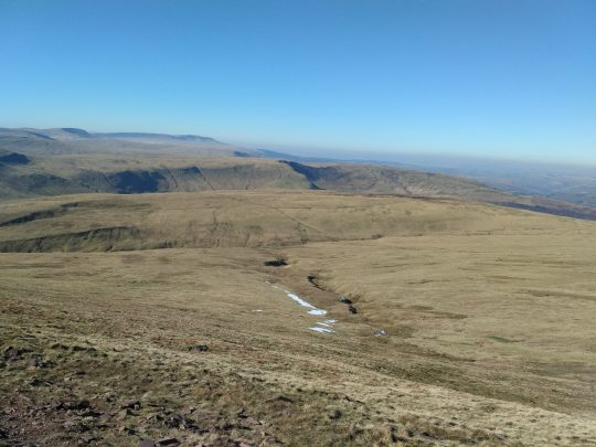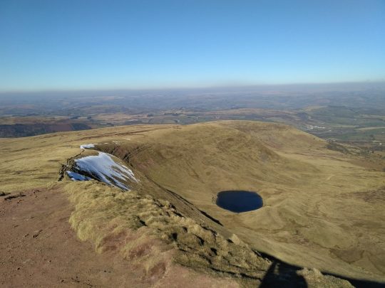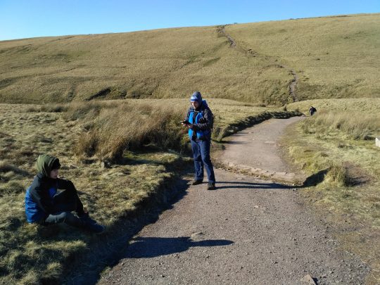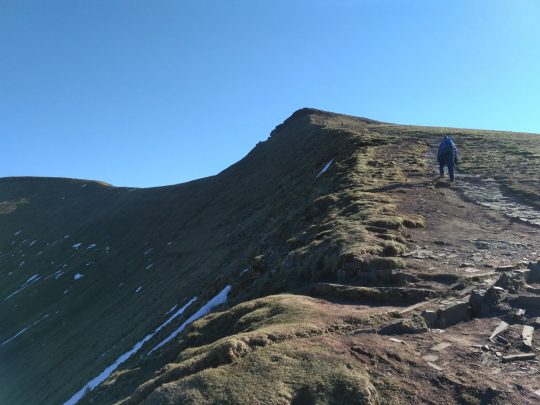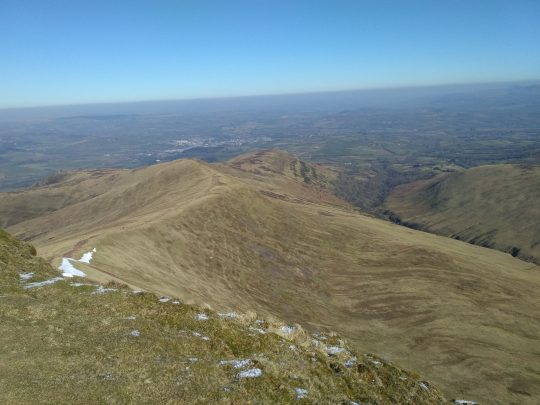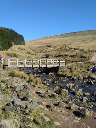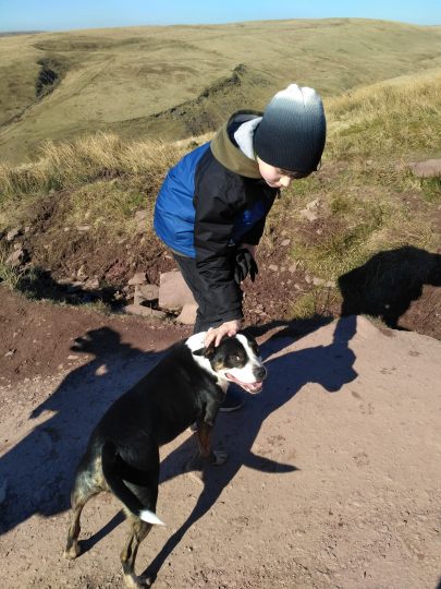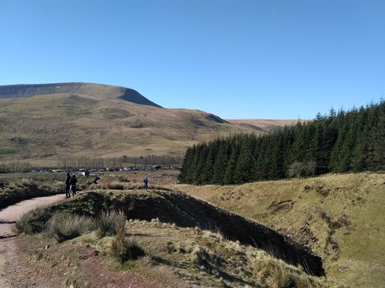 Minęliśmy drewnianą furtkę i weszliśmy na szlak. Była to dobrze utwardzona, prosta ścieżka, która po chwili zaczęła się dość mocno piąć w górę. Dookoła nas były wzgórza porośnięte trawami. Żadnych drzew, ani nawet krzaków. Wiało potwornie. Im wyżej, tym bardziej wiatr urywał nam głowy. Pierwszy szczyt, na który weszliśmy to Corn Du. Wcześniej w jego zaciszu na chwilę przystanęliśmy, by napić się ciepłej herbaty z termosu i coś zjeść. Ponieważ jak się okazało góra zacisza zbyt dużo nie dawała postanowiliśmy zbyt długo nie odpoczywać i nie marznąć. Wdrapaliśmy się w kilku krokach na jego najwyższy punkt. Wiatr wiał tak mocno, że nawet nie zrobiłam na nim zdjęcia. Każdorazowe zdejmowanie rękawiczki, by pstryknąć fotkę sprawiało, że palce mi zamarzały. Z Corn Du roztacza się wspaniały widok na okoliczne wzgórza. Odchodzą też z niego ścieżki, które prowadzą w dół dolin, albo graniami. Są tu świetne tereny do maszerowania. Na teren parku można wejść także z psem. Było ich tu wiele. Niektóre biegały bez smyczy i nikt nie reagował na ten widok histerycznie jak często się zdarza w poznańskim Marcelinku. Walijczycy w ogóle bardzo kochają psy. Jak byliśmy w skansenie St Fagans na kilku rzemieślniczych straganach można było kupić albumy z psami, obrazy mniejsze i większe, figurki etc.