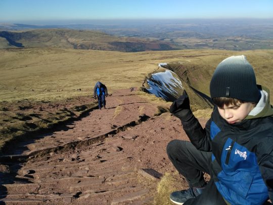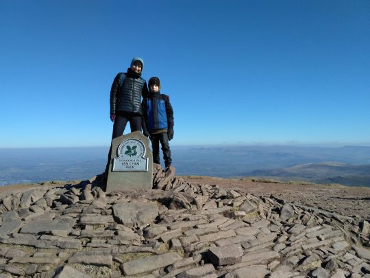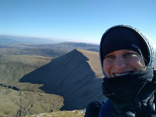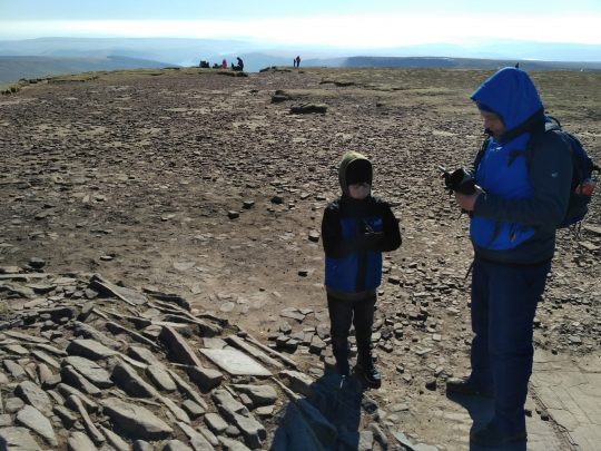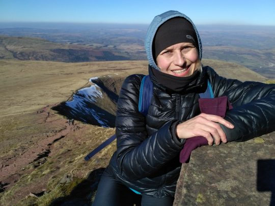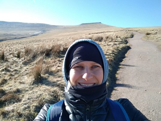 Z Corn Du był już rzut kamieniem na najwyższy szczyt tej części Walii, Pen y Fan. Przejście między szczytami zajęło nam nie więcej niż 10 minut. Ale byl to odcinek krytyczny, takiej wichury dawno nie przeżyłam. Trzymaliśmy się z Jankiem za ręce, bo jeden z podmuchów wiatru sprawił, że zepchnęło nas wręcz parę kroków niżej. Szliśmy zgięci w pół, by chronić twarze od tnącego wiatru. Maciej powiedział potem, że na przestrzeni tych kilkudziesięciu kroków ciężko było mu momentami złapać oddech. Ja z kolei wtedy poczułam, że palce u rąk mi wręcz zamarzają. Co dziwne jak dotarliśmy na płaskie wzgórze tam przestało tak mocno wiać.