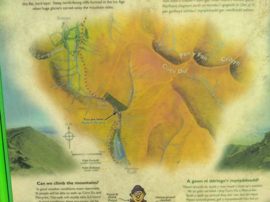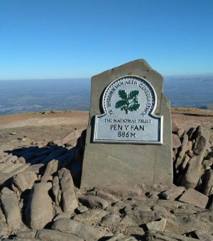 Google translator nazwę Pen y Fan tłumaczy z walijskiego na „głowa i wentylator”. Myślę, że można to opisać jako wentylator, którego moc urywa ci głowę. Zrobiliśmy sobie pamiątkowe zdjęcia przy tablicy oznaczającej szczyt góry – 886 mnpm. Porozglądaliśmy się chwilę i z ulgą, że gorzej już być nie może zaczęliśmy schodzić. By się nie powtarzać do zejścia wybraliśmy inny szlak. Ta droga okazała się łagodniejsza. Po 50 minutach byliśmy już na parkingu. W sumie cała wyprawa zajęła nam 2:45h. Zobaczyliśmy dziś zaledwie mały skrawek Brecon Beacons. Jest tu tyle możliwości trekingu, że można spokojnie spędzić w parku wiele dni i za każdym razem chodzić innymi ścieżkami.