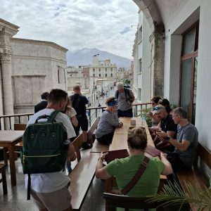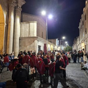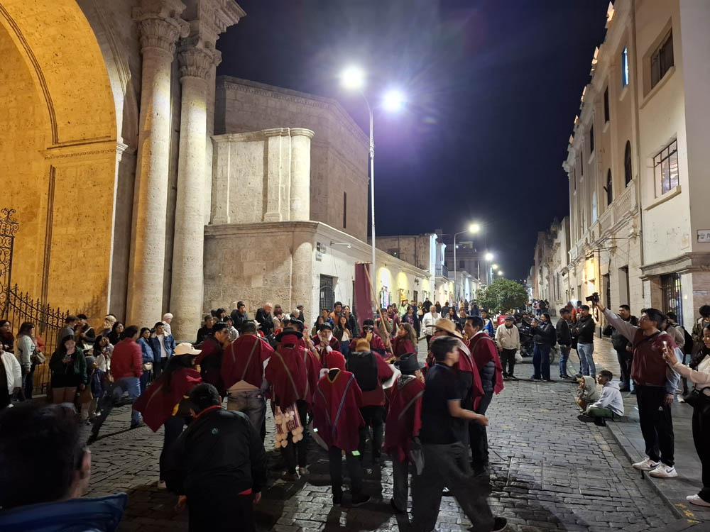 Wieczorem poszliśmy na kolację. Plac de Armas był wypełniony miejscowymi i turystami. Katedra była pięknie oświetlona nocą katedra. Pod jej murami lokalny zespół folklorystyczny, który przyjechał z Puno, dawał występ. Mężczyźni i chłopcy na twarzach mieli maski zwierząt. Grali na peruwiańskich instrumentach zwanych siku. W kulturze andyjskiej gra się na nich w duecie – jedna osoba gra „połówkę” dźwięków, druga drugą. Symbolizuje to komplementarność i harmonię (zasada yanantin w kosmologii andyjskiej). Ciekawy akcent na koniec dnia.