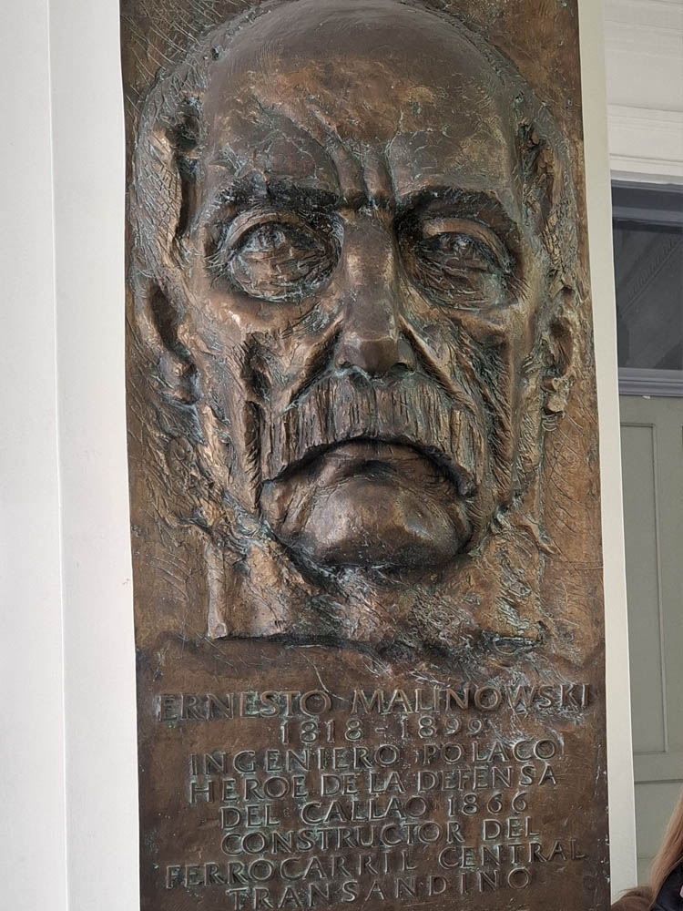 Trafił się też polski akcent, płaskorzeźba naszego inżyniera, Ernesta Malinowskiego. Był on głównym projektantem i budowniczym słynnej kolei trans-andyjskiej. Linia łączy wybrzeże Oceanu Spokojnego z wyżynami Andów, prowadząc przez strome góry, tunele i wiadukty.