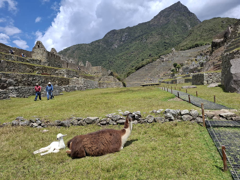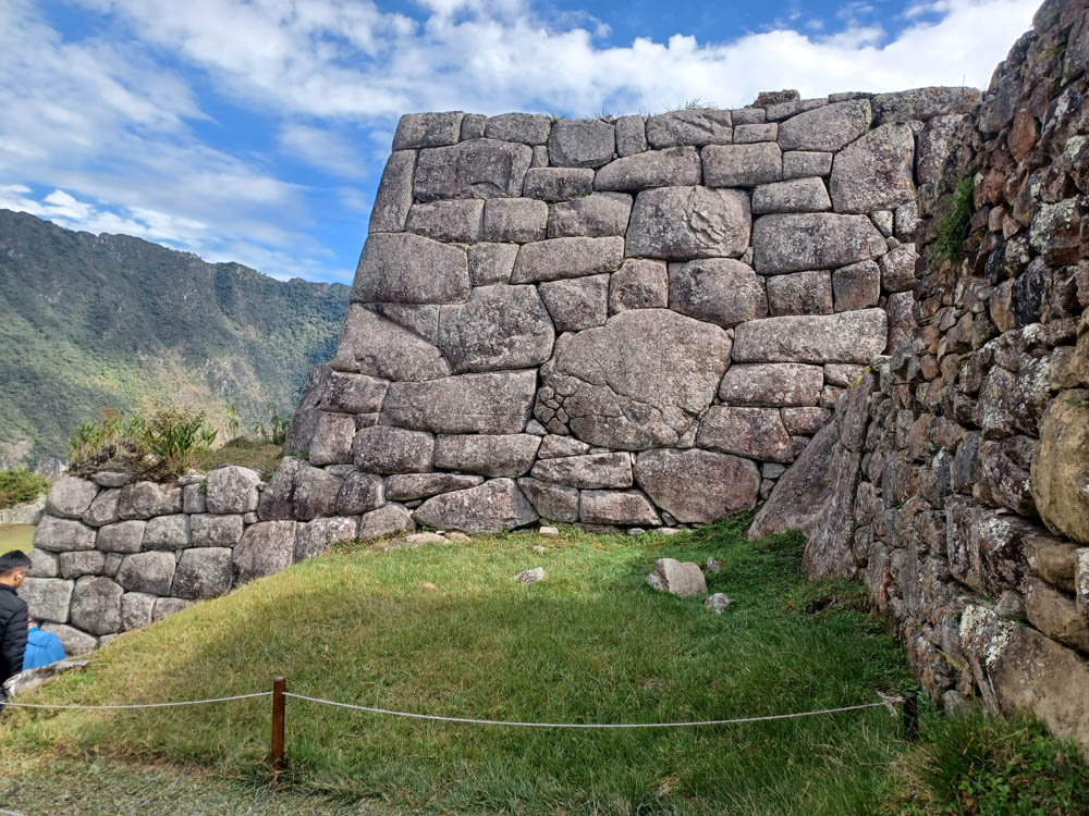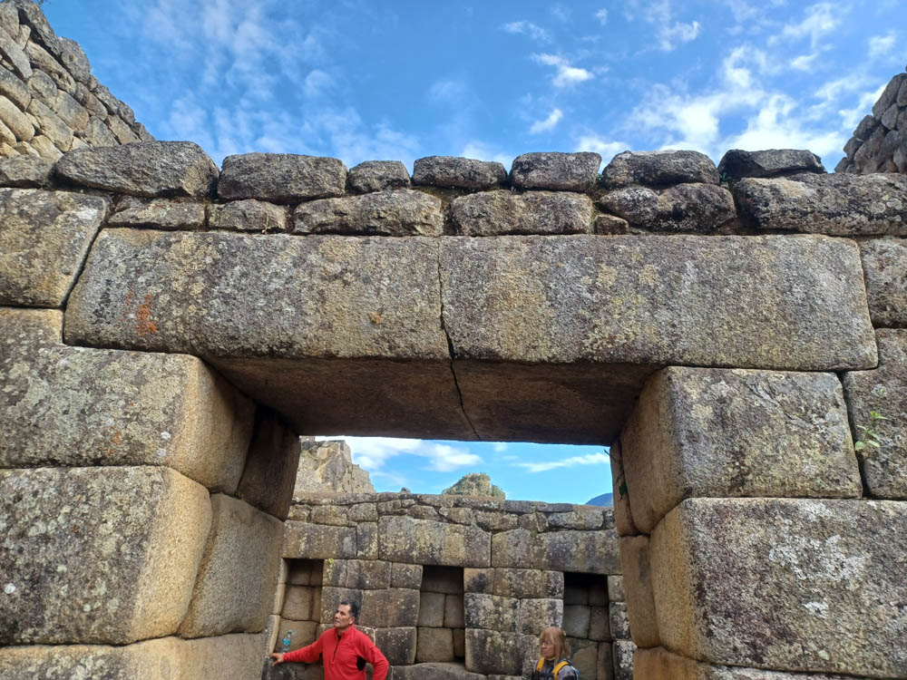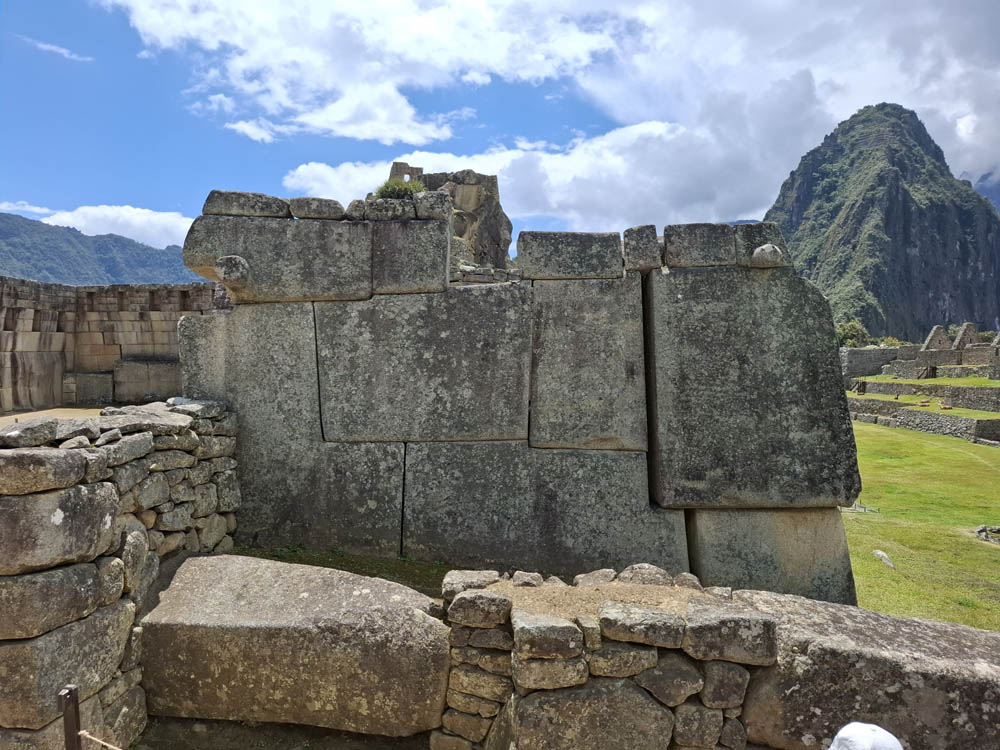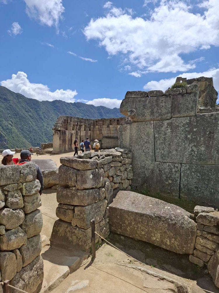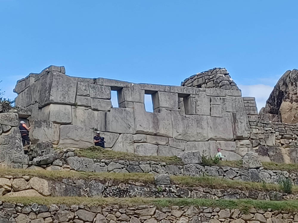 Przewodnik pokazywał nam ciekawsze budynki, które pełniły rolę np. świątyń czy obserwowania nieba. Większość budynków była dość niechlujnie zbudowana porównując to z idealnie dopasowanymi olbrzymimi blokami skalnymi, które widzieliśmy wcześniej w Ollantaytambo czy choćby na ulicach Cusco. Udało mi się dostrzec ledwie kilka fragmentów murów, które miały większą precyzję spasowania. Te podobno były pierwotne, oryginalne. Dużą część obiektów odbudowano, po wykarczowaniu dżungli, która porastała górę. Naprawdę trudno uwierzyć w to, że i jedne i drugie zbudowała ta sama cywilizacja. Jak dla mnie i dla yacoola jest tu więcej zagadek inżynieryjnych i architektonicznych niż sensownych odpowiedzi. Zbocza tworzą tarasy uprawne, które produkowały żywność w ilościach mogących wyżywić 4 tys. ludzi, a jednocześnie mówi się, że na stałe Machu Picchu zamieszkiwało ok 1,5 tysiąca osób. Były tu zaawansowane systemy nawadniające te zbocza. Stosowano systemy hydrauliczne, które w Europie opracowano dopiero 150 lat później.