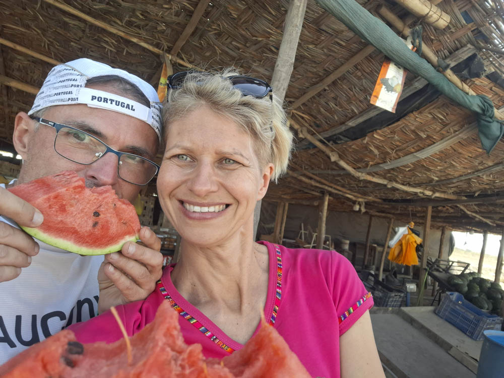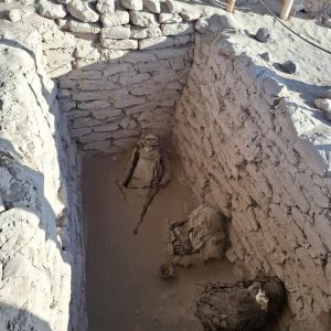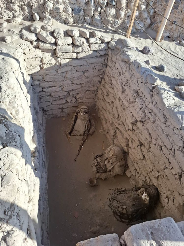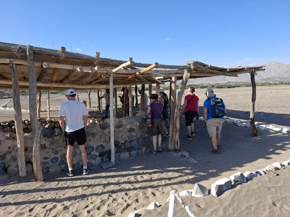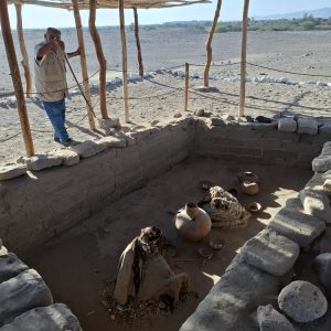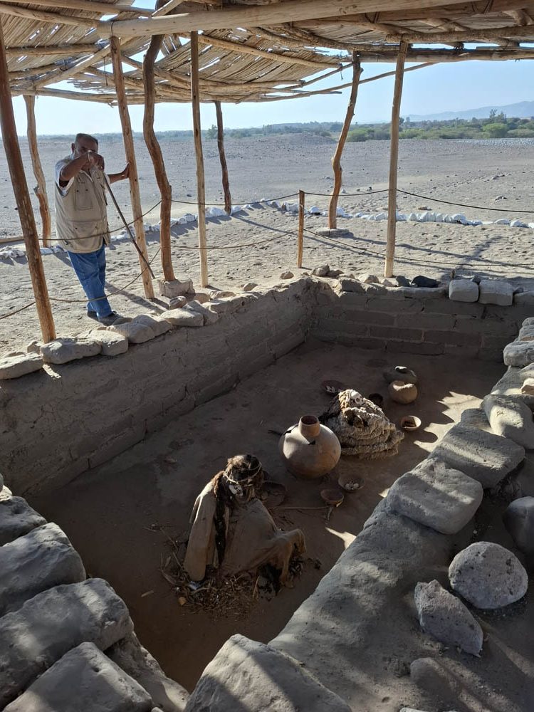 Na koniec zajechaliśmy jeszcze na cmentarz na pustyni. Tu w odkrytych grobach spoczywały szczątki dawnych mieszkańców tych ziem. Jesus objaśnił nam zwyczaje pogrzebowe, proces mumifikacji i układania zmarłych w pozycji embrionalnej, twarzą na wschód, co miało zapewnić im reinkarnację. Niestety wiele z tych grobów było splądrowanych przez „bantitos”. Zwłoki często były dekorowane złotymi naszyjnikami i bransoletami.
