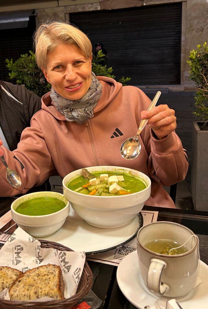 Zamówiliśmy gorącą herbatę i coś do jedzenia. Porcje przyszły olbrzymie. Ja wzięłam zieloną zupę. Dostałam talerz, którym najadłoby się 5 osób! W zupie były ziarna fasoli, bobu, ziemniaki i inne warzywa, dwa kawały mięsa. Pyszna o mocno zielonym kolorze 😉
