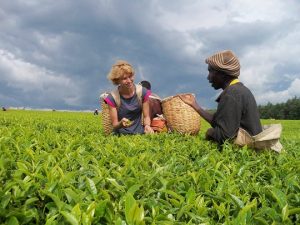 Wracając na główną drogę przeszliśmy przez osiedle domków, w których mieszkają robotnicy wraz ze swoimi rodzinami. Na polu pracują głównie mężczyźni, choć kilka kobiet też widziałam. Żony wraz z dziećmi siedzą w domach. Miesięczne zarobki to około 100 USD, ale podobno można zarobić dużo więcej, zależy od ilości zebranych koszy z herbatą.