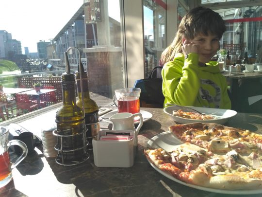 Jak byliśmy za pierwszym razem w weekend w Cardiff Bay, na promenadzie kelnerzy z jednej z włoskich knajpek poczęstowali nas pyszną bruschettą z pomidorami. Postanowiliśmy tam pójść na włoski lunch. Dojście szybkim krokiem zajęło nam niecałe pół godziny.