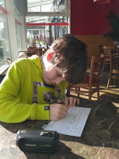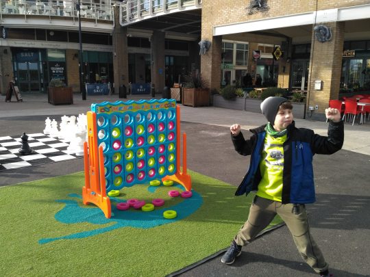 Na promenadzie nie było już wystawy z klocków LEGO. Teraz w tym miejscu były ustawione duże figury szachowe i stojąca plansza do gry „4 in a row”. Zagraliśmy i znów Janek wygrał.
