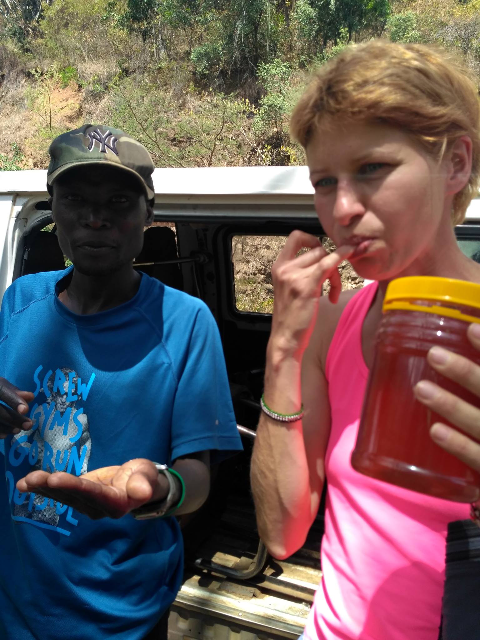 Po wyjściu obskoczyły nas kobiety, które przy drodze sprzedawały owoce. Ceny niższe nawet niż w Iten. Za reklamówkę mango czy kiść 30 bananów, albo 5 dużych papai zapłaciliśmy po dolarze. Obkupiliśmy się i do końca pobytu będziemy jechać na owocach. Zatrzymaliśmy się też po drodze, by kupić miód od szczęśliwych pszczół. Będzie nam przypominał o ciepłej Kenii w zimowe wieczory…