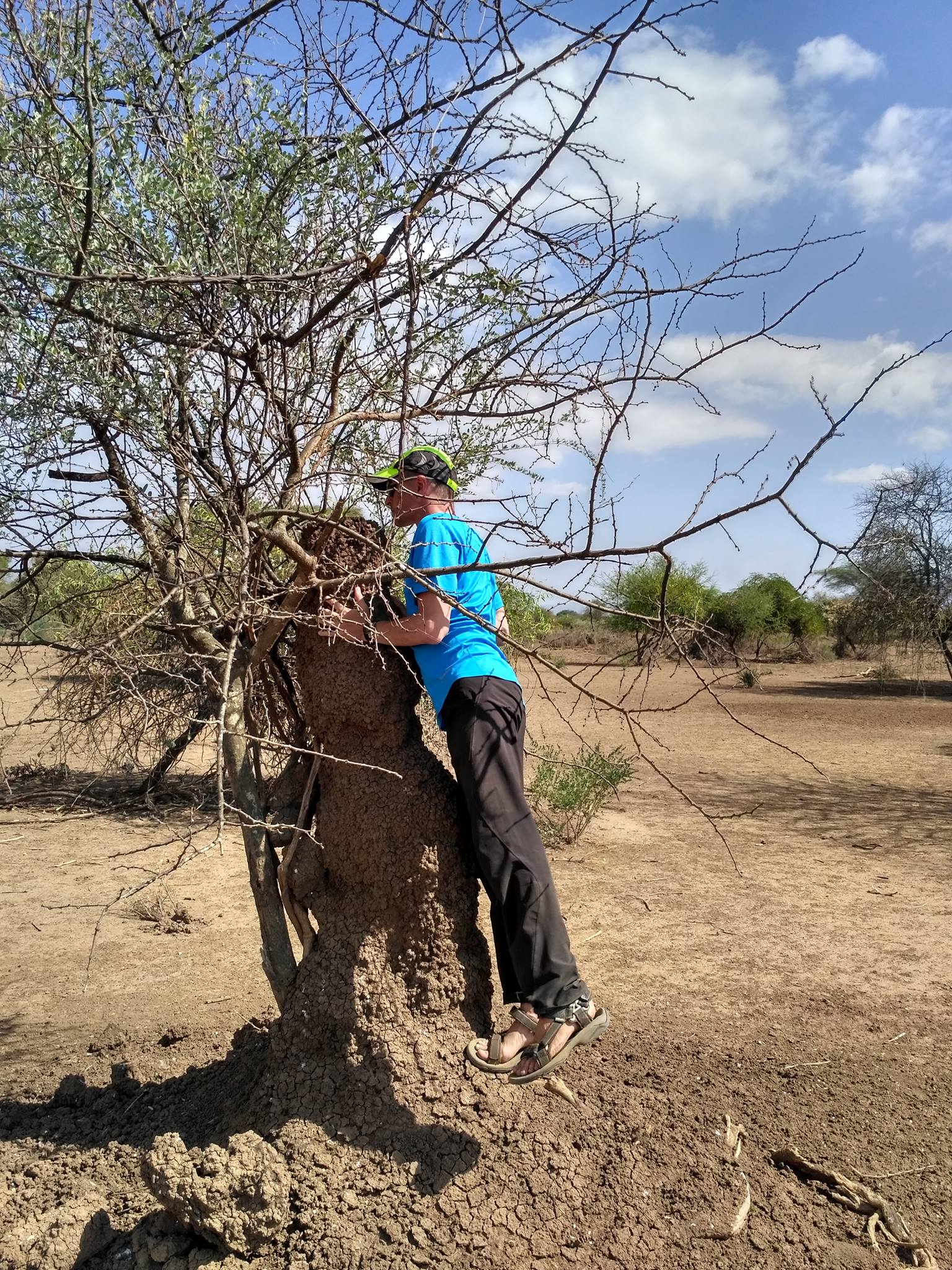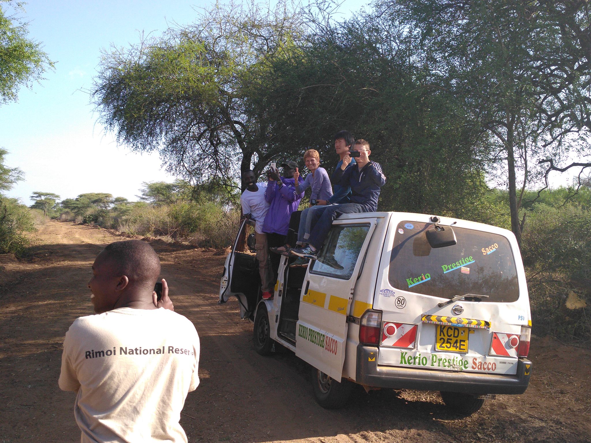 Do naszego teamu dołączył przewodnik i razem ruszyliśmy w naszym matatu po ścieżkach rezerwatu. Ten park zupełnie różnił się od Parku Narodowego w Nairobi, w którym byliśmy rok temu. Tam była otwarta, rozległa przestrzeń, sawanna, na której pasły się antylopy, zebry, żyrafy czy bawoły afrykańskie. Tu z kolei był typowy bush. Gęste krzaki z kilku centymetrowymi kolcami niczym zasieki broniły wstępu wgłąb dziczy. Do tego rozłożyste akacje i kilkumetrowe kopce termitów. Zatrzymaliśmy się na moment przy sztucznym zbiorniku z wodą, tu zwierzęta przychodzą się napić. Na nasz widok w krzaki uciekło stado guźców. Wysiedliśmy z matatu i chłonęliśmy otoczenie. Ptaki latały nam nad głowami śpiewając, słońce zaczynało grzać coraz mocniej. Ruszyliśmy dalej, szukając słoni. W tym parku jest ich 400, potwierdzały to ślady ich odchodów. Szukaliśmy jak najświeższych, które by świadczyły o tym, że zwierzęta są w pobliżu. Nasz przewodnik dobrze się spisał. Wytropił dla nas olbrzymy. Stały ok 30m od drogi, schowane w krzakach. Było widać jak drzewa się ruszają i słychać było trzask łamanych gałęzi. Wskoczyliśmy na dach matatu, by lepiej móc je widzieć. Słonie stały do nas tyłem. W pewnym momencie jeden z nich się odwrócił i spojrzał wprost na nas. Mimo, że nie był blisko czuć było moc w tym spojrzeniu. Nasz guide powiedział, że słoń potrafi biec nawet 3 razy szybciej od człowieka. To dlatego strażnicy po parku nie jeżdżą na rowerach, a nawet nie na motorach. Gdyby słoń chciał zaatakować byłby dużo szybszy. Pojeździliśmy jeszcze trochę po parku. Natrafiliśmy na stado zebr i pawianów. Na koniec zajechaliśmy na pole campingowe, na brzegu wysychającej o tej porze roku rzeki Kerio. Za 10 usd od osoby można tu mieć całkiem duży i wygodny namiot, z normalnym łóżkiem. Na terenie obozu są też toalety i prysznice. Może kiedyś skorzystamy z tej opcji, by poczuć jak to jest obudzić się w afrykańskim buszu.