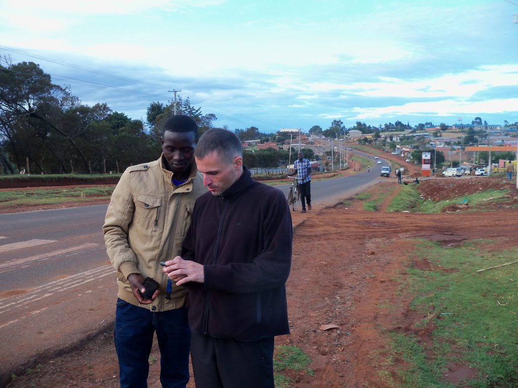 7:30 a.m. Po wczesnym śniadaniu na dachu naszego hotelu Khweza nasi kenijscy przyjaciele zawieźli nas na dworzec autobusowy. Jest on pełen mniejszych i większych autobusów i busów. Totalny harmider. Pan ubrany w biały fartuch niczym lekarz sprzedał nam bilety i wypisał pokwitowanie. Chłopacy załatwili nam kartę lokalnego operatora Safari.com. Dzięki temu możemy dzwonić za grosze w obrębie Kenii. Dzwoniliśmy do Kipsanga, ale wciąż nie odbiera. Jedziemy więc do Iten w ciemno.