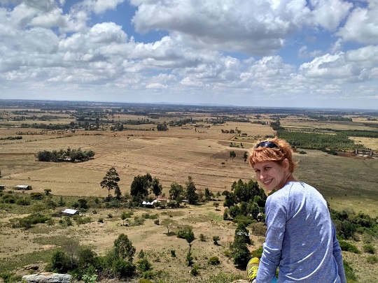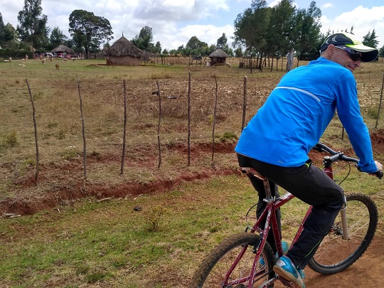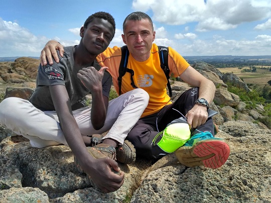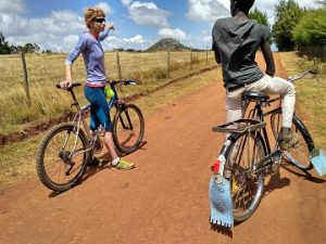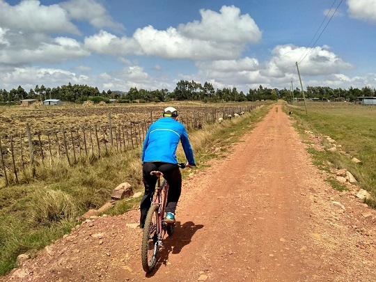 Ruszyliśmy dalej, wciąż mocno z góry. Naszą górę było coraz lepiej widać, zjechaliśmy więc z asfaltu na tzw. dirty road, czyli czerwoną gruntową drogę. U nas te drogi są czarne, szare, tu ciemno pomarańczowe, ceglane. Komfort jazdy się obniżył, drogą była nierówna, naszpikowana kamieniami. Zaczynałam czuć tyłek na wybojach. Jak zwykle dzieciaki wybiegały ze swoich obejść krzycząc mzungu i chcąc podać nam ręce. Wśród nich był starszy chłopak na rowerze. Miał na imię Kevin. Zapytał dokąd jedziemy. Jak usłyszał, że na górę, to powiedział, że nas tam zaprowadzi. Zaczynaliśmy się obawiać czy na pewno wie, gdzie chcemy dojechać, bo coraz bardziej oddalaliśmy się od wzniesienia. Stwierdził, że musimy wyjechać znowu na asfaltową drogę, bo tędy nie dojedziemy. Zaufaliśmy mu. Po drodze opowiadał nam o tym, że chciałby studiować na Uniwersytecie w Nairobi, na kierunku związanym z odnawialnymi źródłami energii. Był bardzo bystry i inteligentny, dobrze znał angielski. Jak usłyszał, że jesteśmy z Polski, od razu skojarzył Warszawę, Roberta Lewandowskiego i Piszczka.