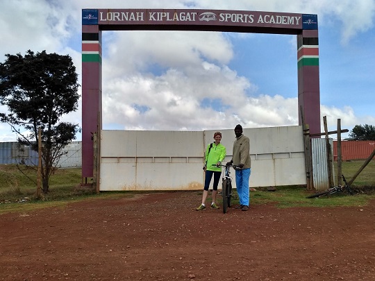 Na dziś zaplanowaliśmy rowerowy rekonesans okolicy. Od ubiegłego roku intrygowała nas góra, którą widać w połowie drogi z Eldoret do Iten, po lewej stronie. Na jej szczycie stoi maszt telefonii komórkowej. Umówiliśmy się z chłopakami od rowerów, że jak nie będzie dziś padać, to mają nam podstawić do hotelu na 10 rano dwa sprawne rowery. Rano poszłam pobiegać. Zrobiłam sobie 60 minut easy, po czerwonej ścieżce wzdłuż głównej drogi. Dziś jest niedziela i dużo mniejszy ruch panował z rana. Pogoda była kiepska, zimno i pochmurno. Ale dziewczyny w hotelu powiedziały, że z tych chmur deszczu nie będzie. One potrafią naprawdę trafnie odczytywać pogodę. Potwierdziliśmy więc wynajem rowerów i ruszyliśmy asfaltem w kierunku naszego celu. Iten leży na sporym wzniesieniu. Yacool zaczął rozwijać niebotyczne prędkości, wyprzedzając matatu, dodatkowo mieliśmy wiatr w plecy. Ja kurczowo trzymałam ręce na hamulcach. Zatrzymaliśmy się na moment przy stadionie Lorny Kiplagat. Niestety brama była zamknięta, a pilnujący jej strażnik tylko na chwilę pozwolił nam wejść za nią. Yacool nauczył się powitania w języku kalenjin i tym rozbraja spotykanych Kenijczyków i bardzo ich sobie zjednuje.