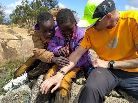 Z miejsca, w którym siedzieliśmy widać było Eldoret. Kevin mówił, że przy dobrej pogodzie widać stąd Mount Elgon, czyli granicę z Ugandą. Widać też było wzgórza, na których leży Iten i jeszcze wyżej położony region Marakwet, z wyraźnie zaznaczonymi górami. Szkoda tylko, że nie mieliśmy ze sobą lornetki. Przyszło do nas jeszcze dwóch chłopców i chyba ich tata w czerwonej czapce świętego Mikołaja. Dzieciaki przyglądały się ze zdziwieniem Jacka włosom na rękach.