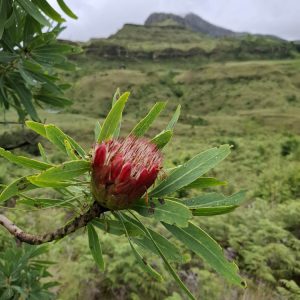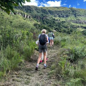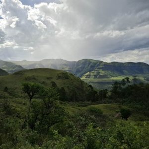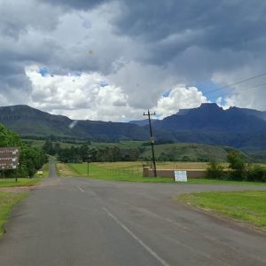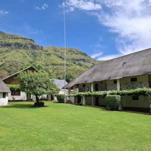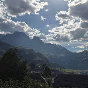 Po południu dotarliśmy do Drakensberg, czyli po naszemu w Góry Smocze. Tym razem okazały się dość kapryśne pogodowo. Po przyjeździe i lunchu postanowiliśmy iść na spacer, bo prognozy na kolejny dzień nie były zbyt optymistyczne. Zrobiliśmy całkiem fajną trasę z ładnymi widokami. A gdy wróciliśmy do naszego hotelu, wyszło piękne słońce. Wskoczyliśmy więc w kostiumy kąpielowe i z przyjemnością znaleźliśmy się na leżakach przy basenie. Przed nami mieliśmy piękną panoramę, z jednym z najwyższych szczytów – Giant Castle (3315 m n.p.m.).