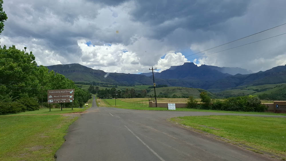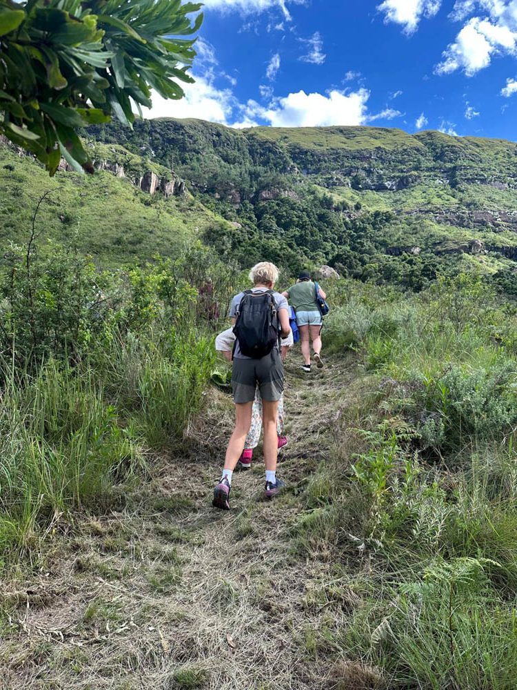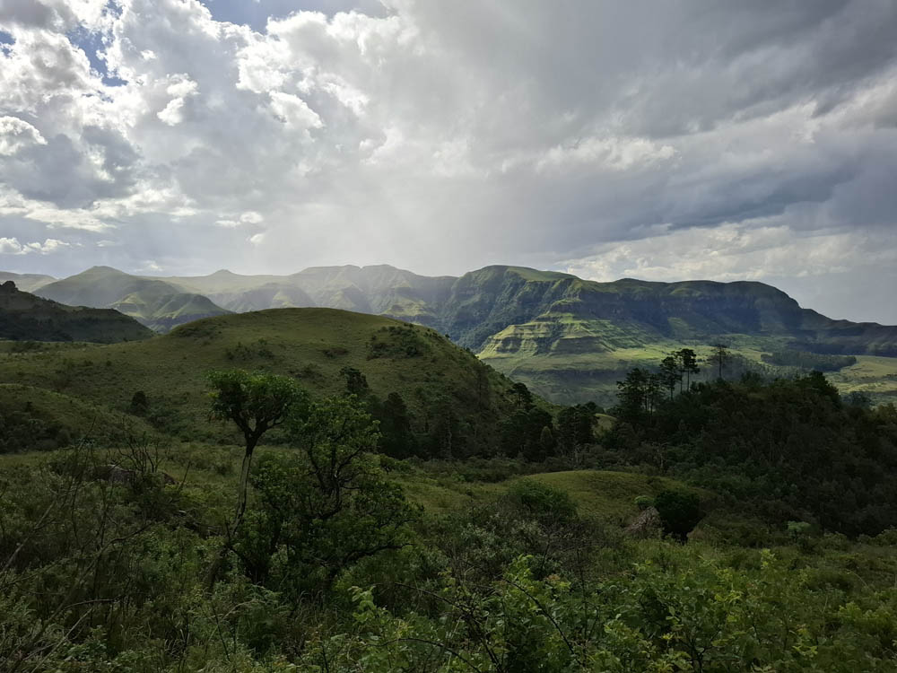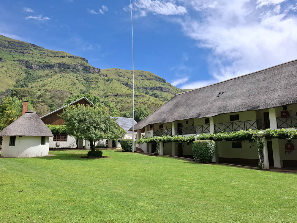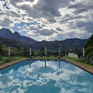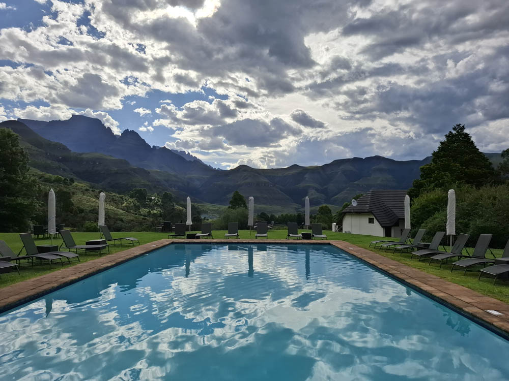 Po południu dotarliśmy do Drakensberg, czyli po naszemu w Góry Smocze. Tym razem okazały się dość kapryśne pogodowo. Po przyjeździe i lunchu postanowiliśmy iść na spacer, bo prognozy na kolejny dzień nie były zbyt optymistyczne. Zrobiliśmy całkiem fajną trasę z ładnymi widokami. A gdy wróciliśmy do naszego hotelu, wyszło piękne słońce. Wskoczyliśmy więc w kostiumy kąpielowe i z przyjemnością znaleźliśmy się na leżakach przy basenie. Przed nami mieliśmy piękną panoramę, z jednym z najwyższych szczytów – Giant Castle (3315 m n.p.m.).