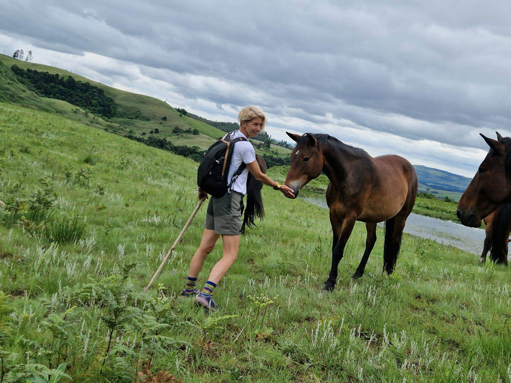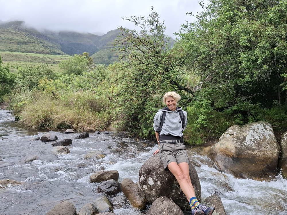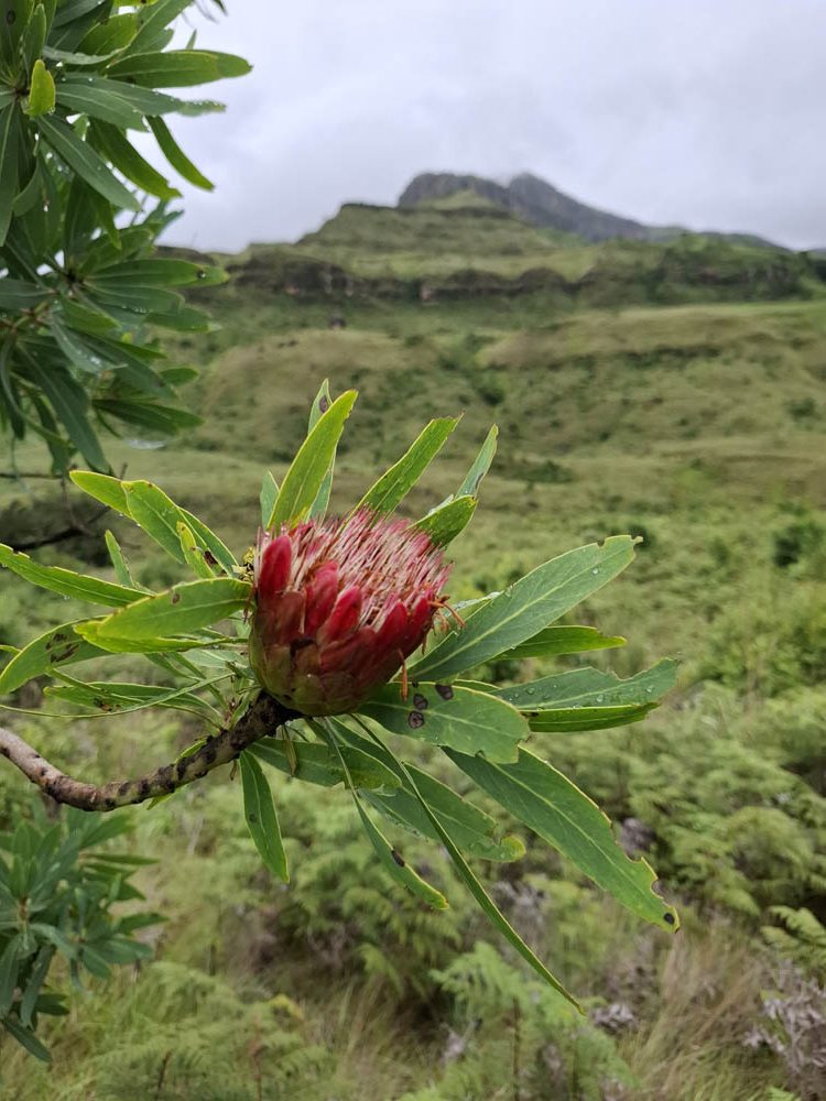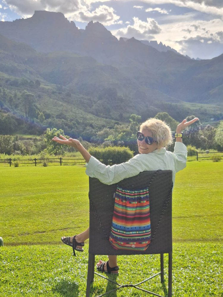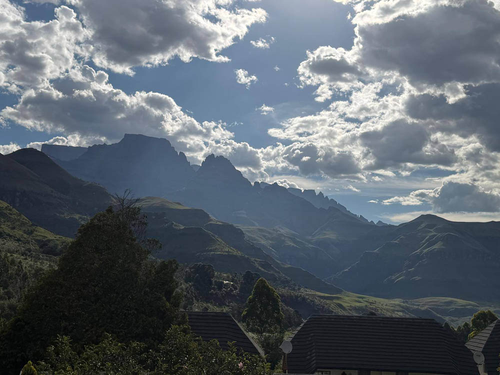 Po południu dotarliśmy do Drakensberg, czyli po naszemu w Góry Smocze. Tym razem okazały się dość kapryśne pogodowo. Po przyjeździe i lunchu postanowiliśmy iść na spacer, bo prognozy na kolejny dzień nie były zbyt optymistyczne. Zrobiliśmy całkiem fajną trasę z ładnymi widokami. A gdy wróciliśmy do naszego hotelu, wyszło piękne słońce. Wskoczyliśmy więc w kostiumy kąpielowe i z przyjemnością znaleźliśmy się na leżakach przy basenie. Przed nami mieliśmy piękną panoramę, z jednym z najwyższych szczytów – Giant Castle (3315 m n.p.m.).